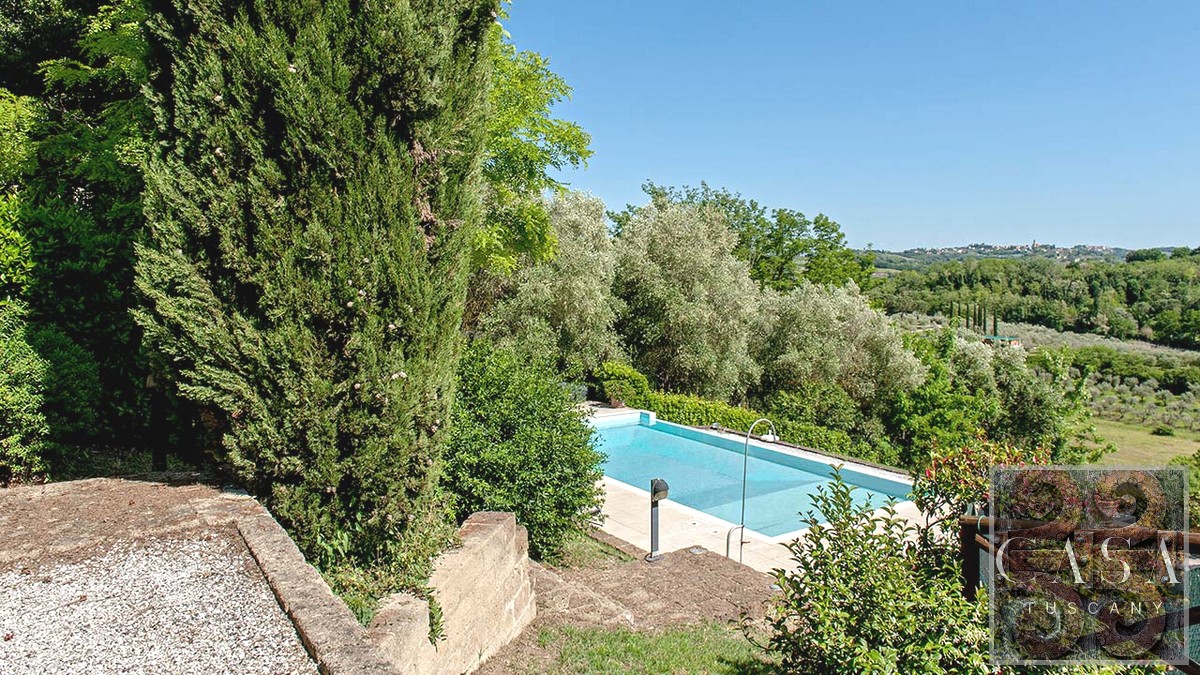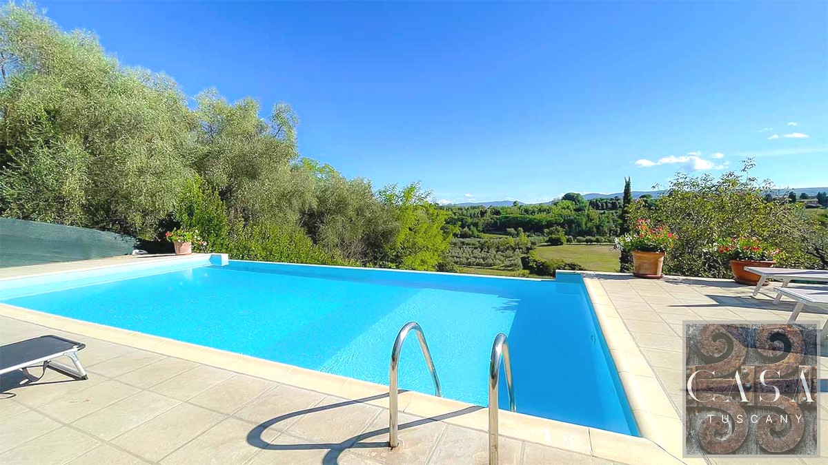 The communal infinity swimming pool offers breathtaking views of the surrounding Tuscan hills and a tranquil setting. This communal area is perfect for relaxing and enjoying the scenery.