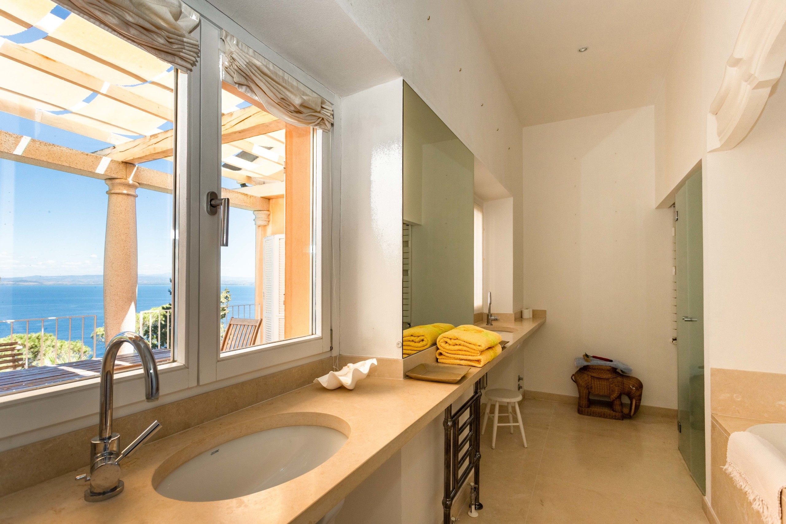 From the living room it is possible to access the adjacent tower which maintains its unaltered charm, with the external walls still in the old stone. Here there are 2 more double bedrooms arranged vertically, one on top of the other and 2 bathrooms, and on top of the tower the magnificent terrace from which you can enjoy a breathtaking 180 ° view of the blue of the sea and the sky.