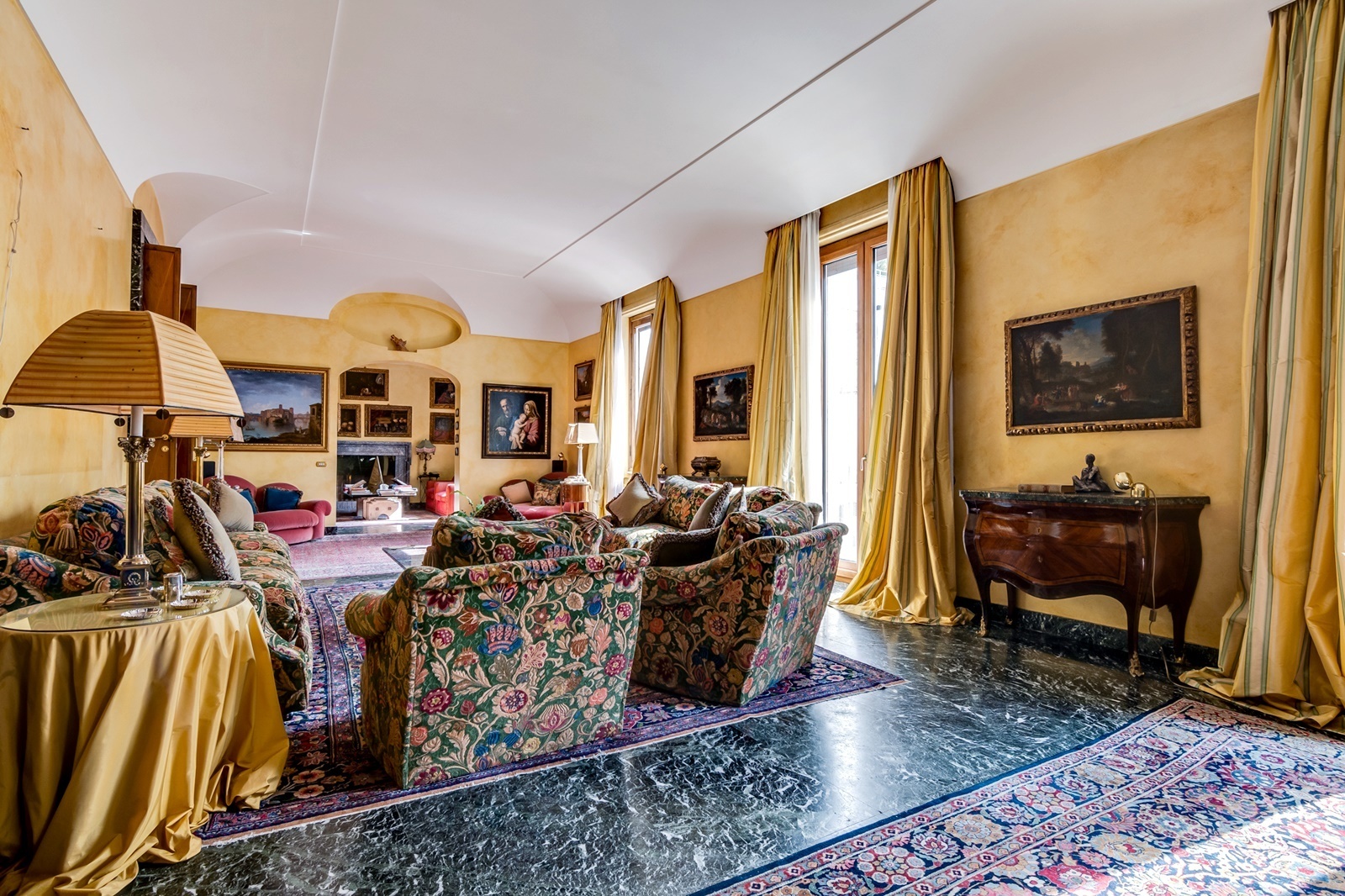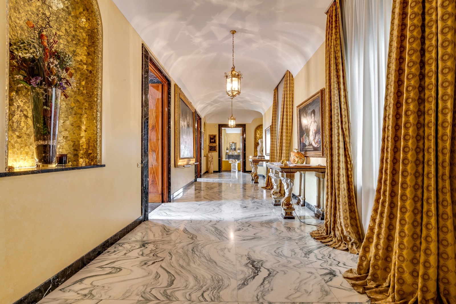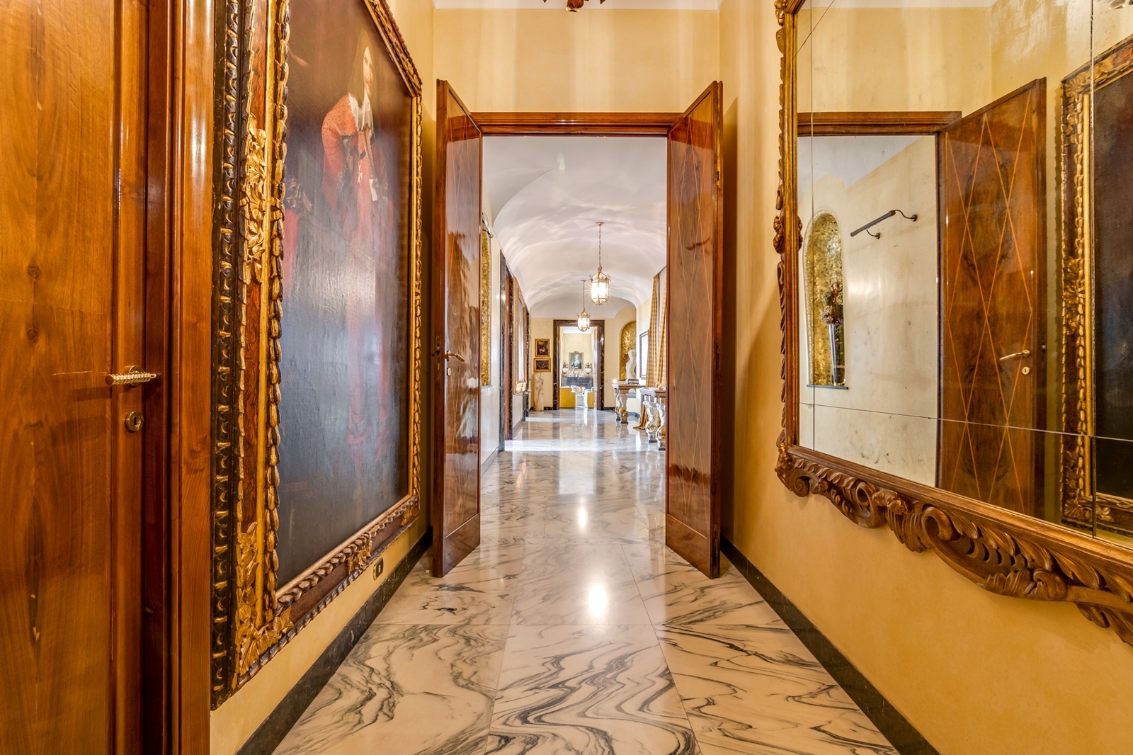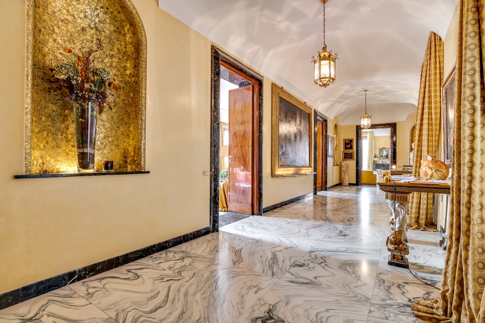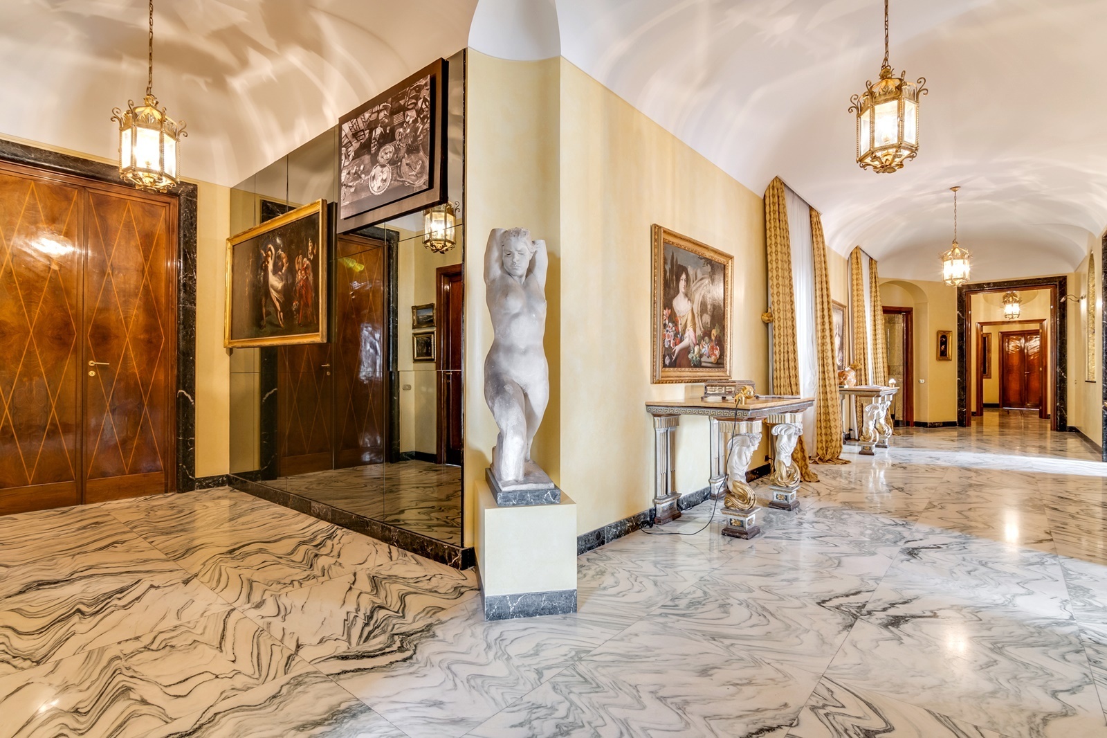 The impressive halls further enhance the apartment, ideal for welcoming prestigious guests. There is a fireplace, a piano, exclusive ancient paintings and sculptures in the corridors.