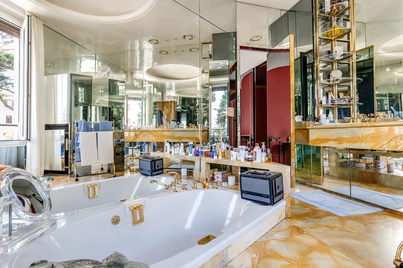 The master suite is bright and impressive, has a king size bed, a terrace with a pleasant view of the private garden of a Villa. The en-suite bathroom is in yellow Siena marble, and has a sauna, a bathtub, a shower, two sinks as well as a toilet and bidet. There are dressing rooms serving the master suite; one of which is also used as a gym.