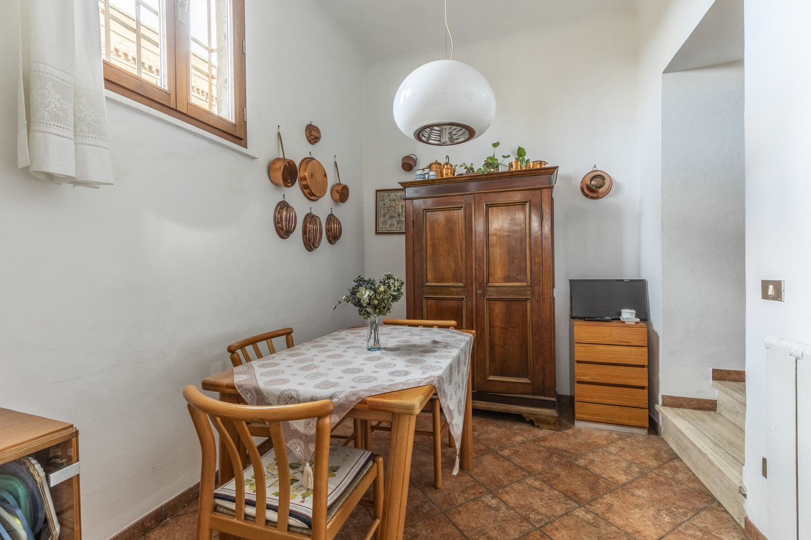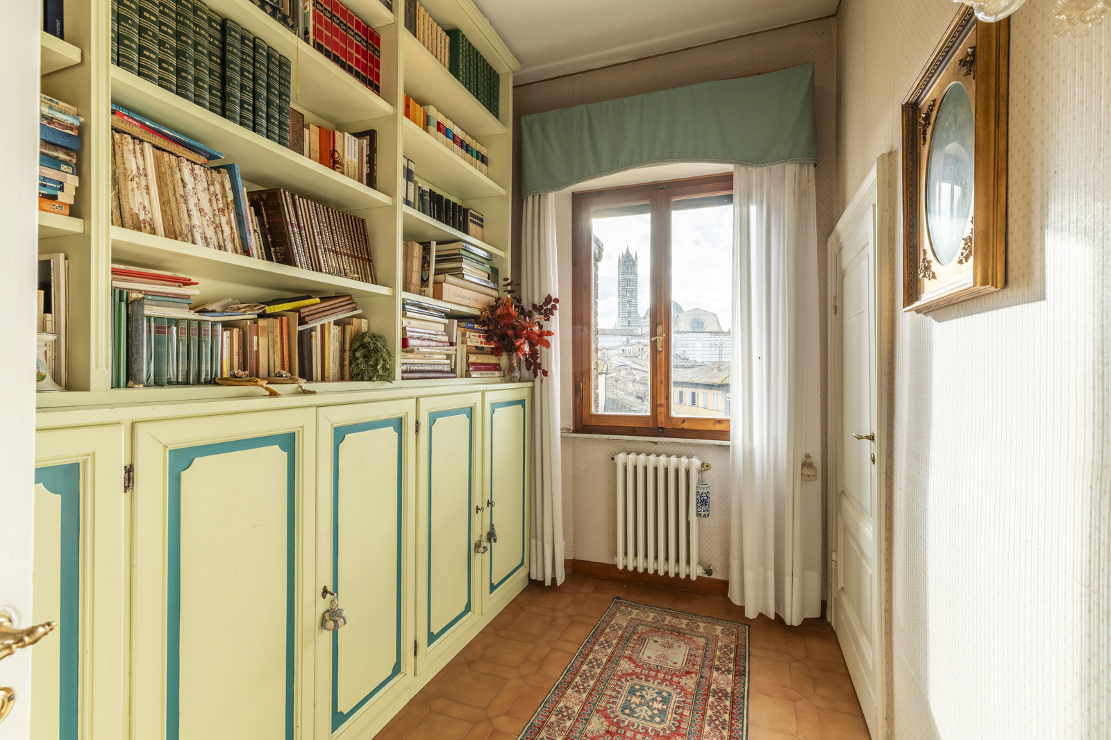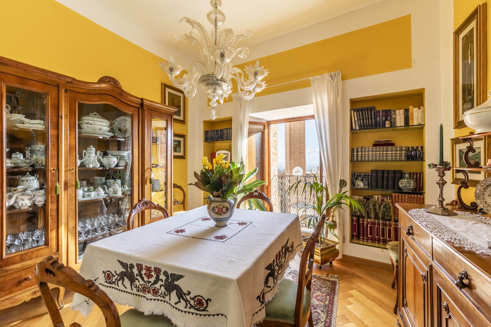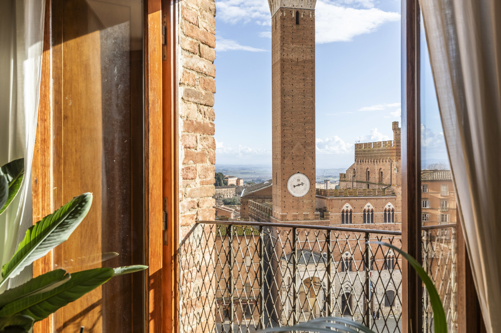 The property is accessed by a perfectly preserved terracotta staircase, with double entrance from a wooden door to a stained glass door, there is access into the living room where, through the central window there is a first view of the square and the Torre del Mangia, symbol of the city.