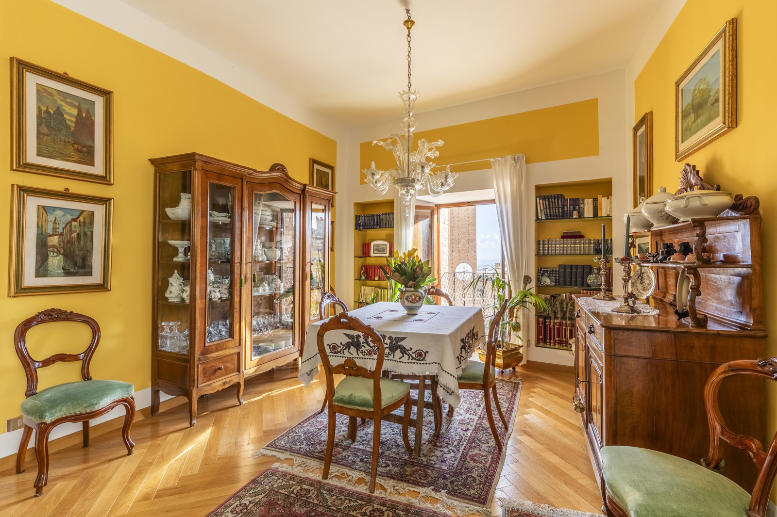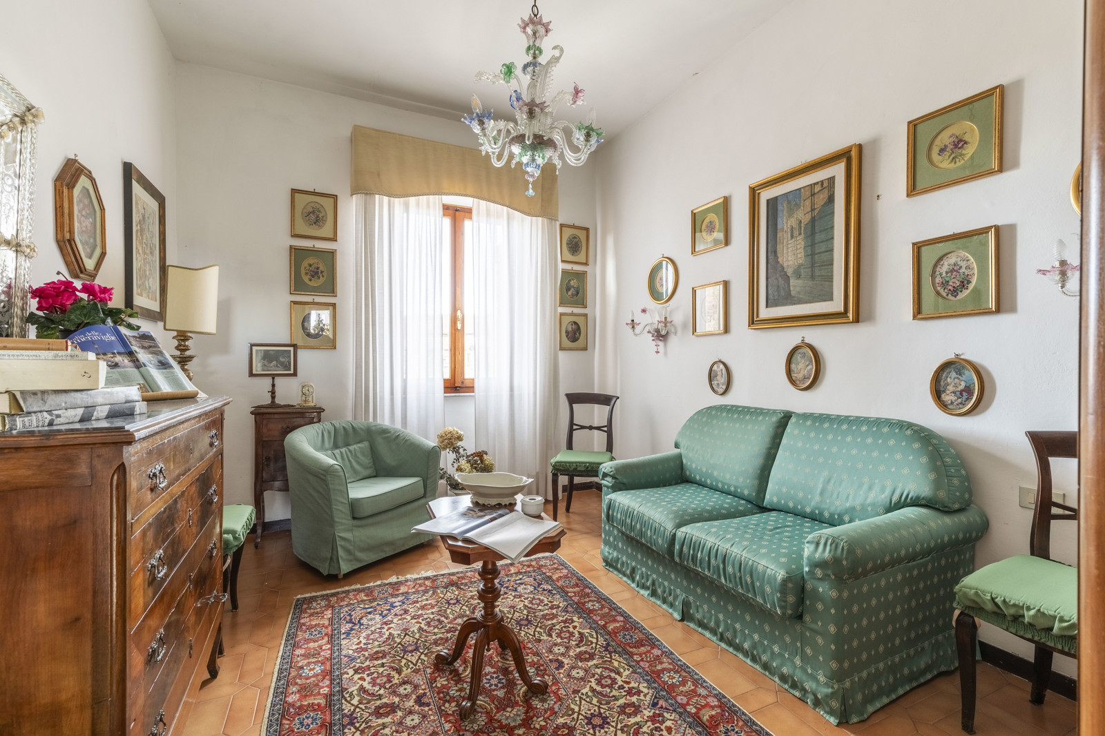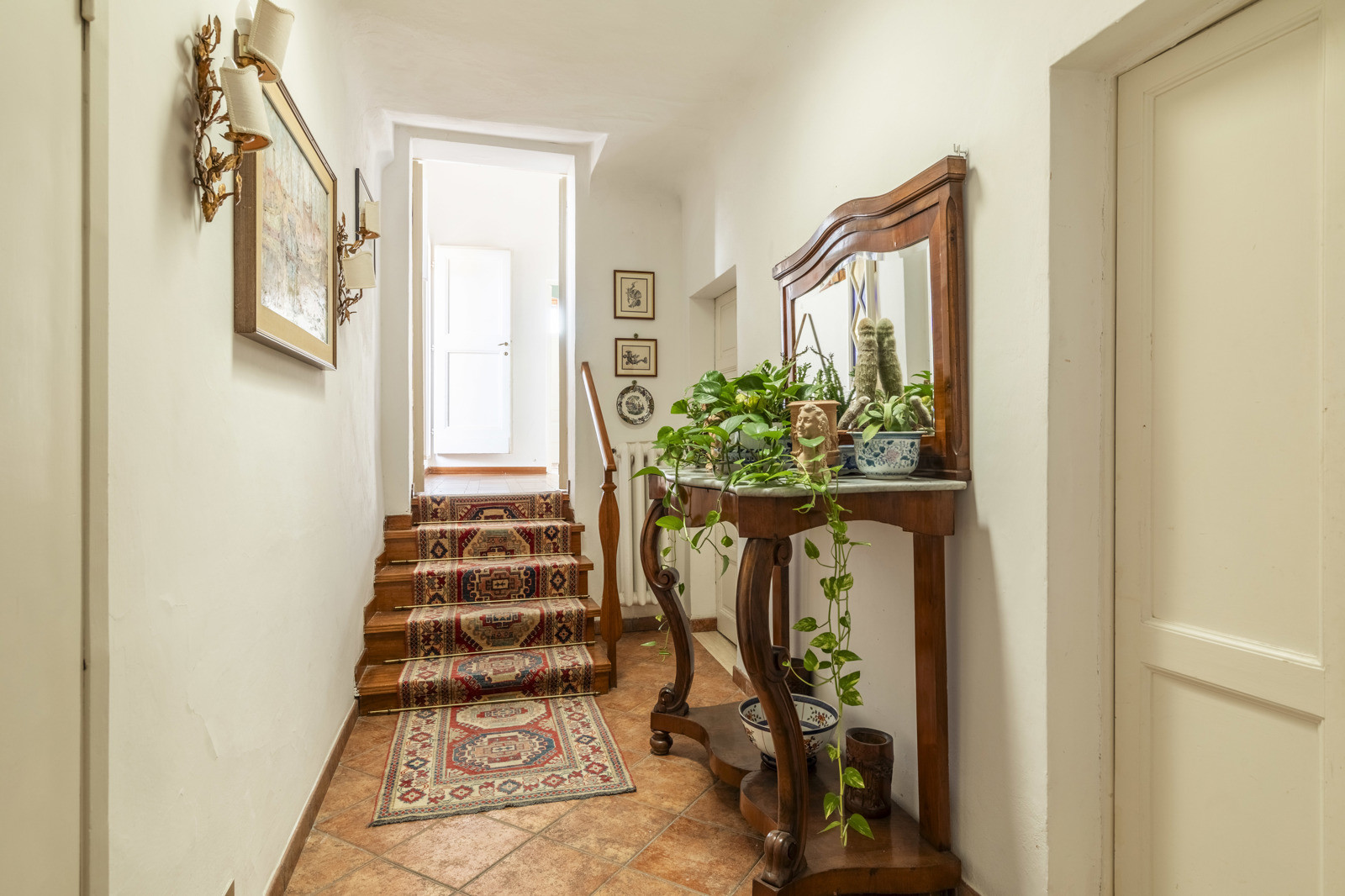 The property is accessed by a perfectly preserved terracotta staircase, with double entrance from a wooden door to a stained glass door, there is access into the living room where, through the central window there is a first view of the square and the Torre del Mangia, symbol of the city.