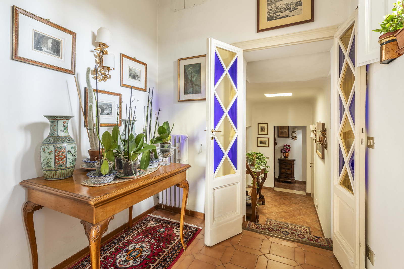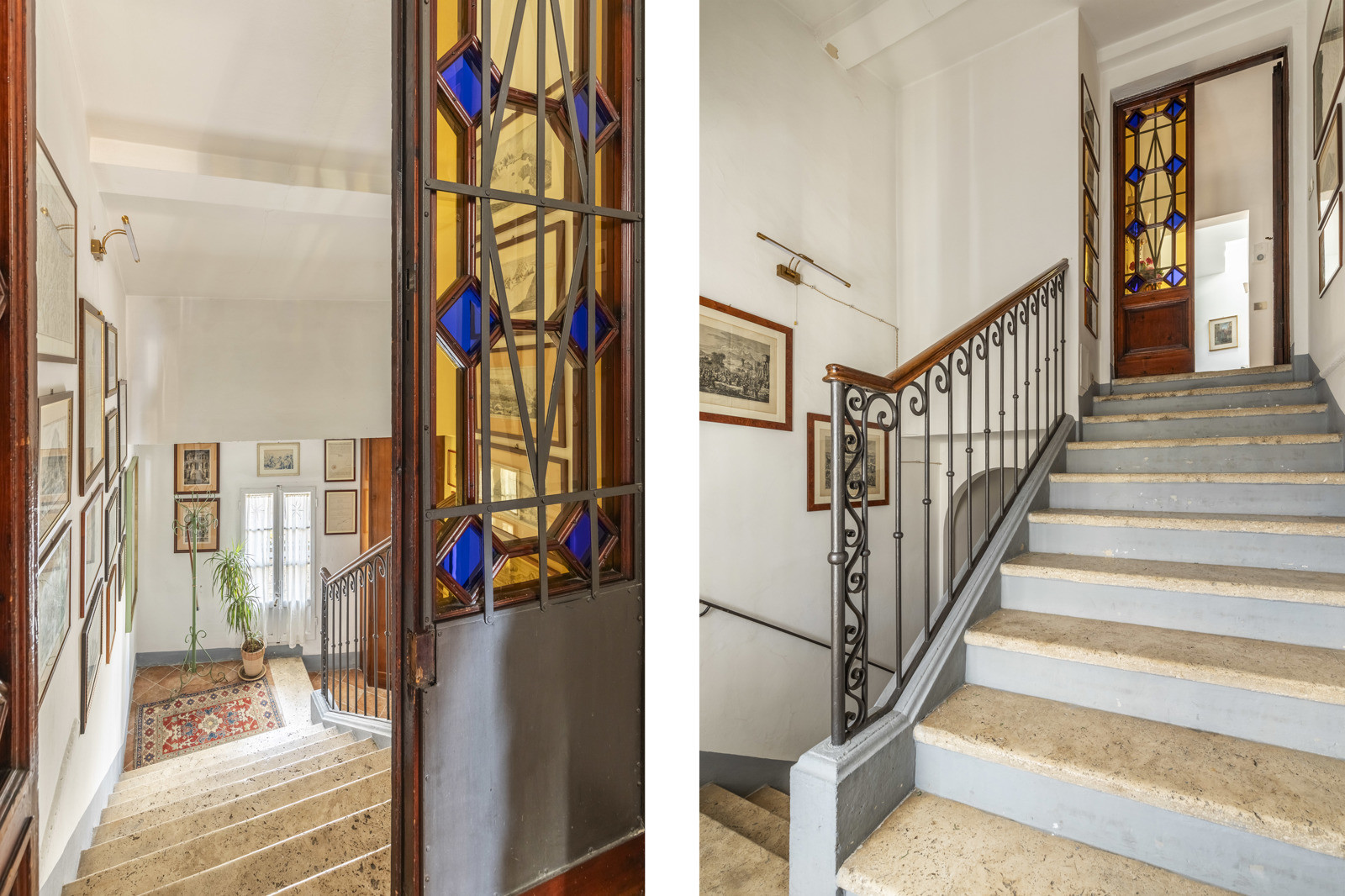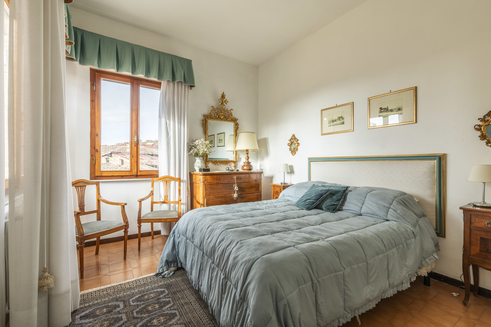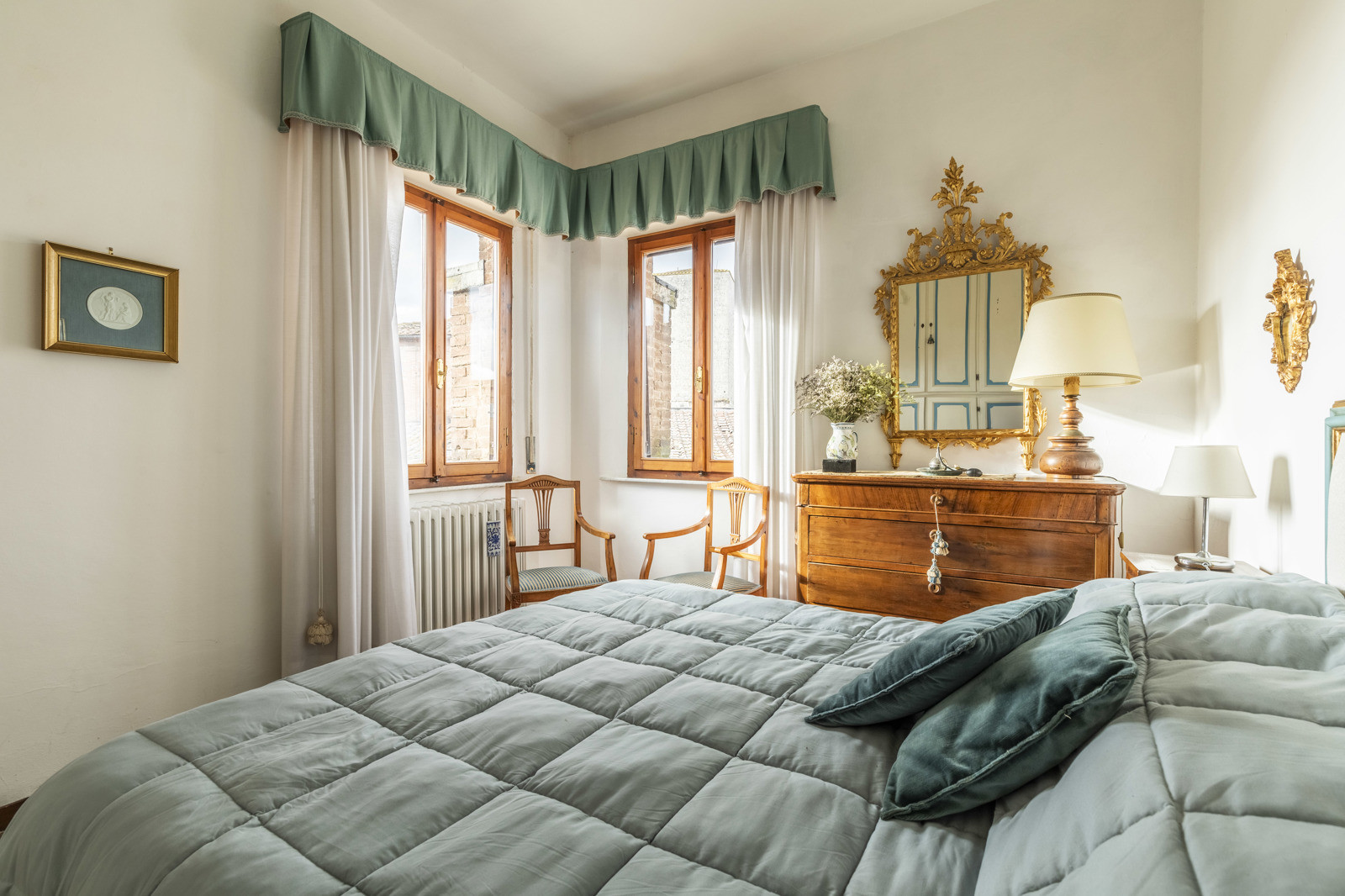 The property is accessed by a perfectly preserved terracotta staircase, with double entrance from a wooden door to a stained glass door, there is access into the living room where, through the central window there is a first view of the square and the Torre del Mangia, symbol of the city.