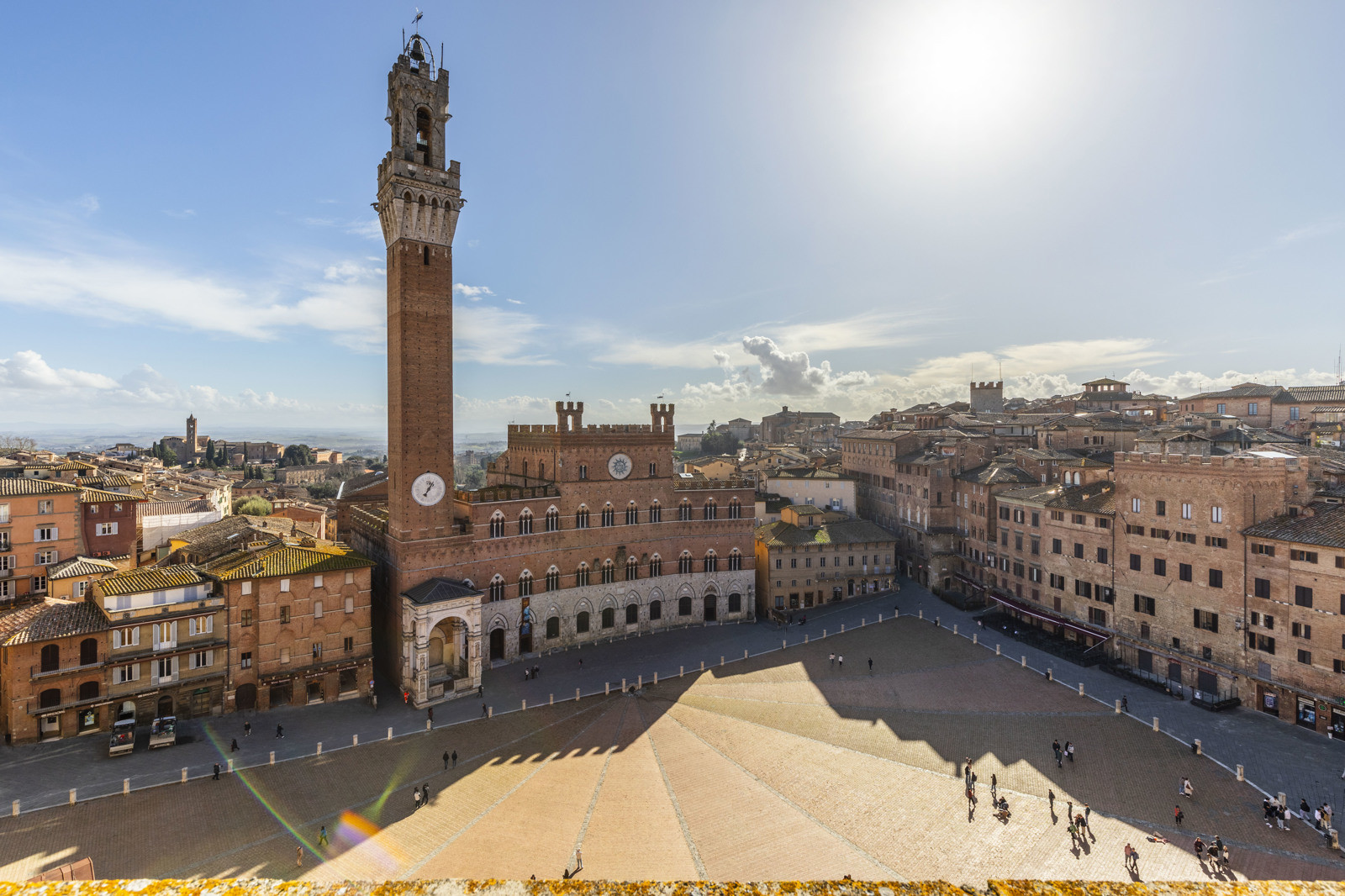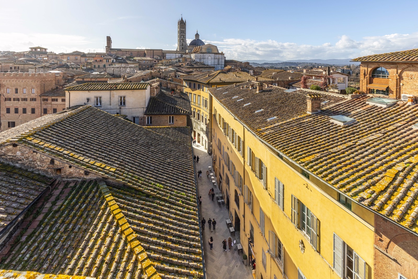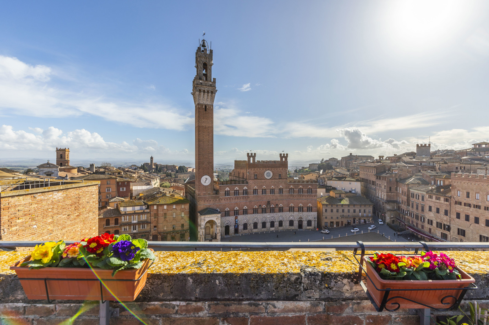 There are two beautiful panoramic terraces, overlooking the city and providing breathtaking views of the surrounding countryside, from the Val di Merse, Chianti to the Val d’Orcia with Monte Amiata and Monte Cetona in the background. There are unique views of monuments such as the Duomo and the Torre del Mangia as well as the famous red roofs of the city of Siena. The first terrace is excellent for dinners, aperitifs and exclusive events, and the second offers a privileged view of the main piazza especially during the world’s most famous horse race, the Palio. The exterior is typical of stone palazzi of the Middle Ages, with imposing and at the same time elegant structures.