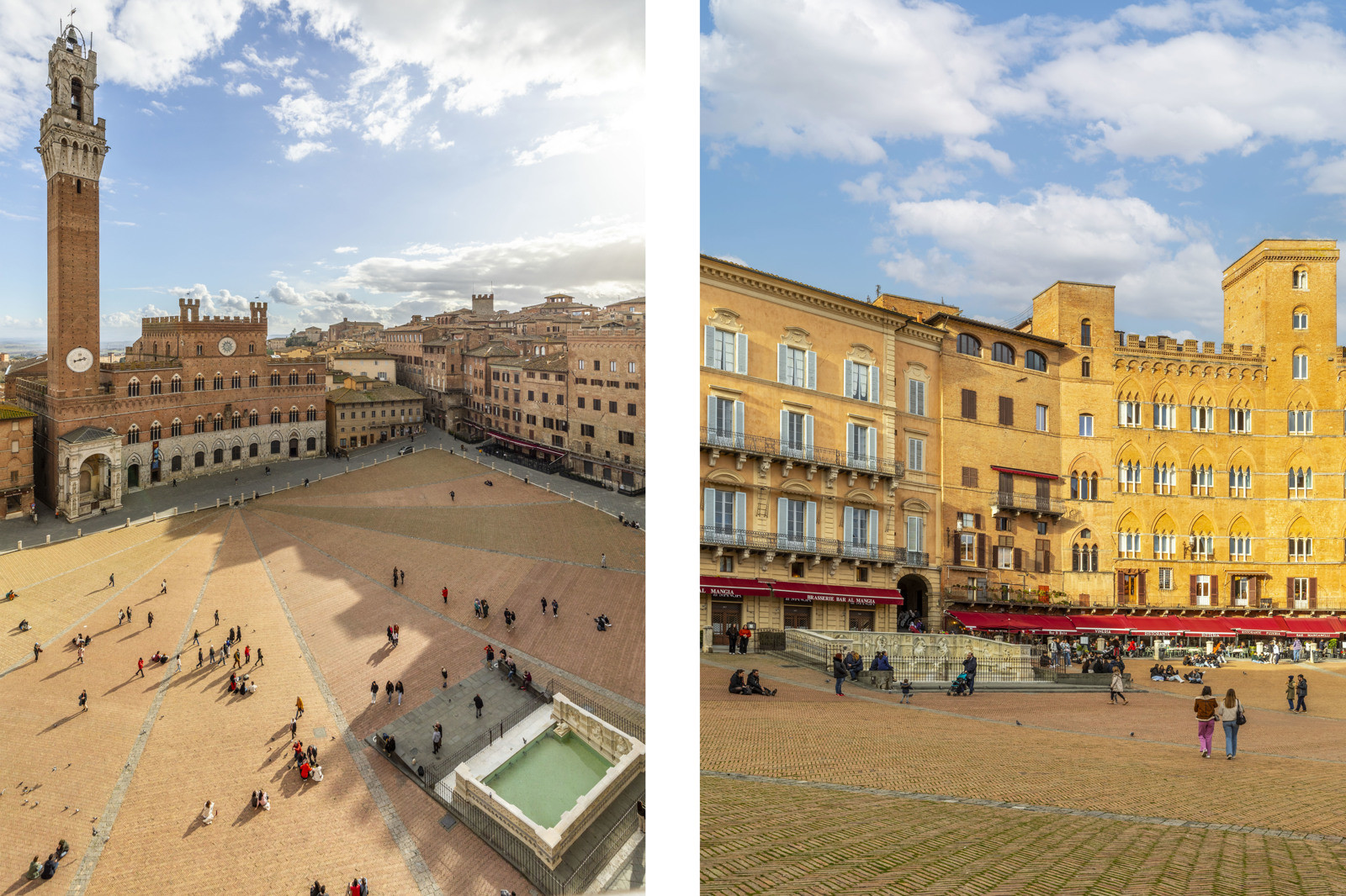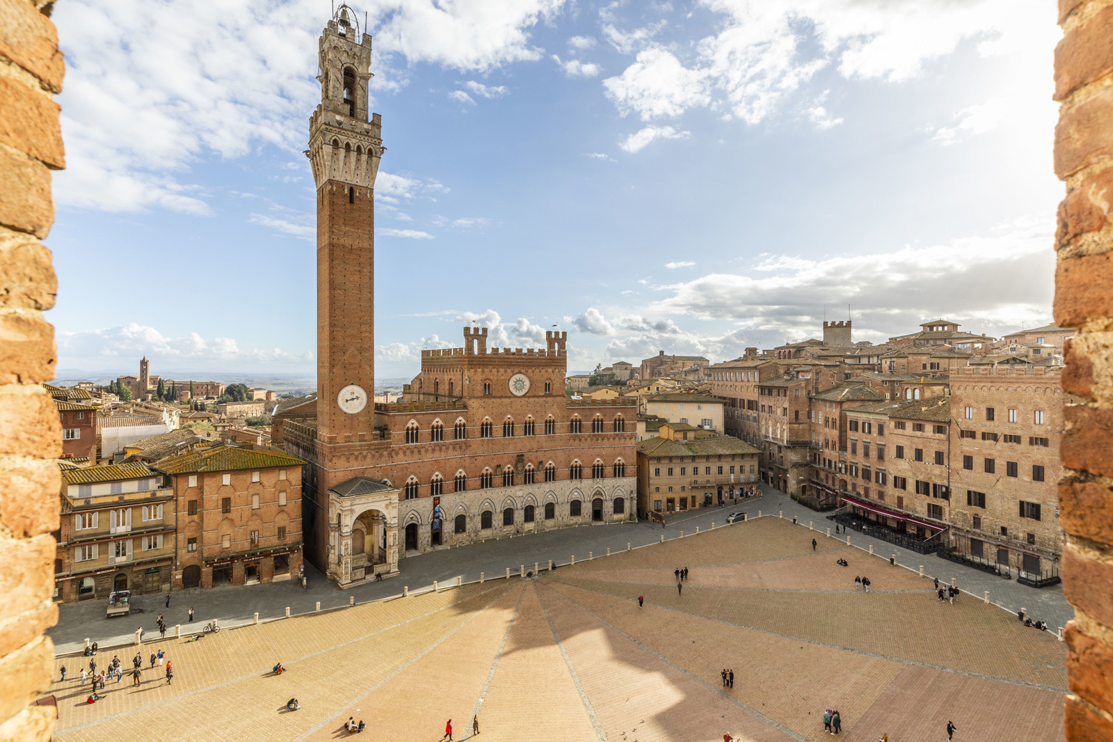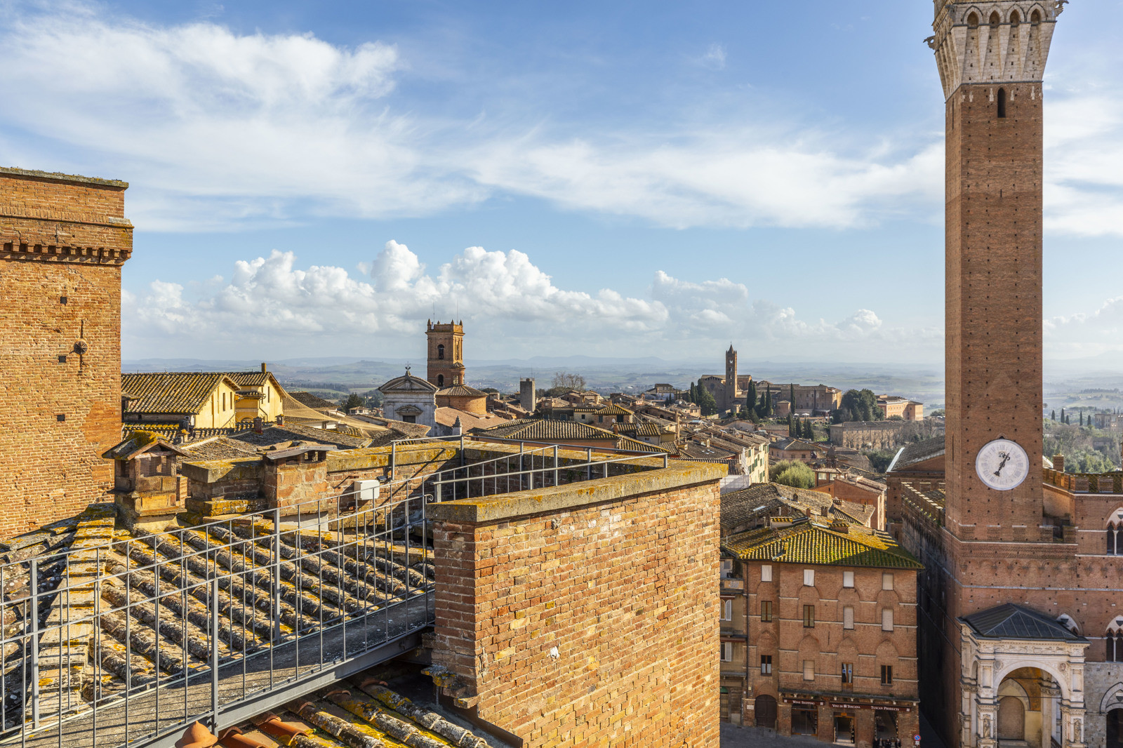 There are two beautiful panoramic terraces, overlooking the city and providing breathtaking views of the surrounding countryside, from the Val di Merse, Chianti to the Val d’Orcia with Monte Amiata and Monte Cetona in the background. There are unique views of monuments such as the Duomo and the Torre del Mangia as well as the famous red roofs of the city of Siena. The first terrace is excellent for dinners, aperitifs and exclusive events, and the second offers a privileged view of the main piazza especially during the world’s most famous horse race, the Palio. The exterior is typical of stone palazzi of the Middle Ages, with imposing and at the same time elegant structures.