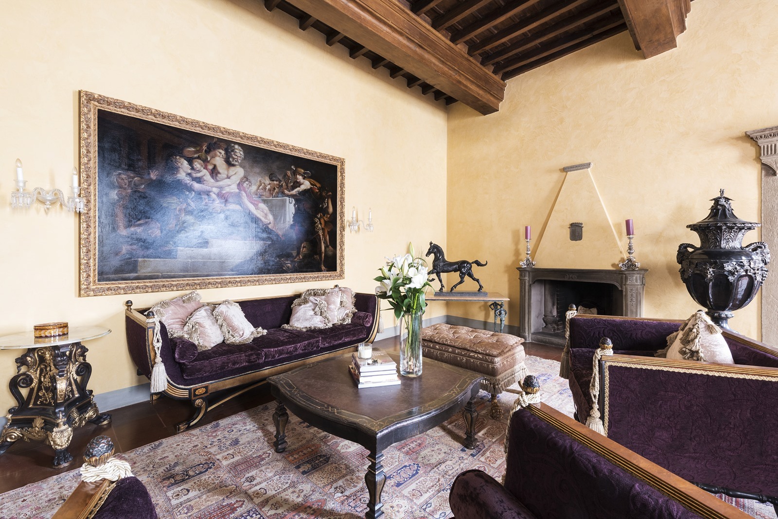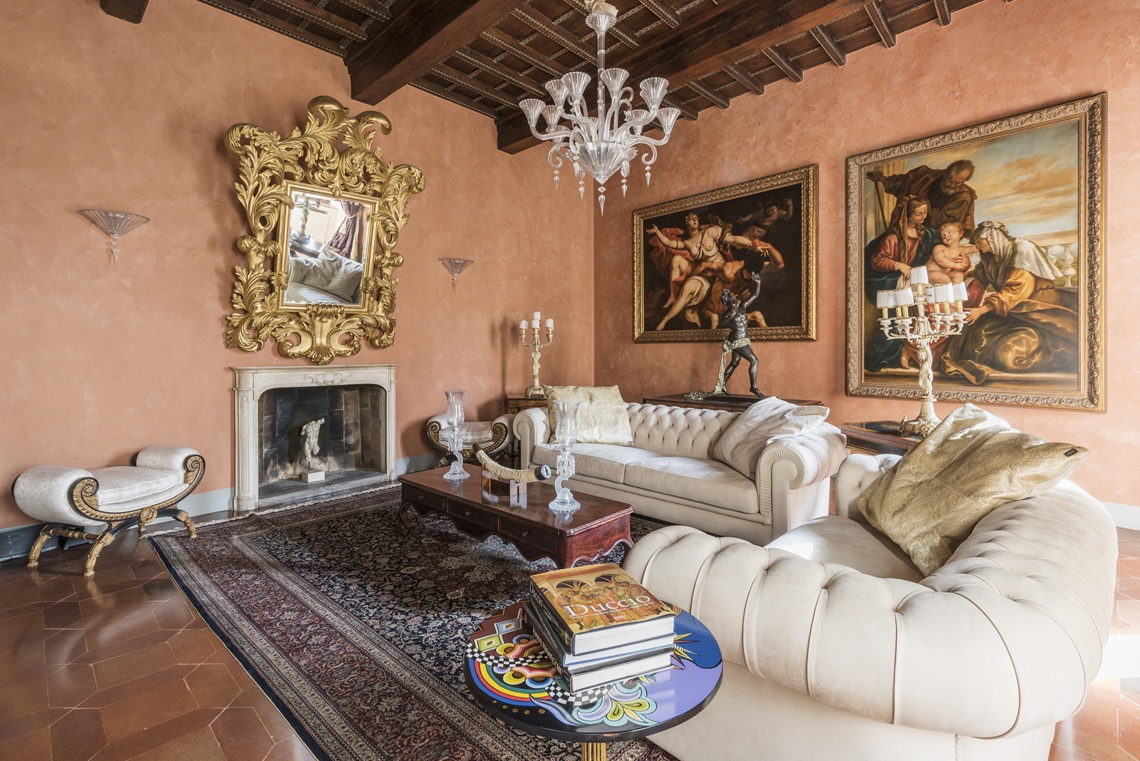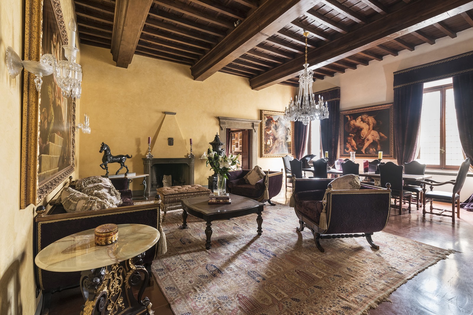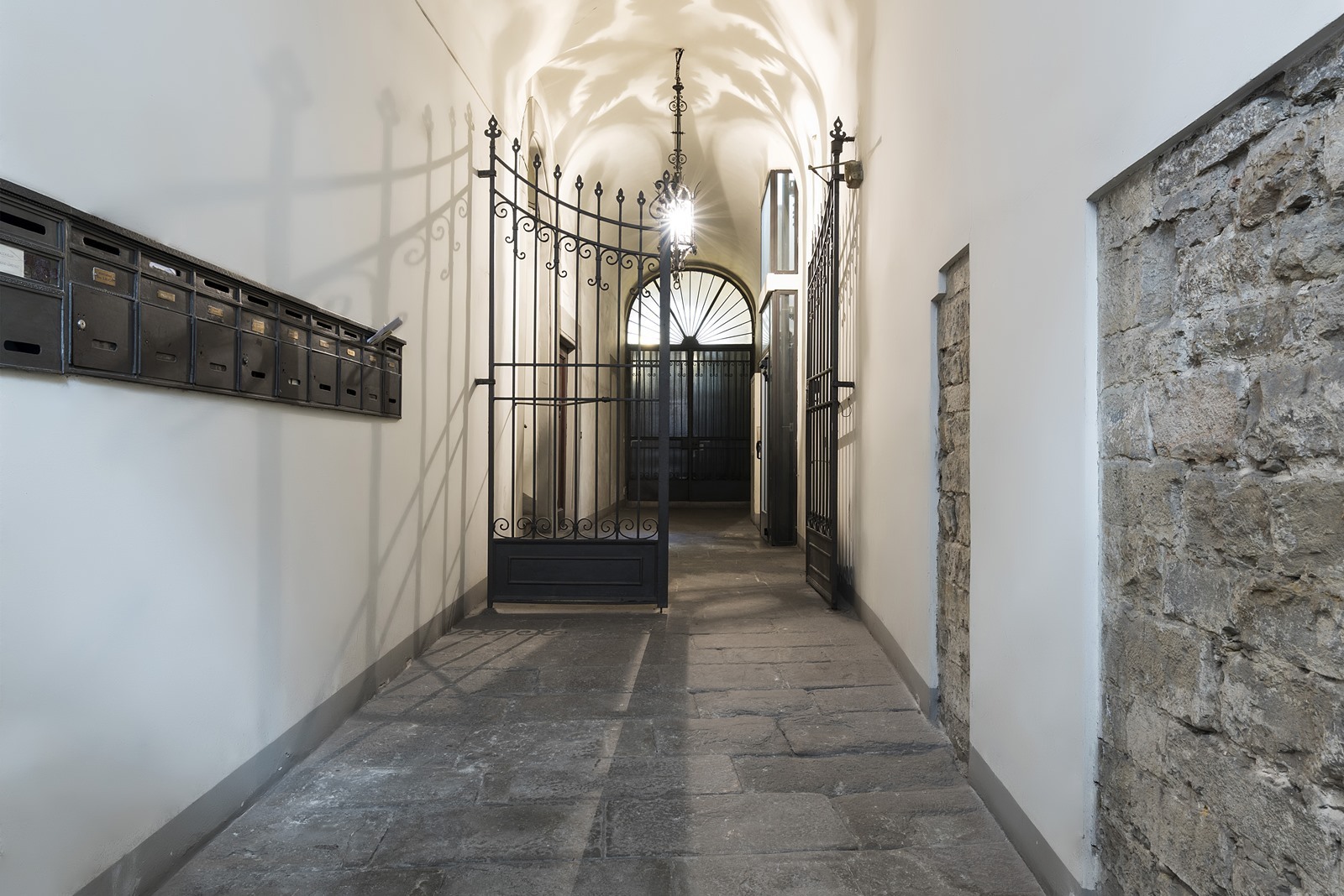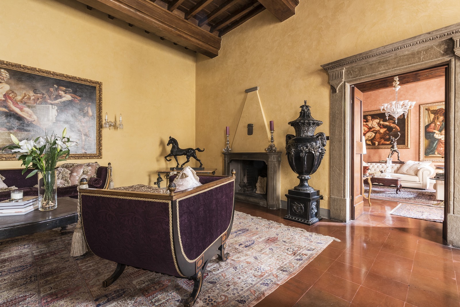 An elegant entrance leads to the large living and dining area with fireplace and views of the famous and prestigious streets of the city’s Oltrarno.