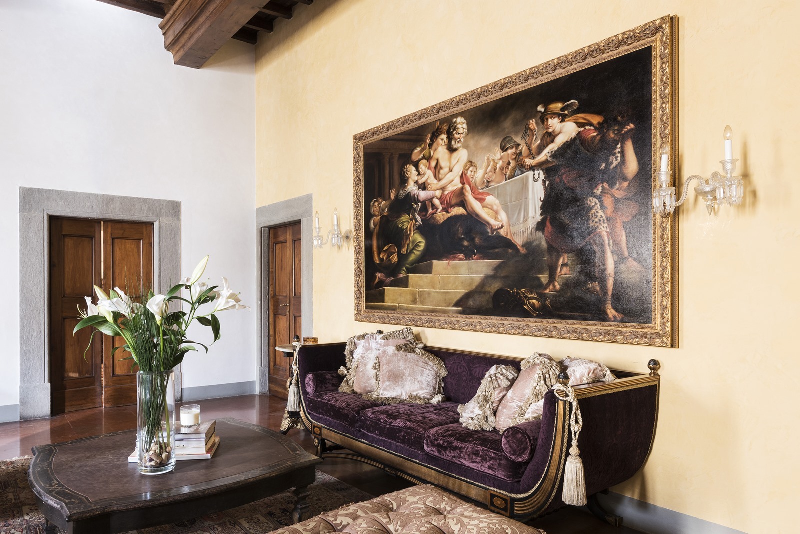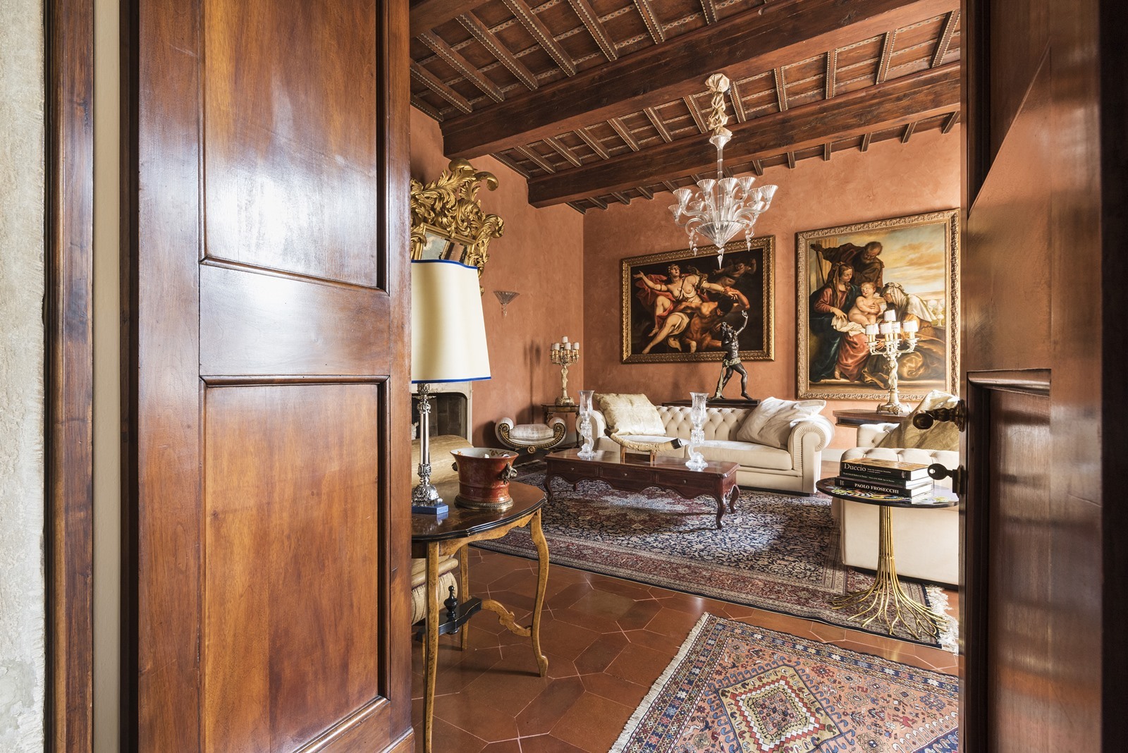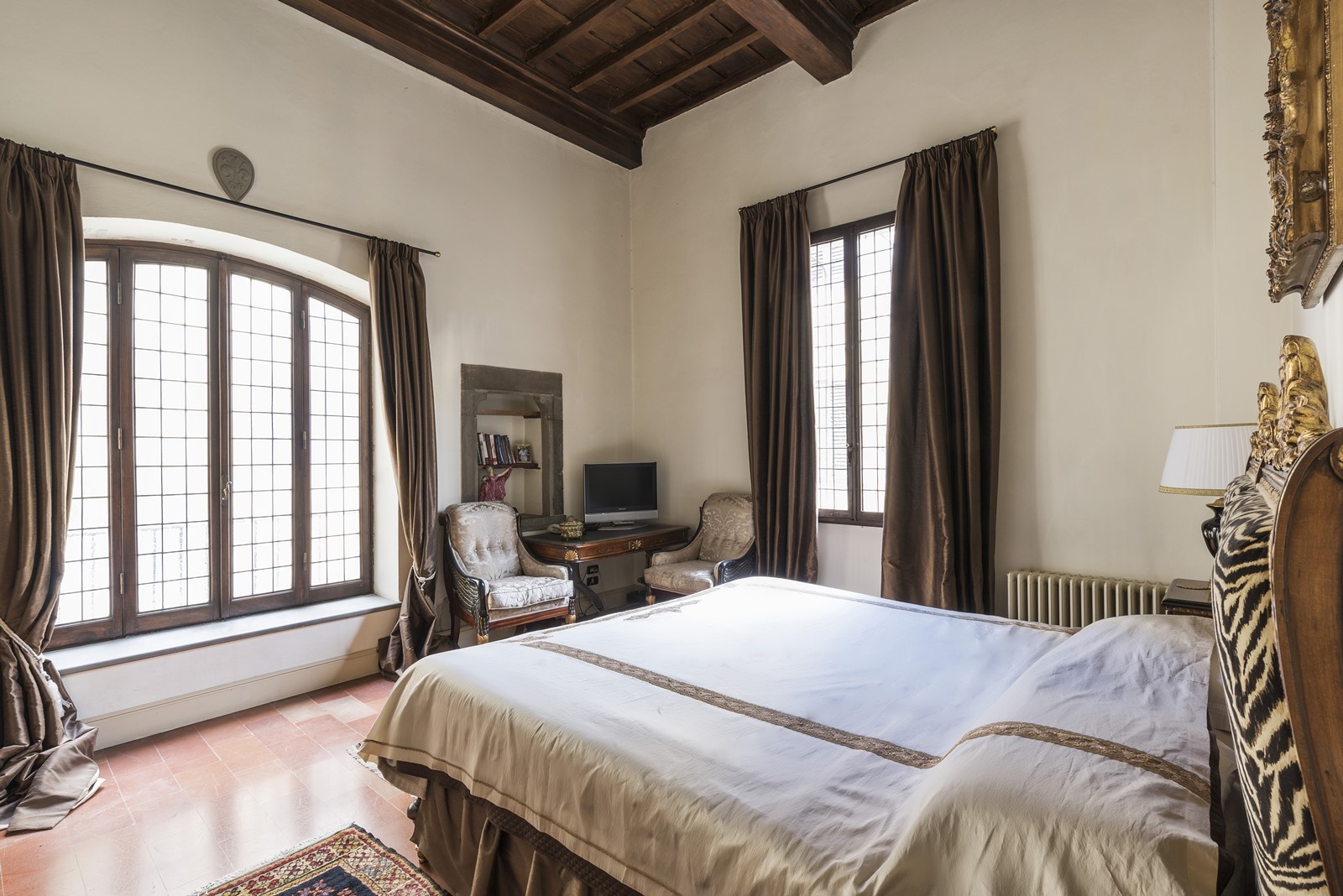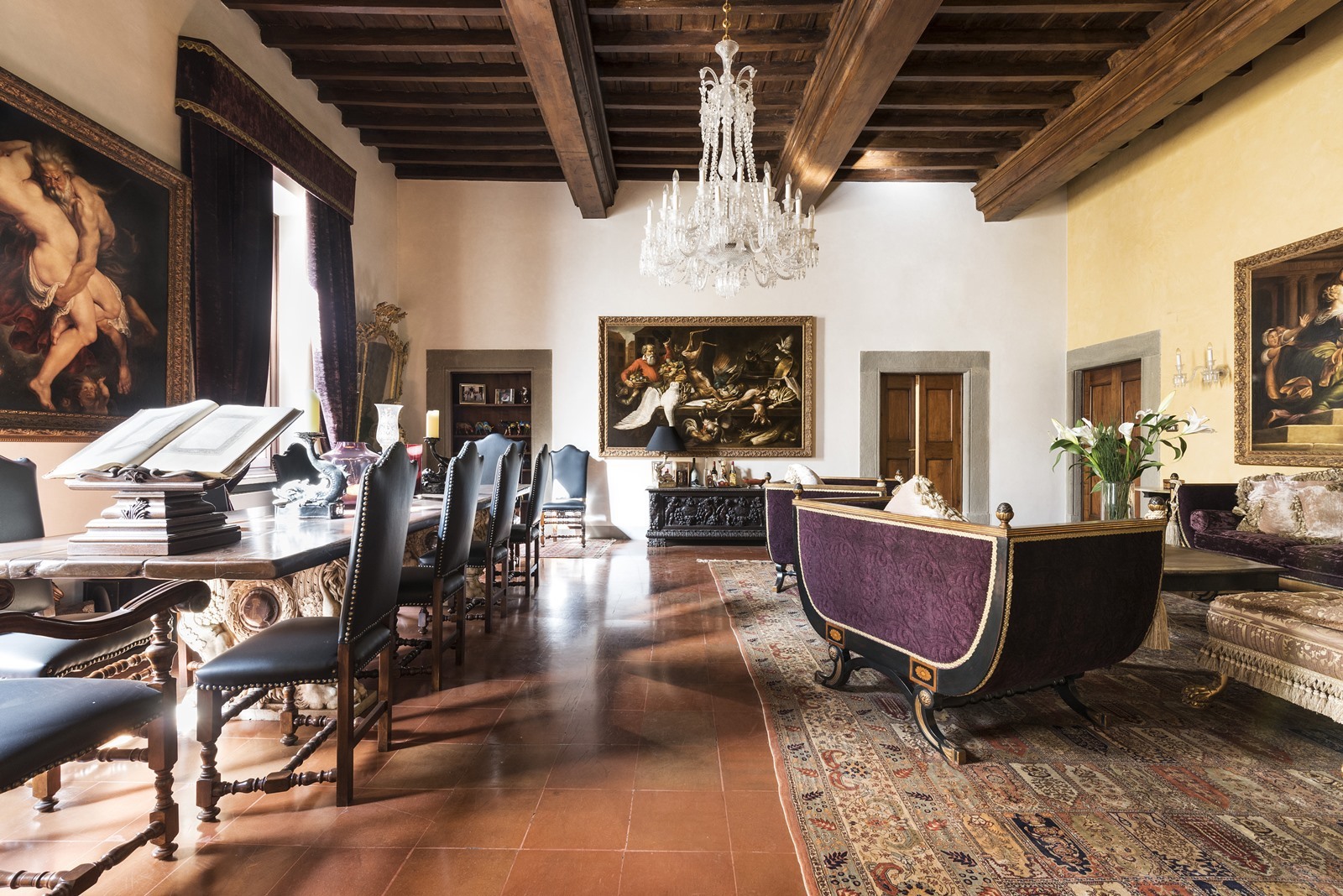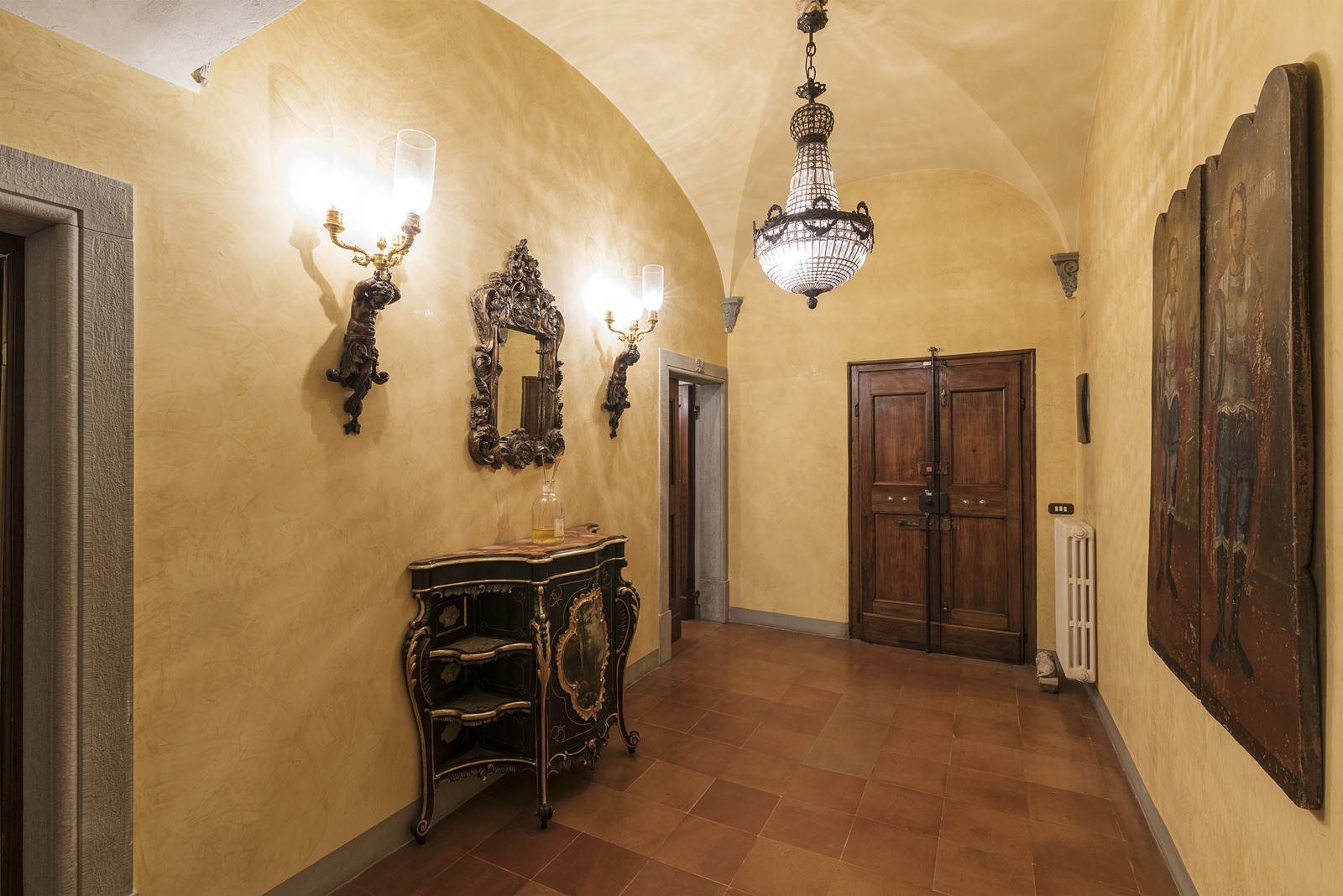 An elegant entrance leads to the large living and dining area with fireplace and views of the famous and prestigious streets of the city’s Oltrarno.