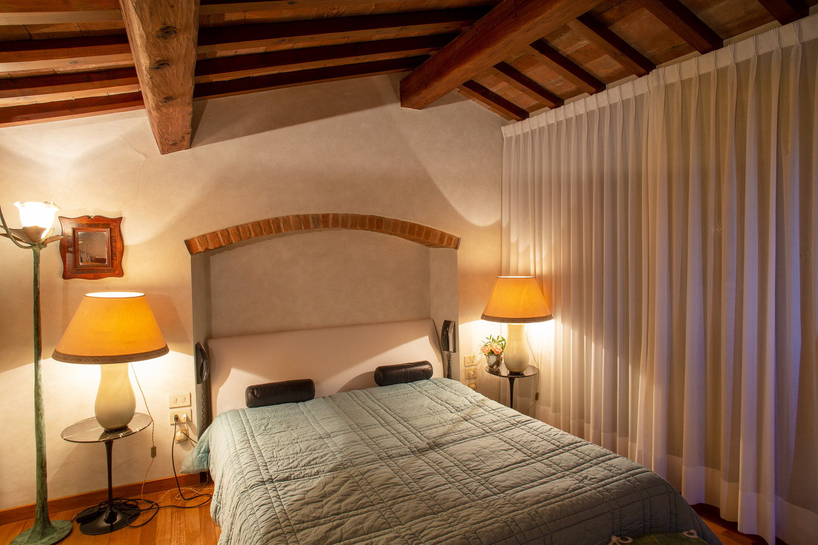 The upper floor houses the sleeping area with five decorated bedrooms with en suite bathrooms, including a principal bedroom, in addition to the large loggia and an independent guest apartment.