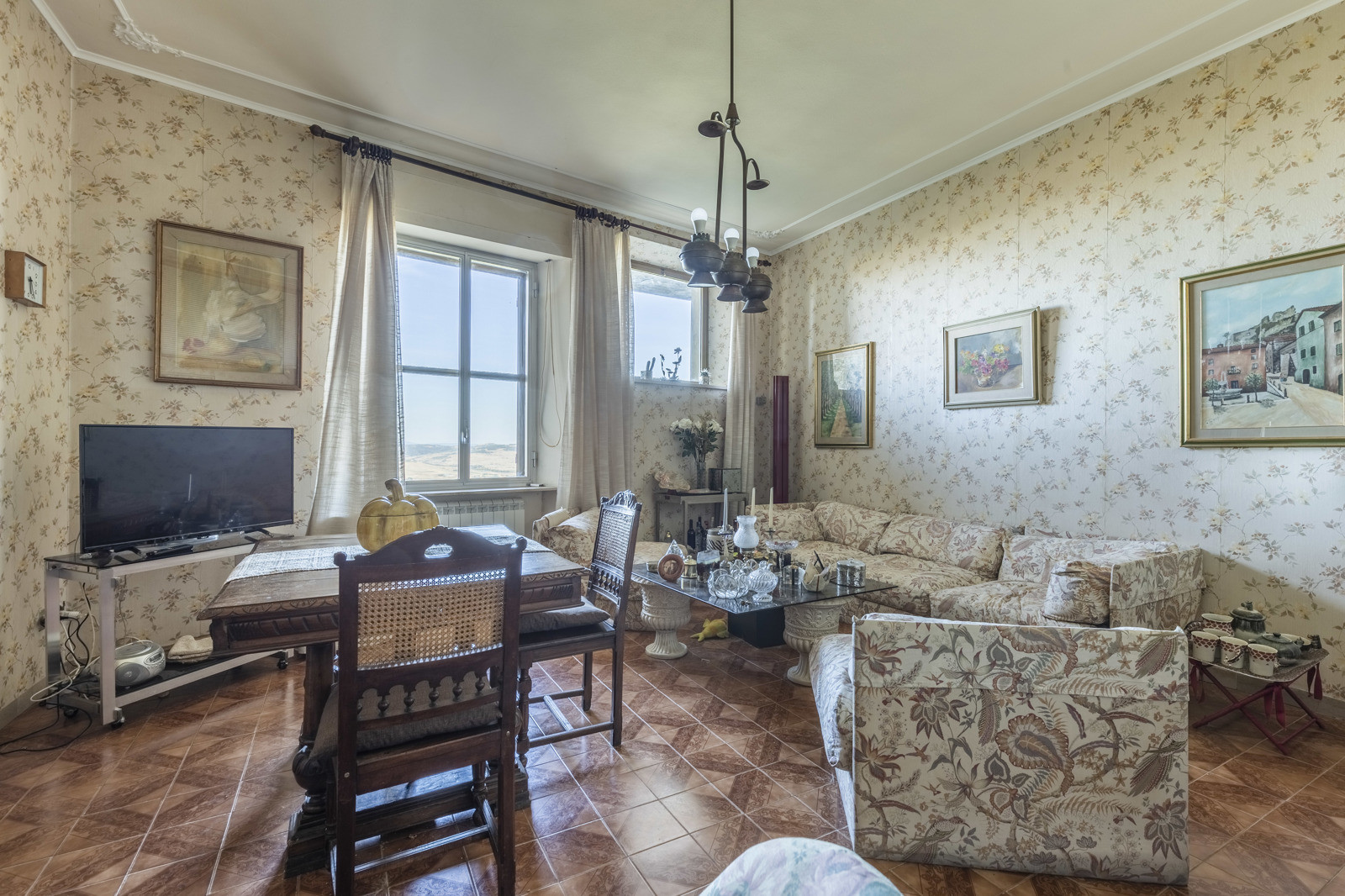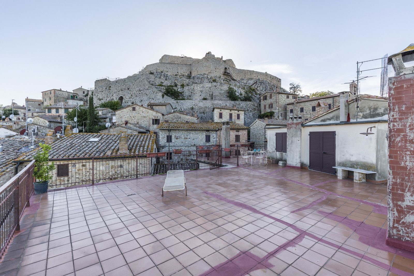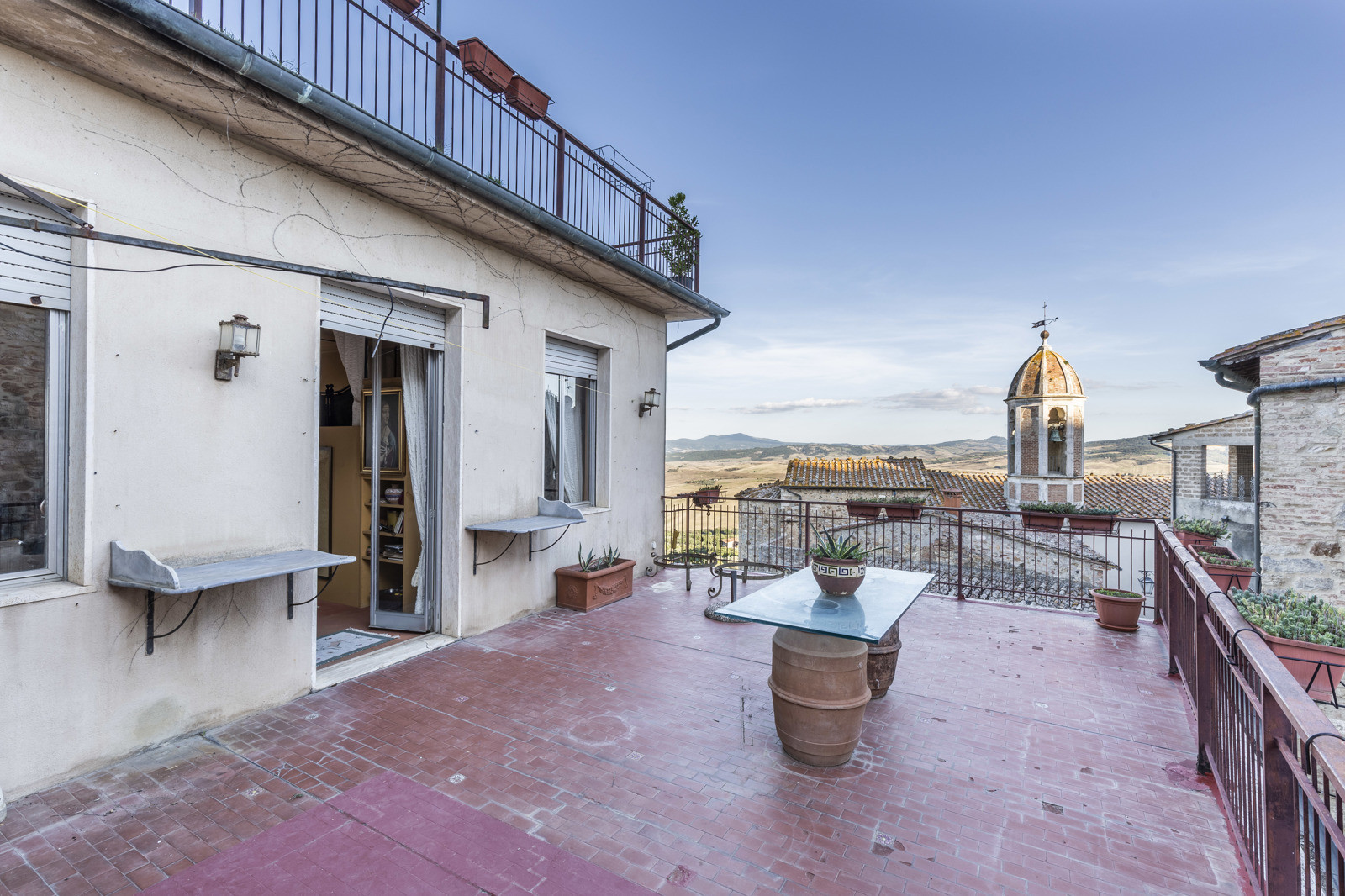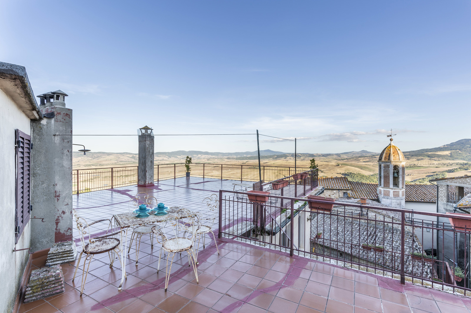 The apartment also has a long balcony with panoramic views and a terrace overlooking the Rocca d’Orcia.
