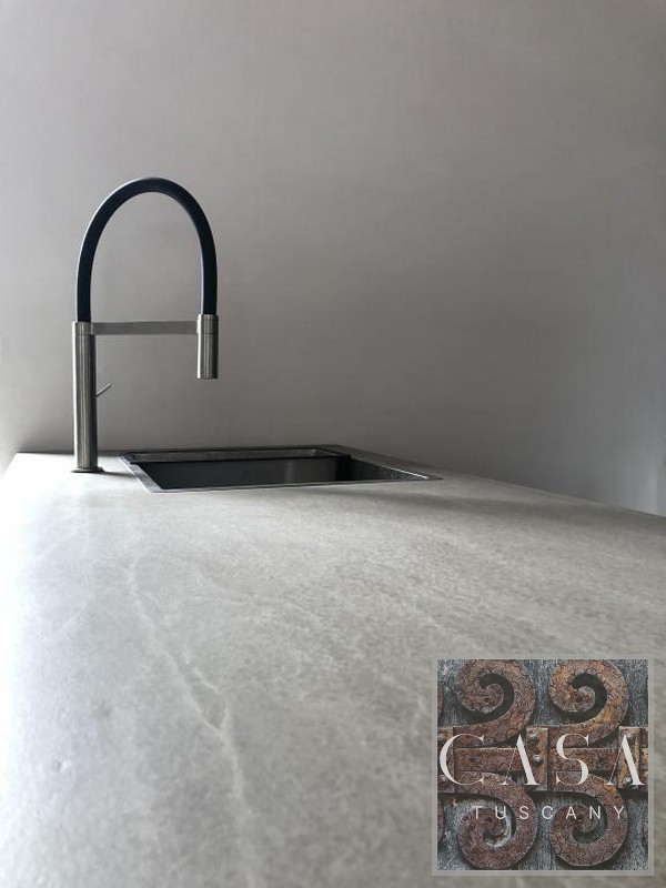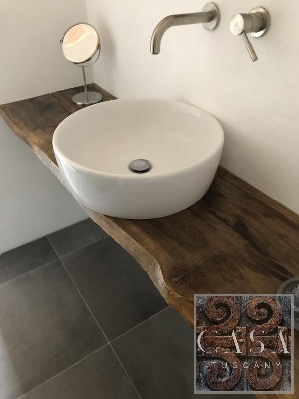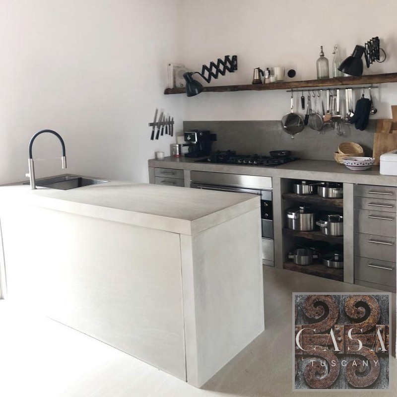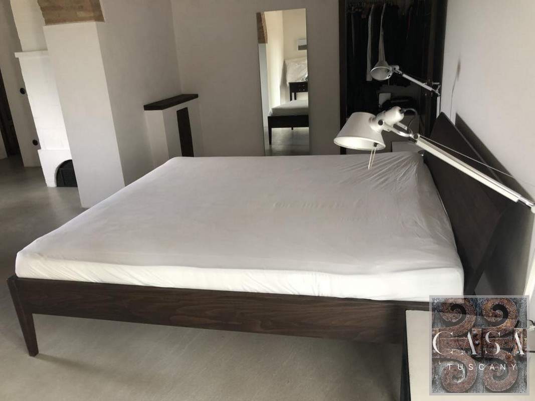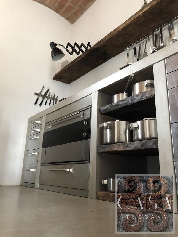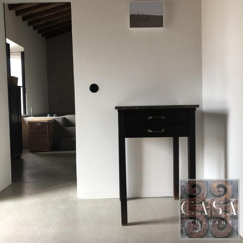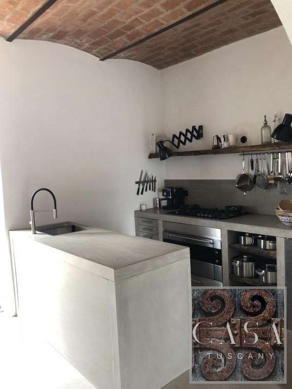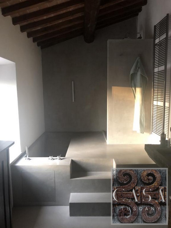 The interior has been converted into a spacious and comfortable apartment. It is furnished with Italian design and antique Tuscan furniture. Modern concrete floors, an unusual concrete bathroom, and a designer kitchen made of concrete and old wood set the interior design of the house apart.