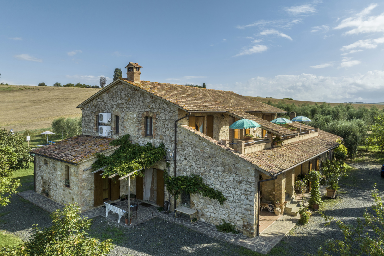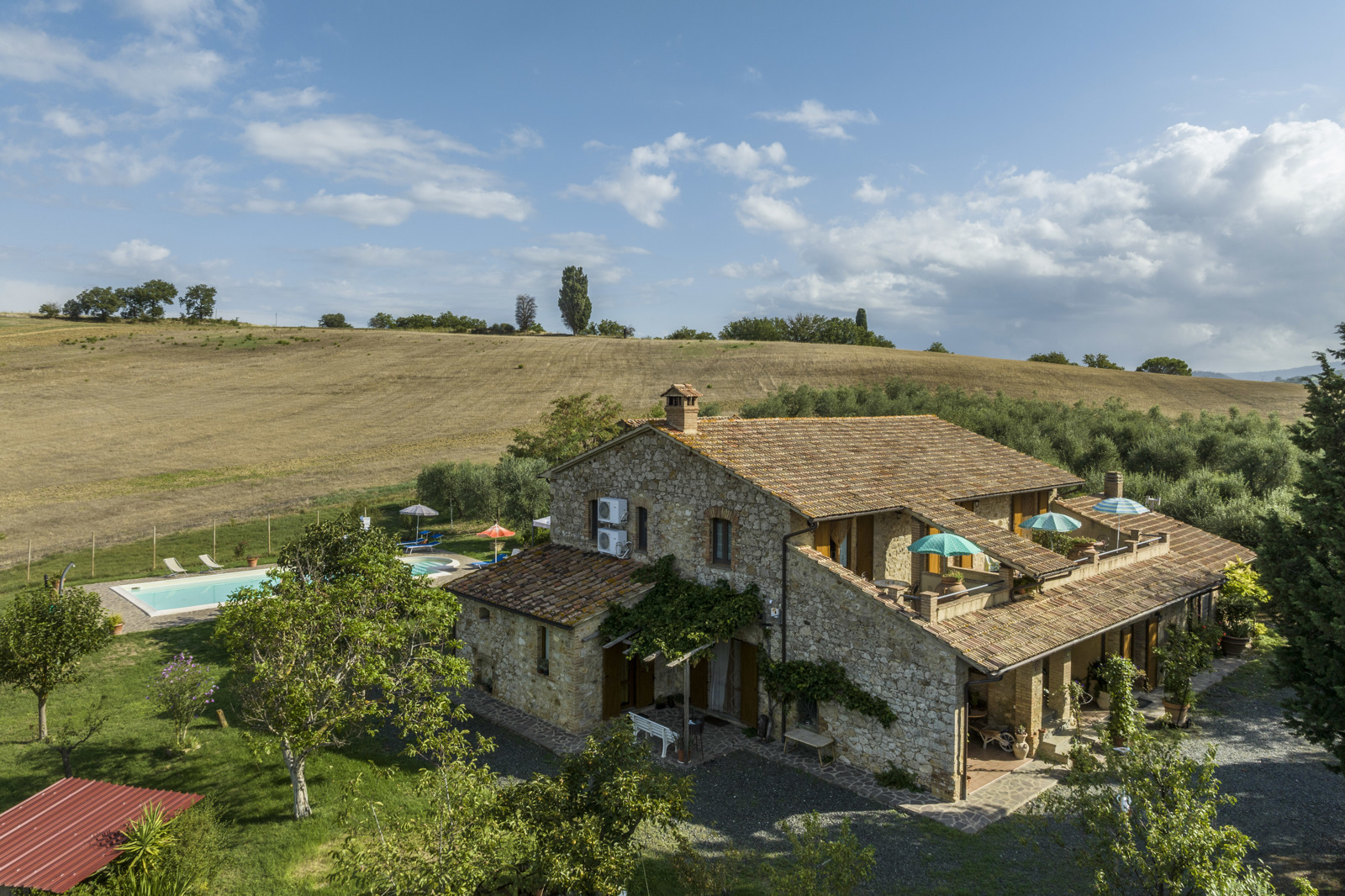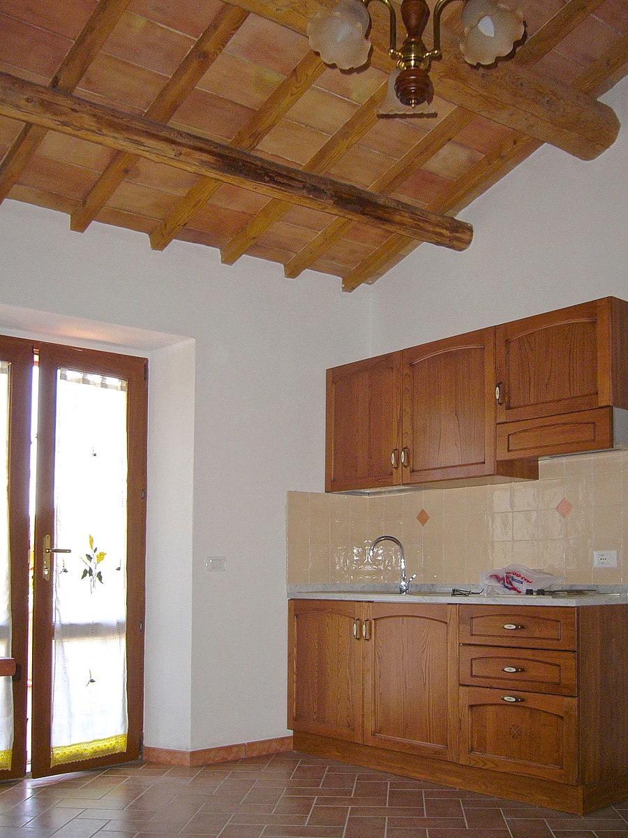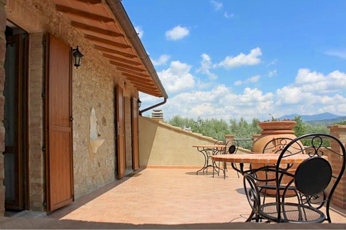 The farmhouse is in great condition, since it was renovated in the early 2000, has stone facade, terracotta tiles. Interiors have been renovated in typical style with ceilings beam and terracotta floor on the first floor and arches on the ground floor. The building has also been consolidated and the installations and utilities upgraded.