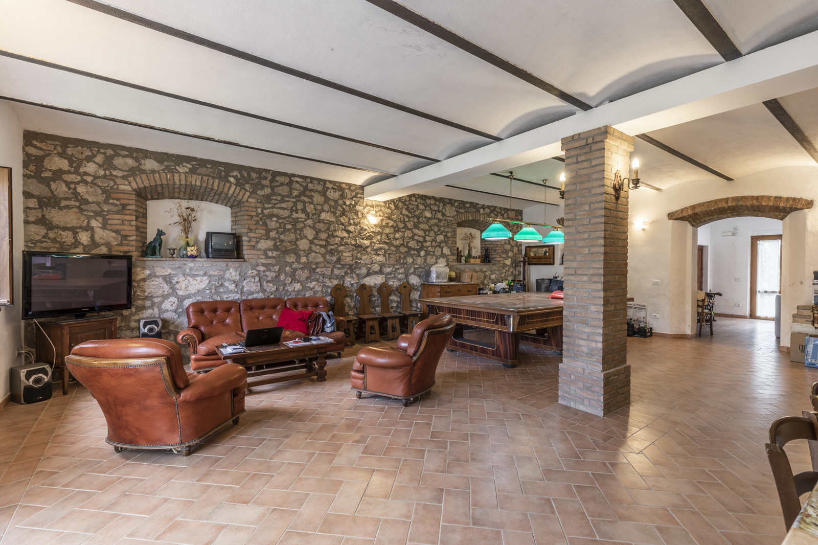 On the ground floor there’s the entrance of the private apartment and to the large living room of about 95 sqm, with pool table, wood burner and relaxation area, and completing this floor the storage rooms and the old fireplace room, today used as laundry and technical room.