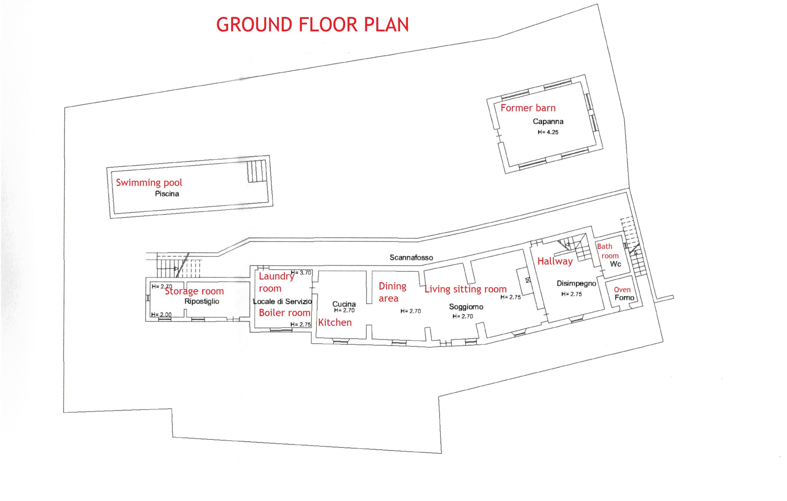 On the ground floor, the farmhouse consists of a large living area with kitchen, dining room and living room with fireplace, bathroom, hallway with staircase leading to the first floor, laundry/ironing room/boiler room, storage room, and oven.