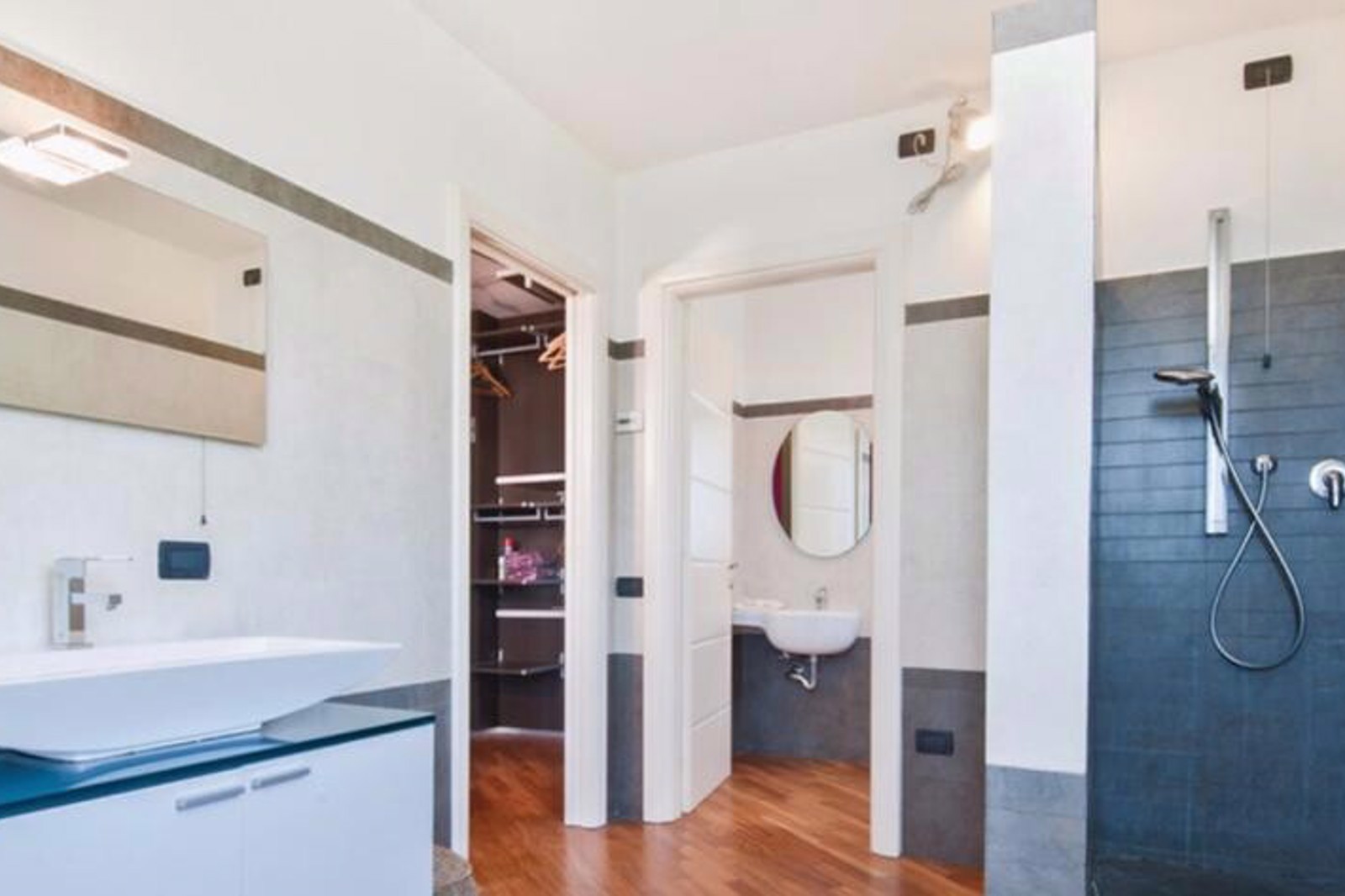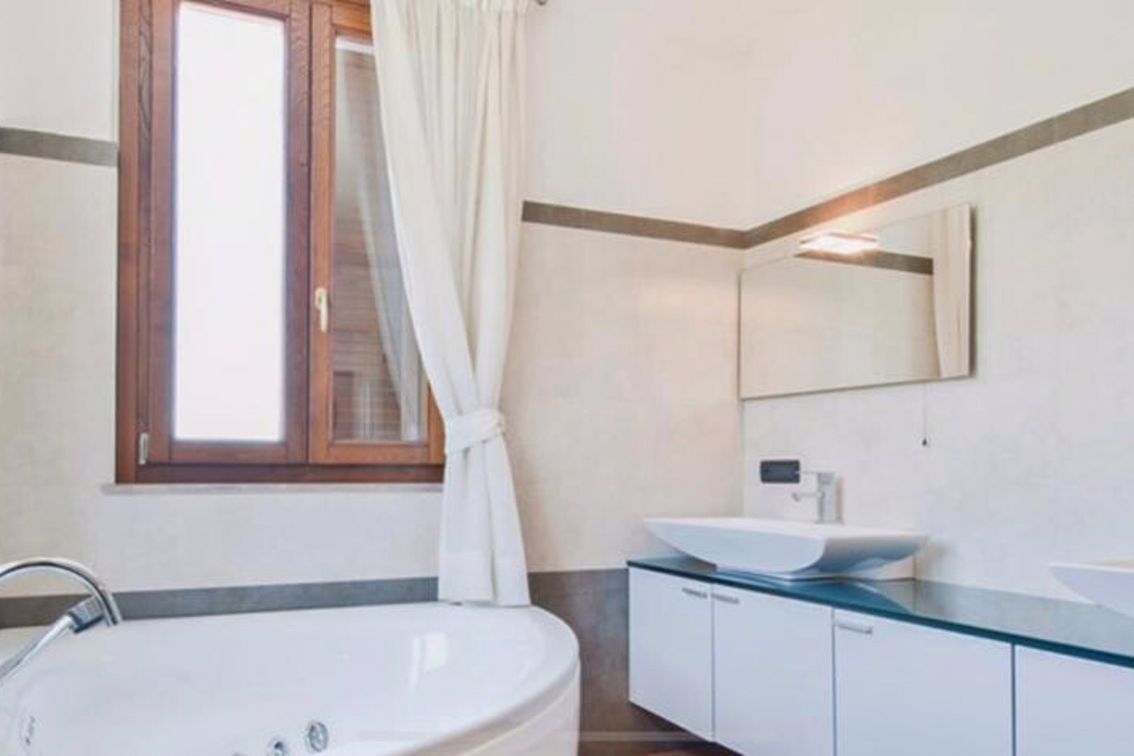 On the second floor is a master bedroom with wonderful en-suite bathroom equipped with large masonry shower and panoramic glass corner Jacuzzi, where you can enjoy the beautiful landscape while relaxing in the bath.
