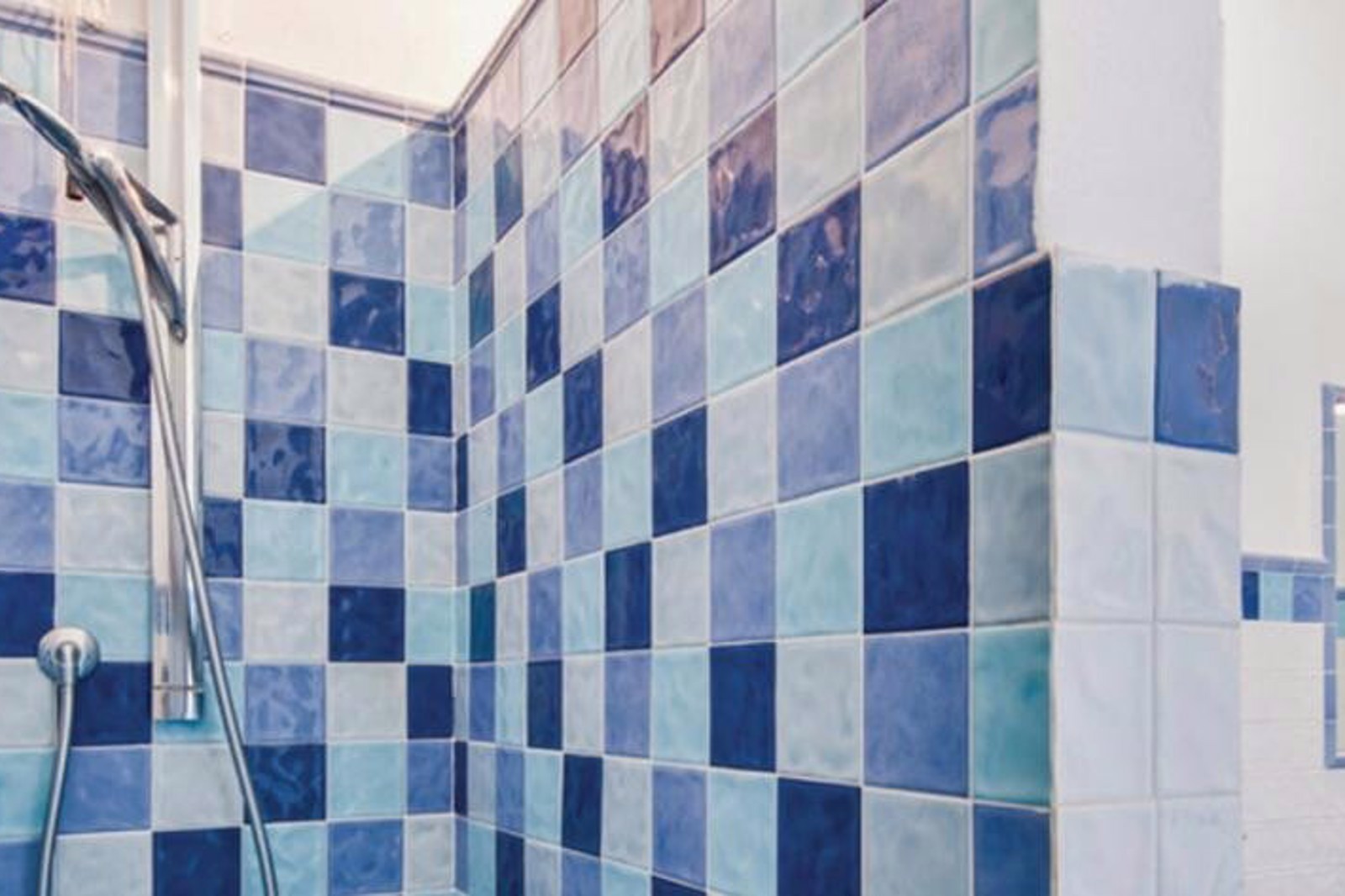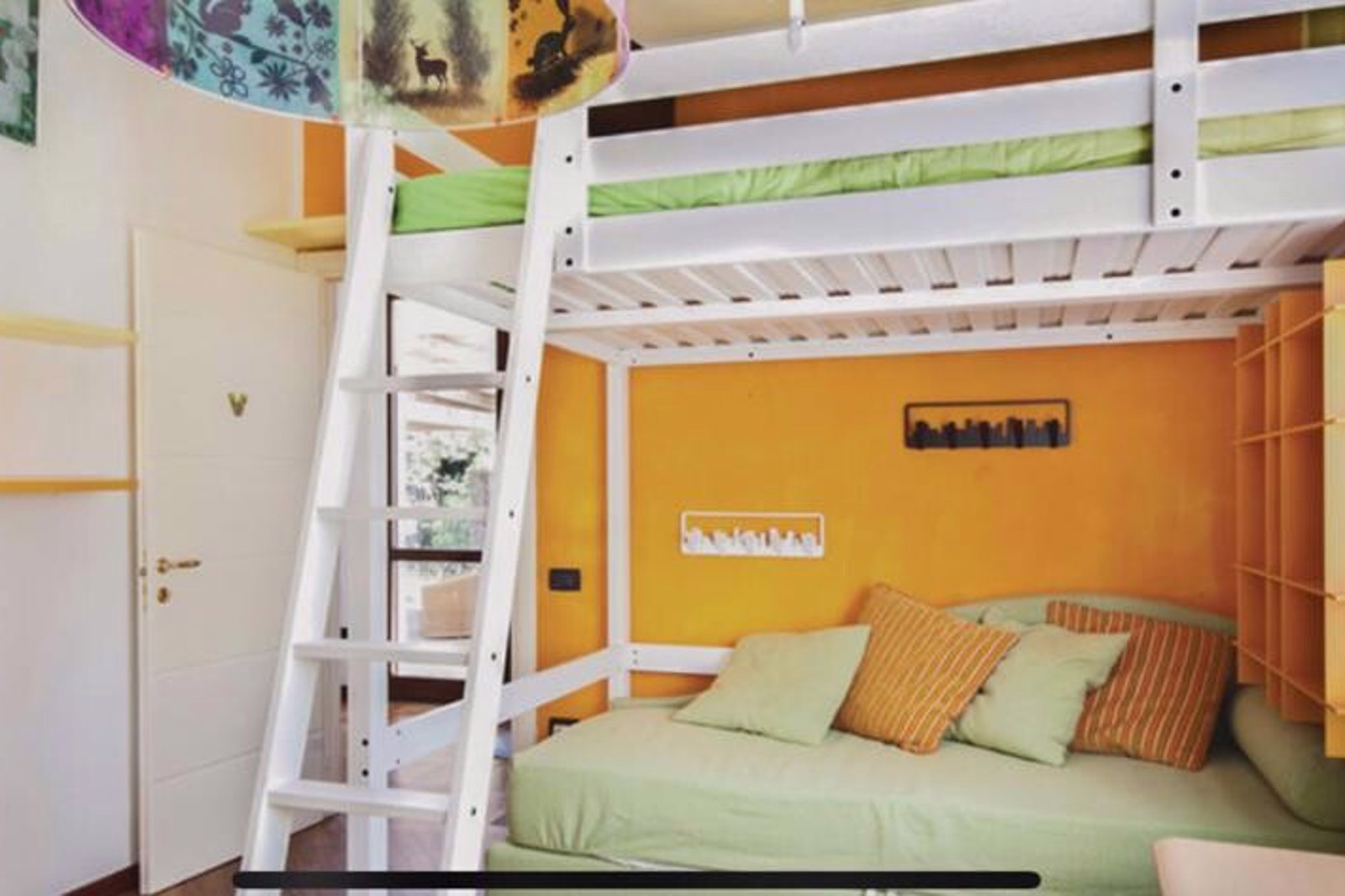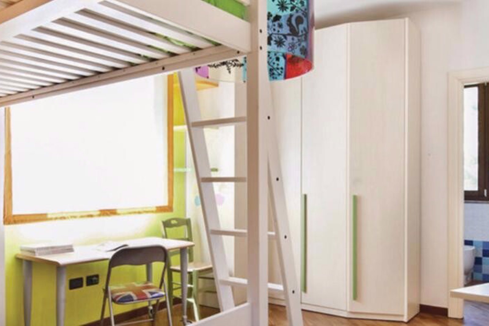 From the ground floor, via a beautiful masonry staircase, we go up to a mezzanine floor where there’s a master bedroom with French doors and access to the garden and a bathroom with a masonry shower.