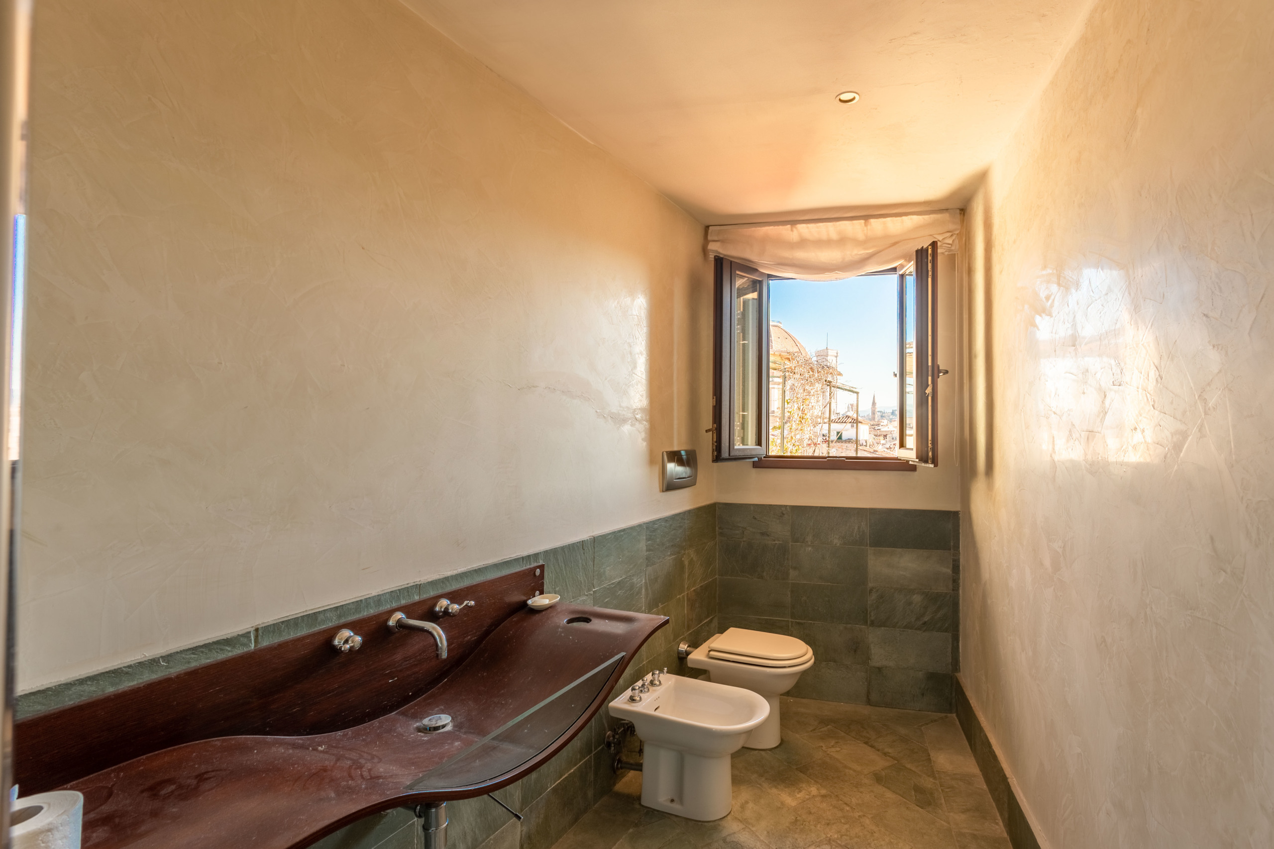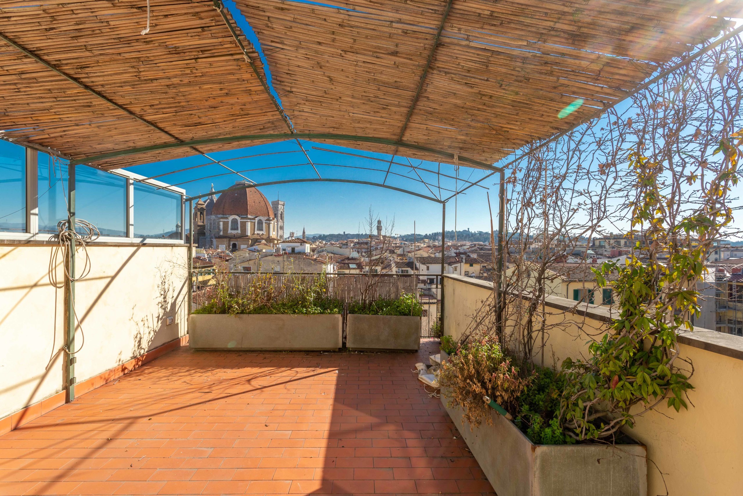 Three terraces are the real plus of this house, the biggest one with panoramic view on the city and Brunelleschi’s Duomo where you can create a space for dinners with a big table or a relaxation area with sofas, a small terrace off one of the bedrooms and finally a terrace on the upper floor used as laundry room even if it enjoys a panoramic view.