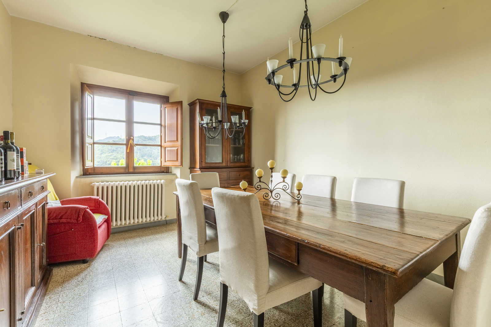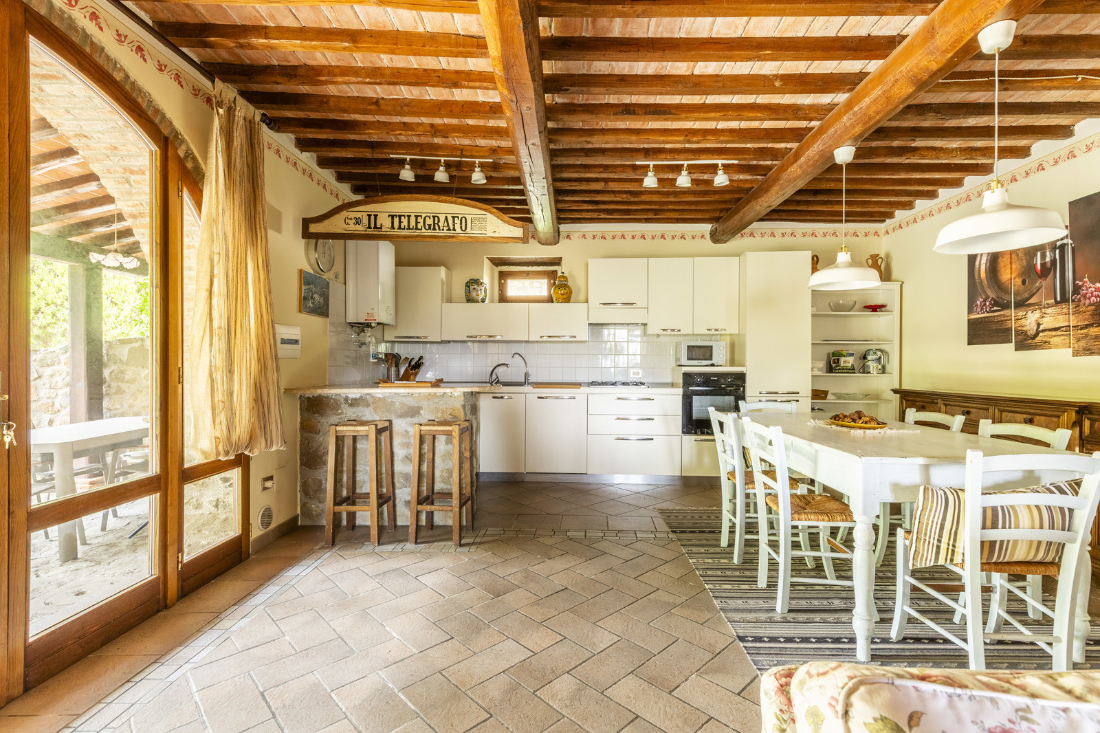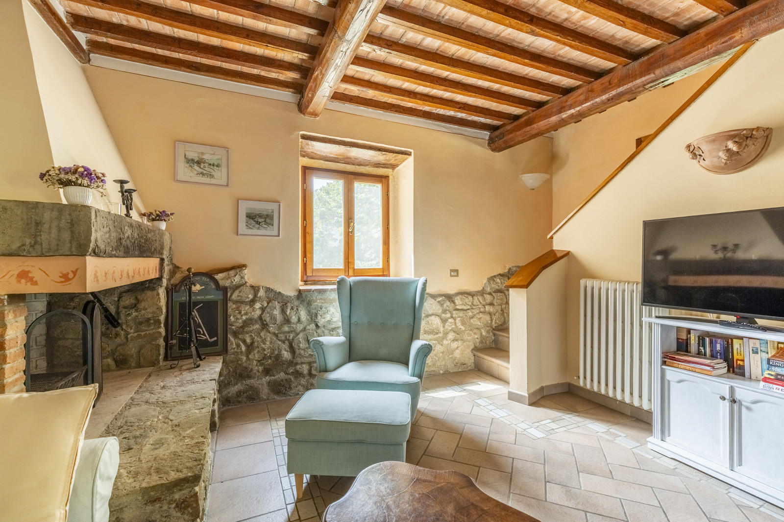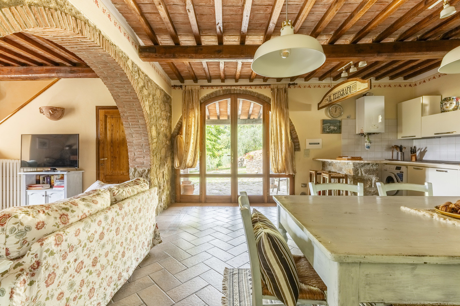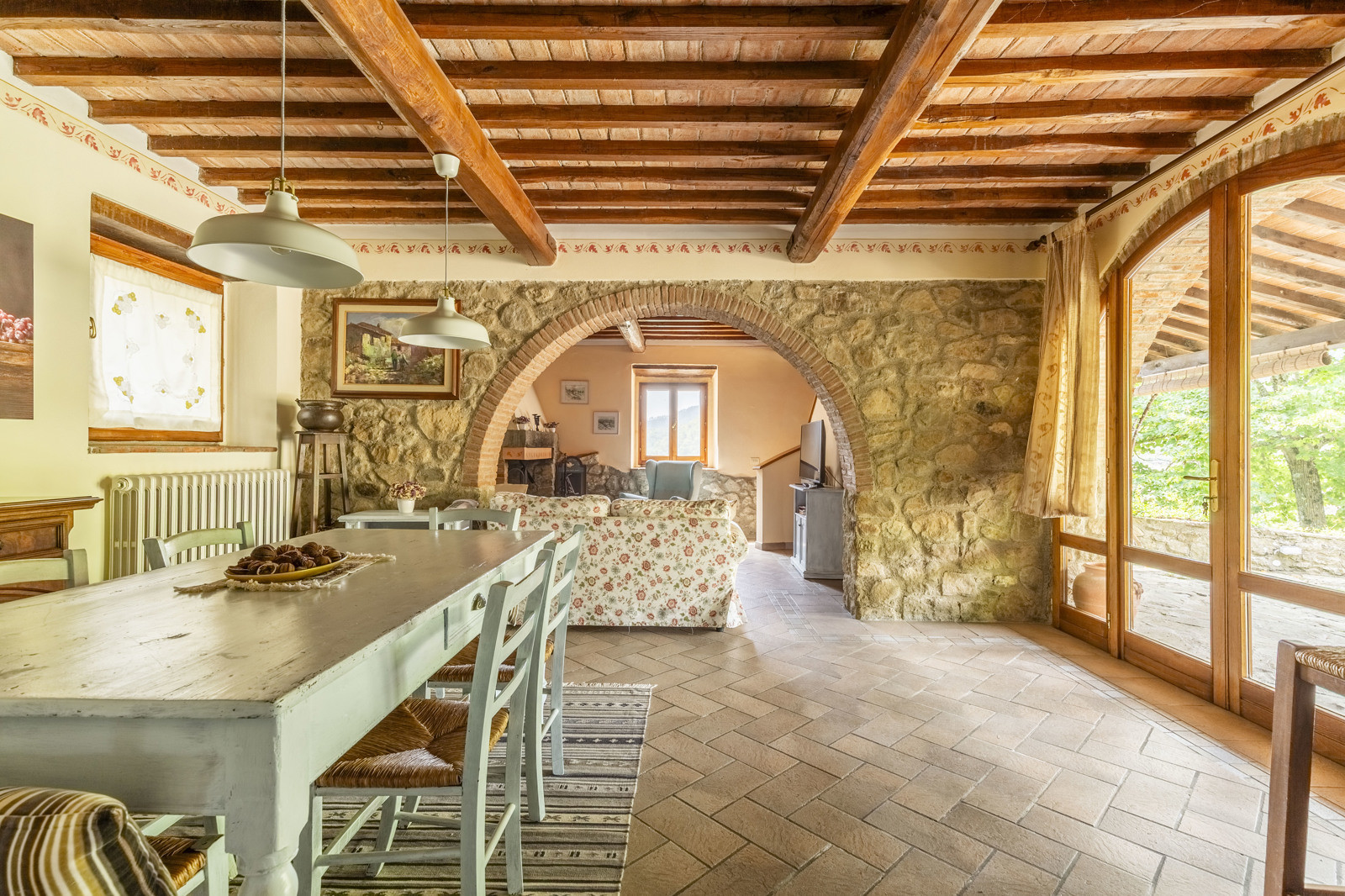 The farmhouse is in good condition and retains the typical details of Tuscan style: exposed stone walls, terracotta floors, beamed ceilings, and traditional windows. These elements give the spaces a rustic and authentic charm, whilst comfort is assured by central heating.