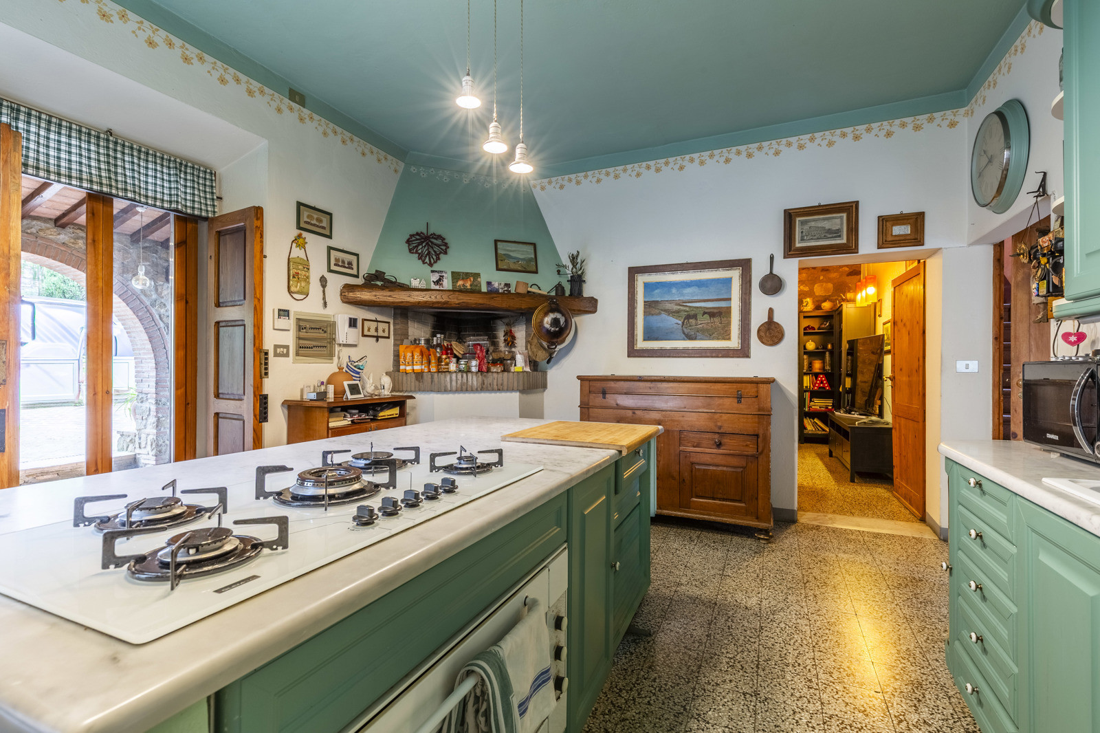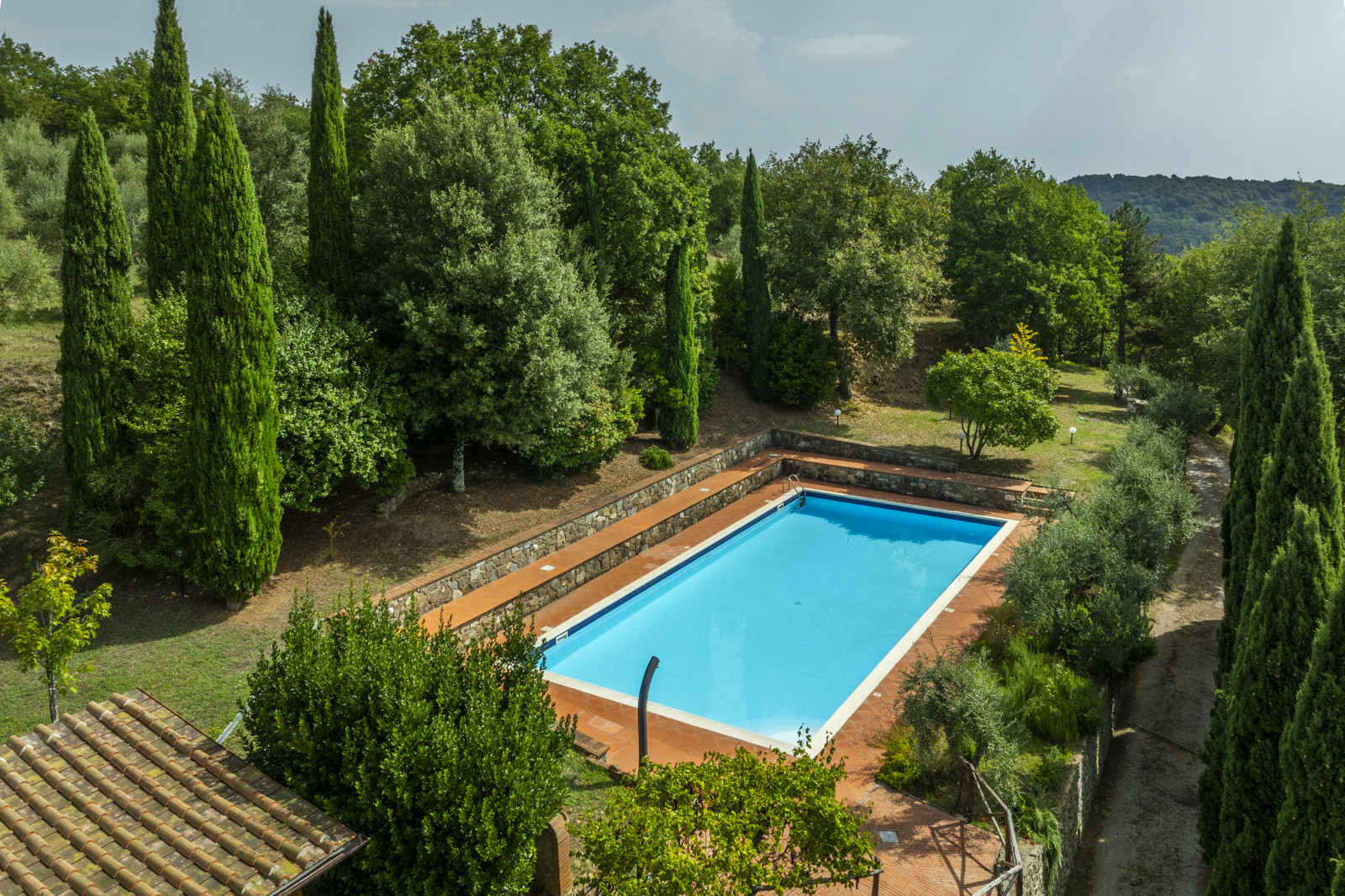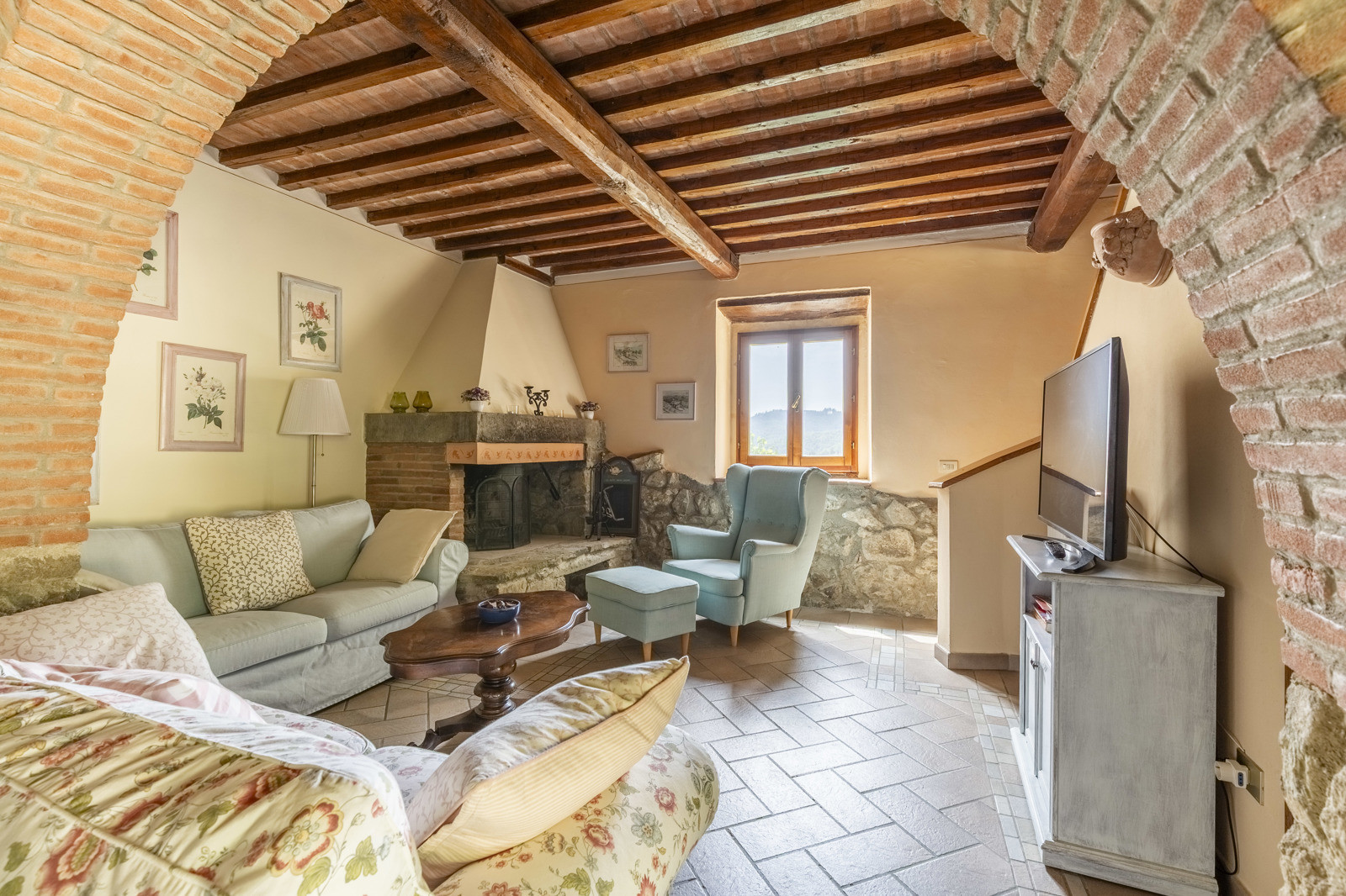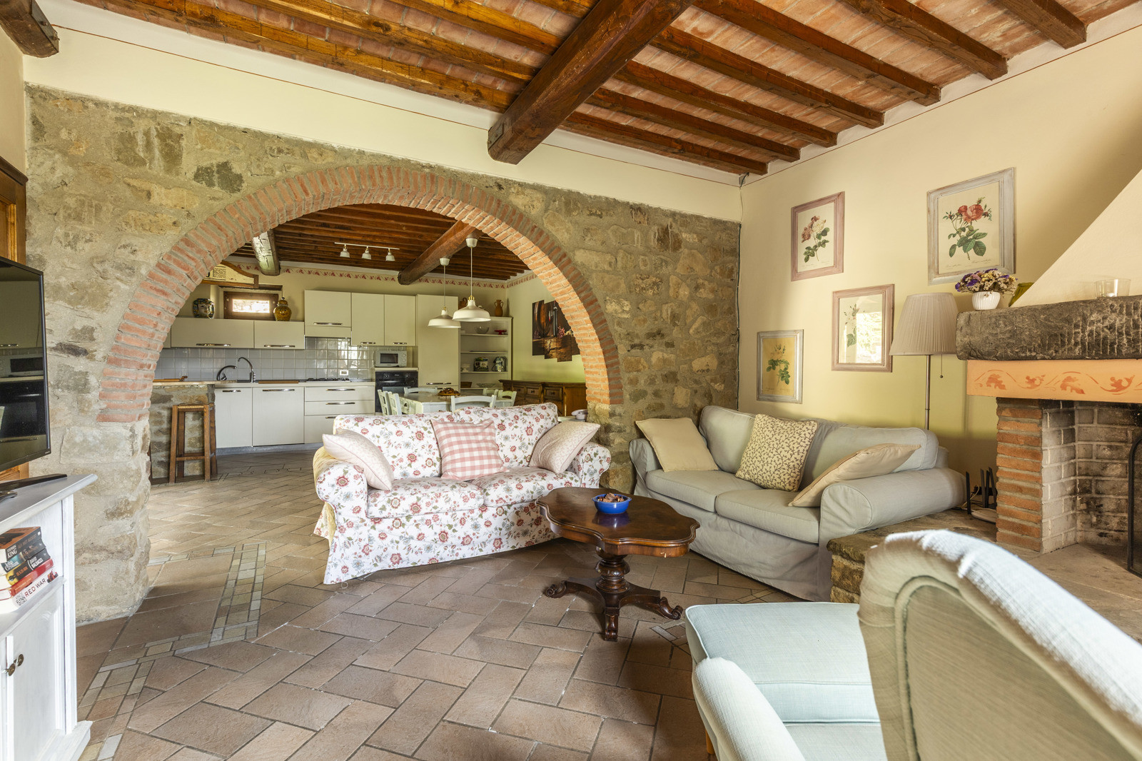 The farmhouse is in good condition and retains the typical details of Tuscan style: exposed stone walls, terracotta floors, beamed ceilings, and traditional windows. These elements give the spaces a rustic and authentic charm, whilst comfort is assured by central heating.