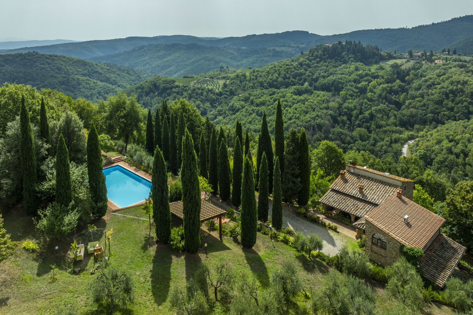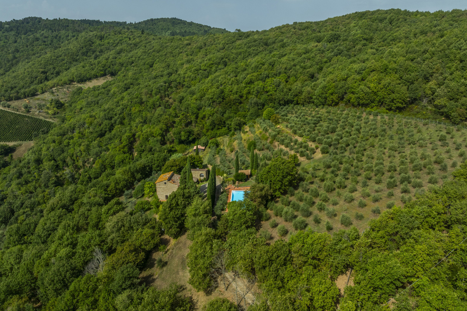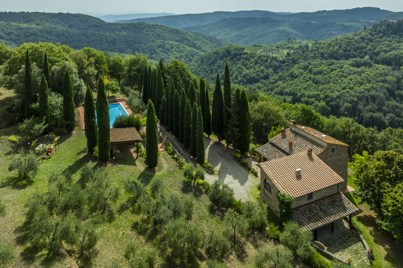 Stone farmhouse with 30 hectares of land and panoramic pool in Chianti, Tuscany.