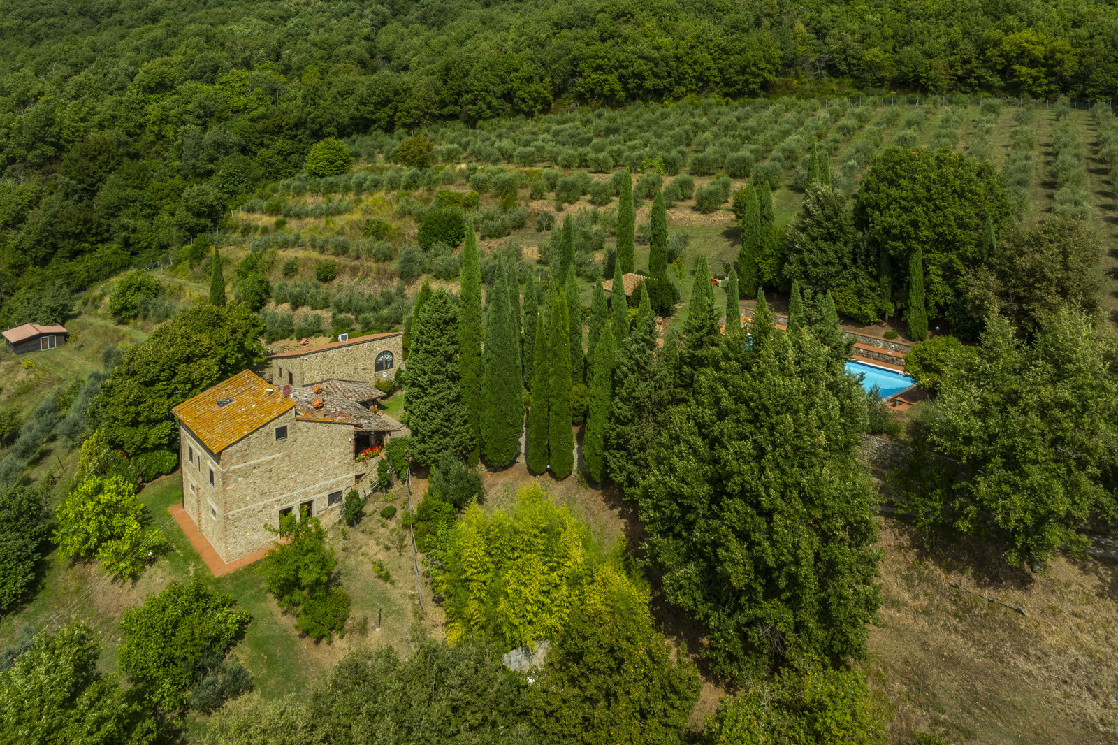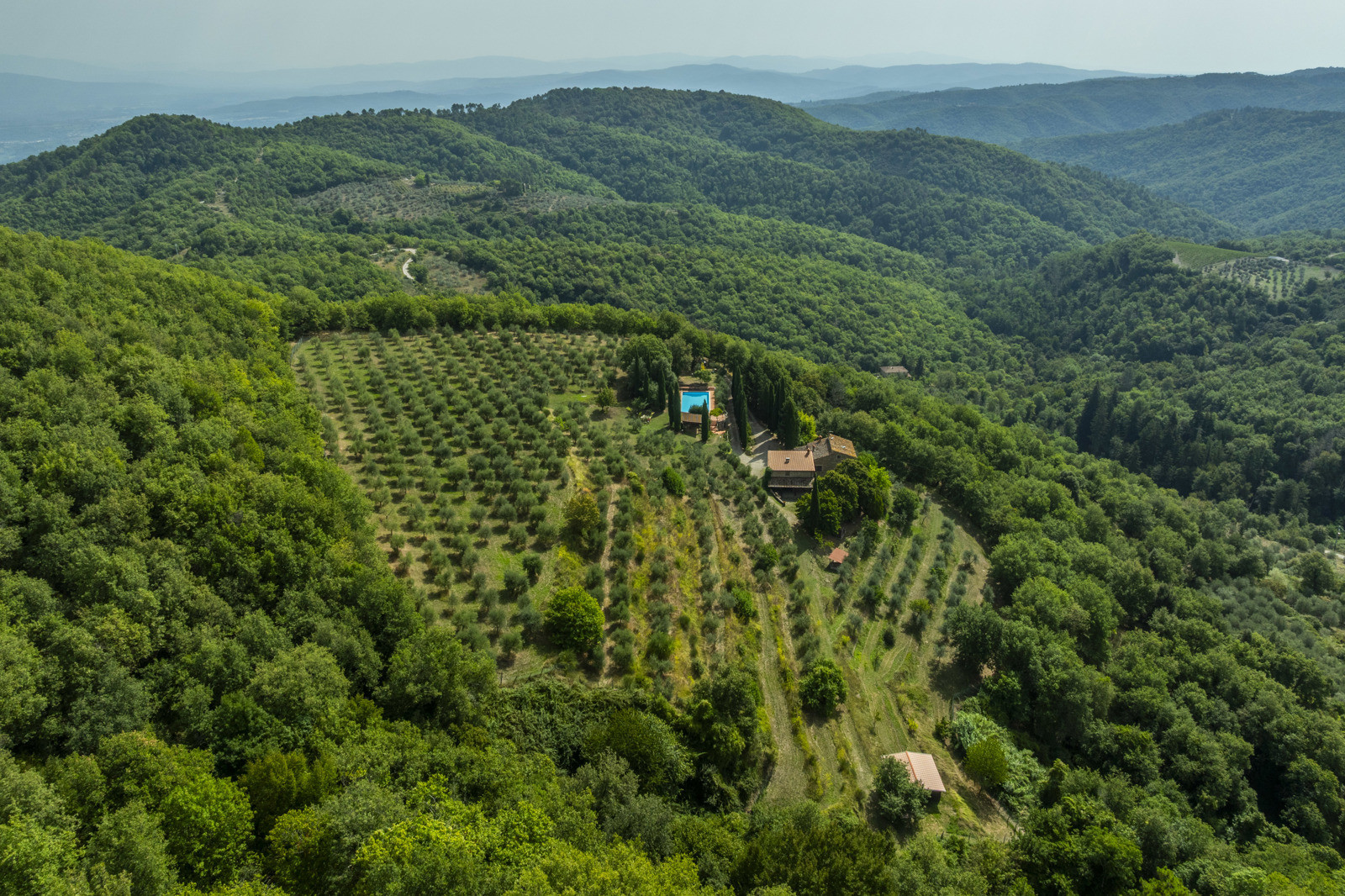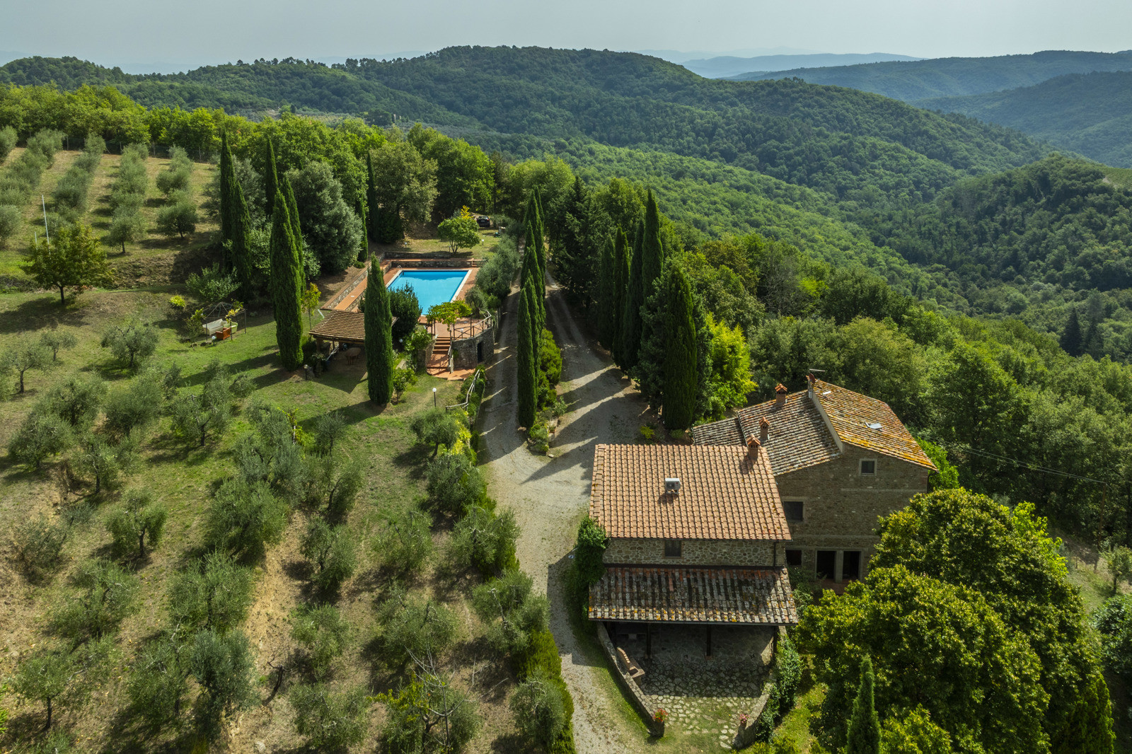 Stone farmhouse with 30 hectares of land and panoramic pool in Chianti, Tuscany.