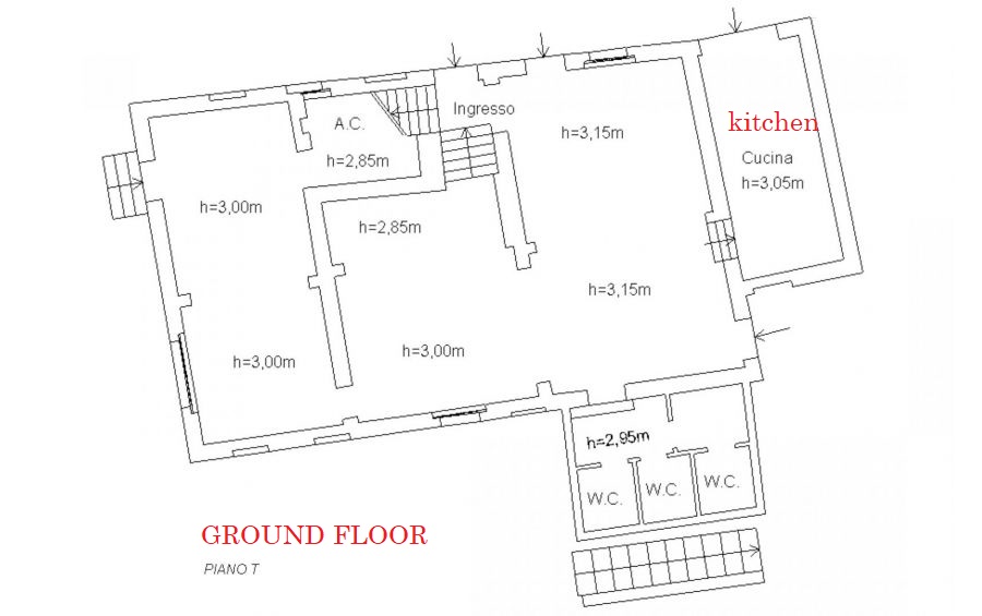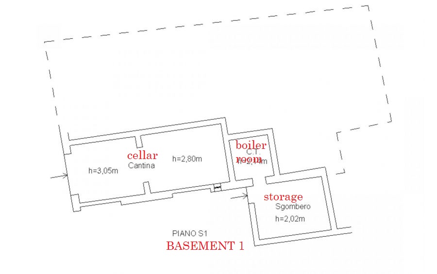 Basement: two separate entrances, one into a rustic cellar, one into a storage room and a technical room.