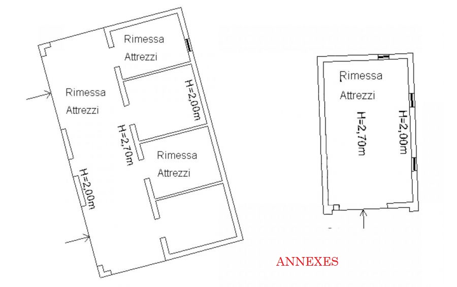 Annex/es: a 40 sq m/430 sq ft one-level barn used for storage with 5 rooms; a 18 sq m/195 sq ft one-level barn for storage, with 1 room.