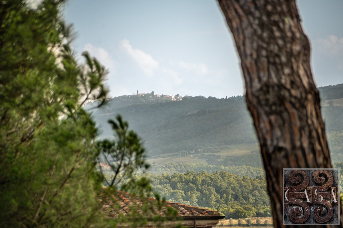 The views are of rolling hills, rows of cypress trees, and the bell towers of Sinalunga, just 2 km away.