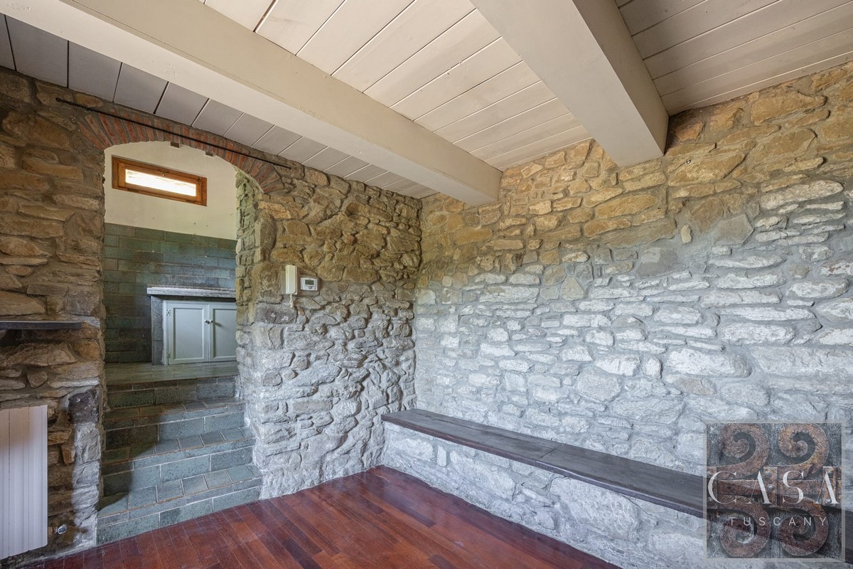 On two levels, the main house consists of large and bright spaces, designed to offer maximum comfort without compromising the authenticity of the traditional rustic Tuscan style. On the ground floor is a large living room with fireplace. The kitchen, separate but communicating with the living area, is spacious and fully equipped, with large windows with great views of the surrounding countryside. This floor is also equipped with a service bathroom and a closet.