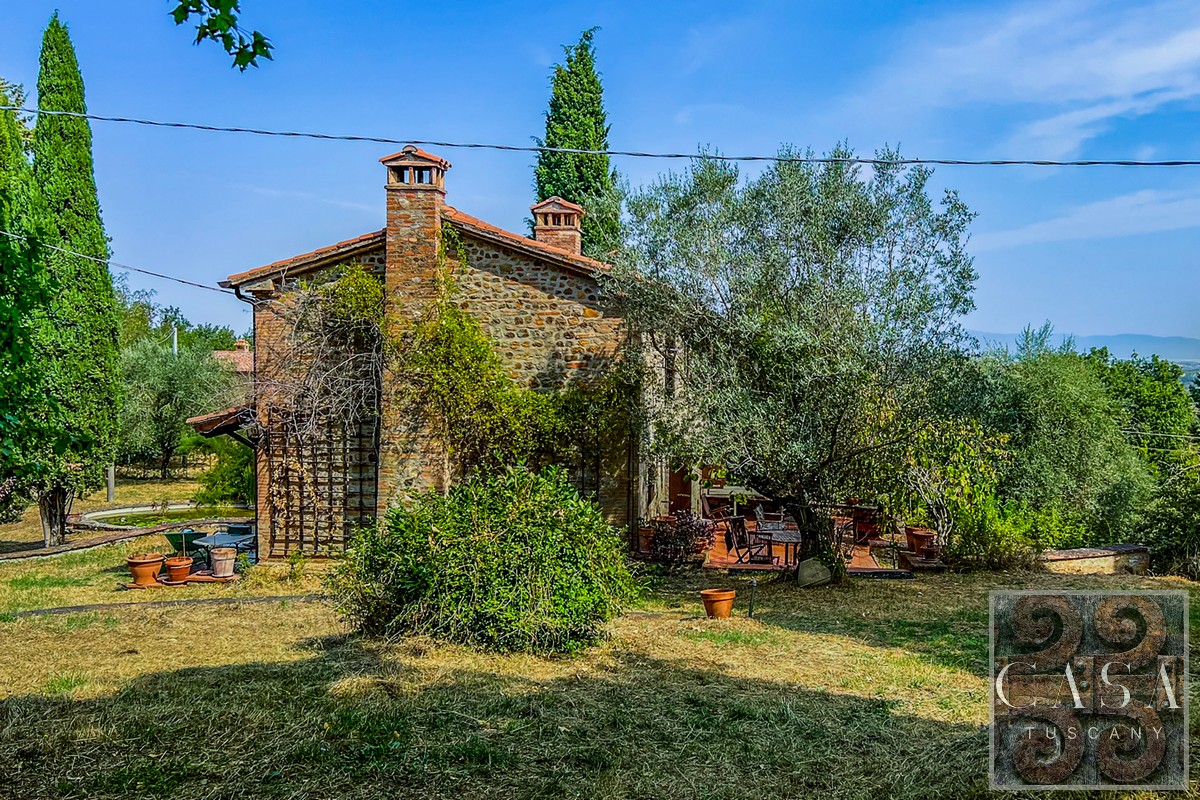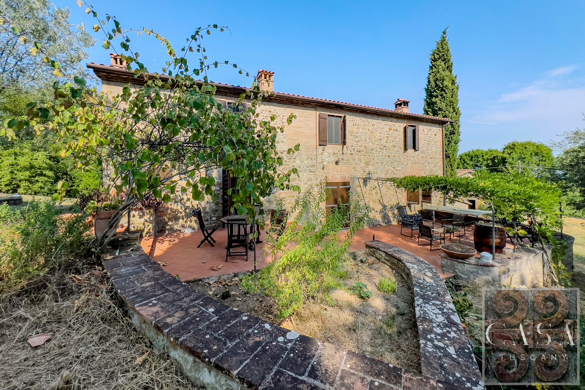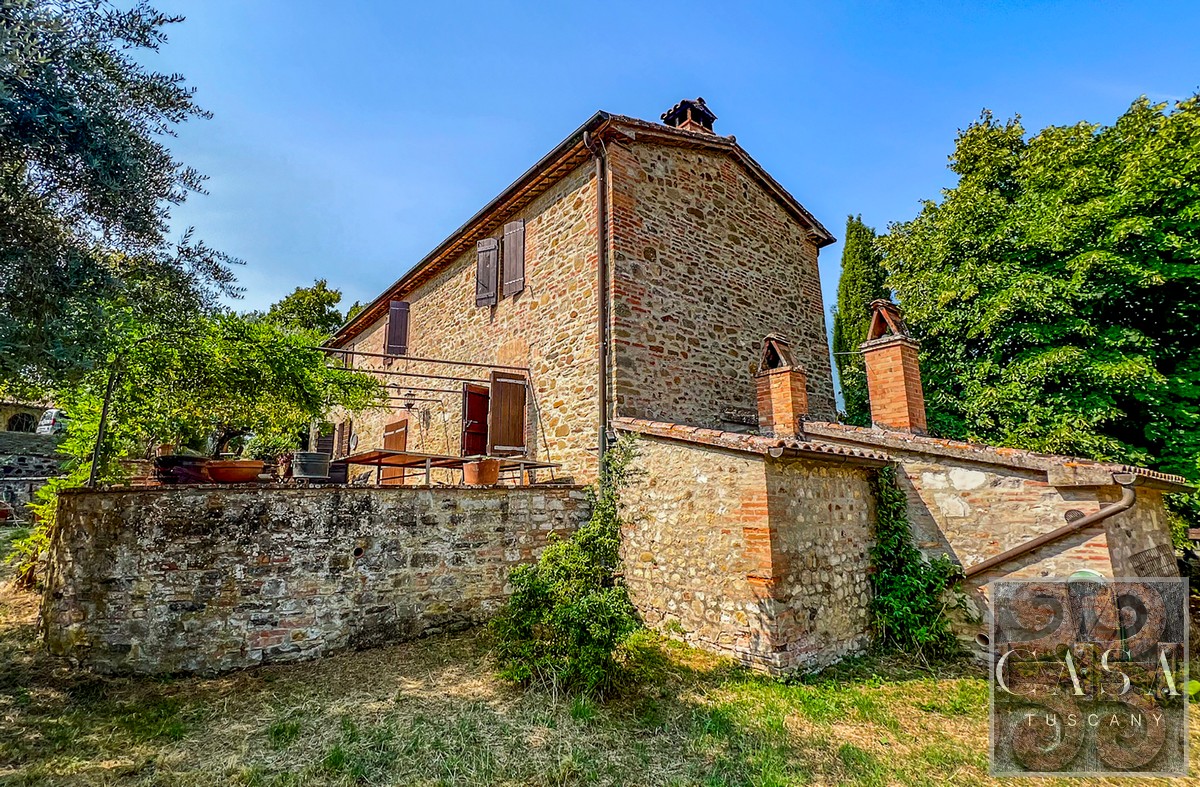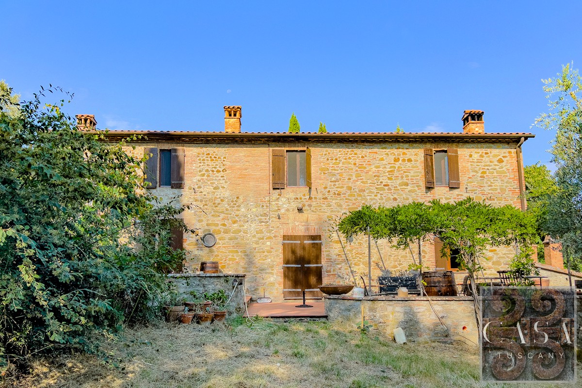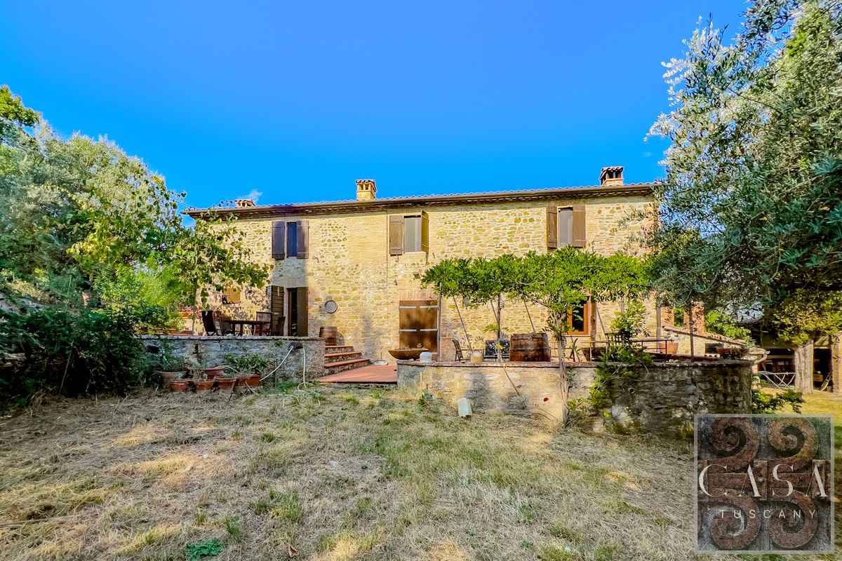 In a privileged and private location, this stone country house offers a splendid panoramic view and is in the Umbrian countryside, a few minutes from the historic centre of Città della Pieve and the shores of Lake Trasimeno.