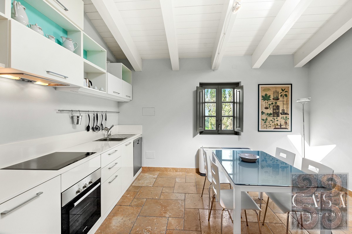 In front of the villa, a classic paved courtyard connects to a former barn converted into a glass-door dining hall with a restaurant and panoramic views over the swimming pool and the stunning scenery of the surroundings.
