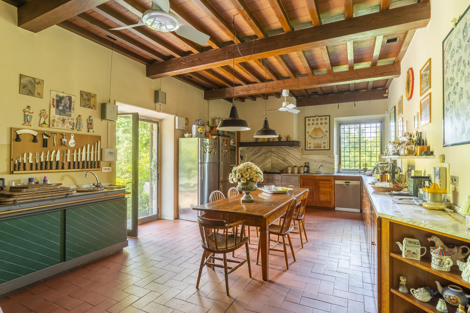 The main villa is spread over 3 levels, enjoys two independent entrances and hosts on the ground floor a large and airy professional kitchen with fireplace and its dining area, a service bathroom, a double and elegant living room with large working fireplace and a large and very bright loggia closed by windows, with an ancient oven and perfect for exclusive dinners.