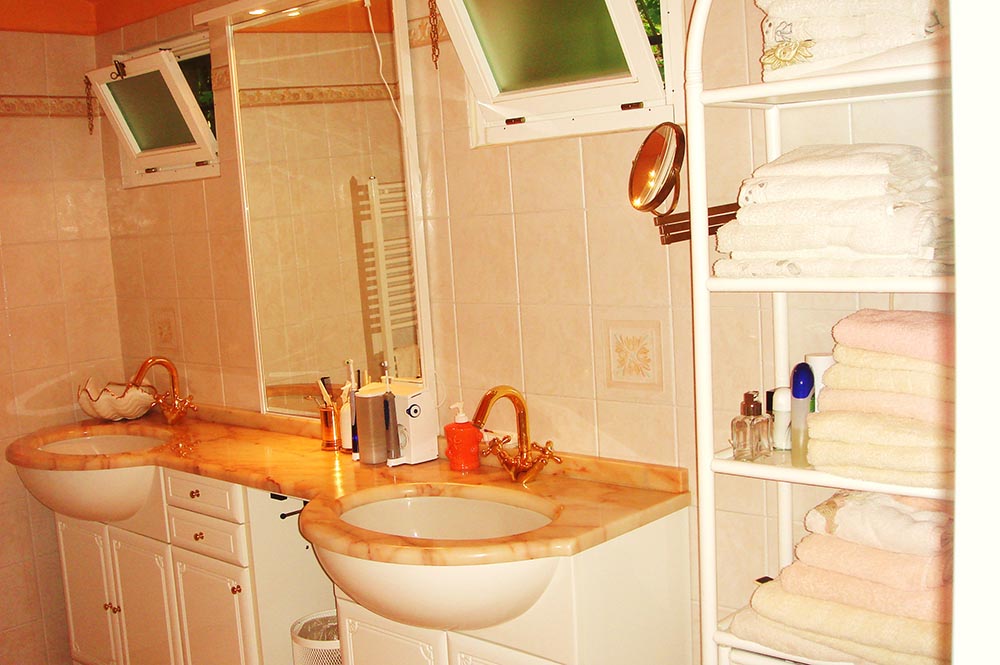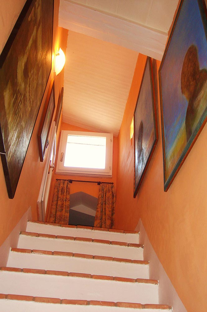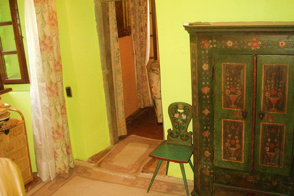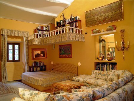 From the sitting room an arched natural stone stairway with historical brick ceiling leads to the rooms on the first floor. When you reach the landing, there is a bathroom to the right with double sinks, bidet, toilet and a large corner shower. Like all bathrooms in the house, beautiful tiles decorate the walls, the faucets are gold plated and there is also a warmed rack for the fluffy, soft towels. To the left you enter the magnificent living room library with an enormous open wood fireplace with an authentic iron hearth plate. Comfortable lounge chairs, a loveseat and a fantastic display of precious antiques and paintings round up this delightful room. Here the medieval stone flags could be restored to their ancient glory and are partially covered by Tibetan Carpets. From this room you have enchanting views over the valley and hear the gurgling of the fountain and the song of the nightingales and various other birds. From this central room you enter the guest room which is lovingly decorated and further the dressing room with room-high built-in closets. “Him” and “Her” will find plenty of space for an extensive wardrobe. All closets are superbly organized. The floor is covered by a magnificent Persian carpet with motives telling an ancient story.