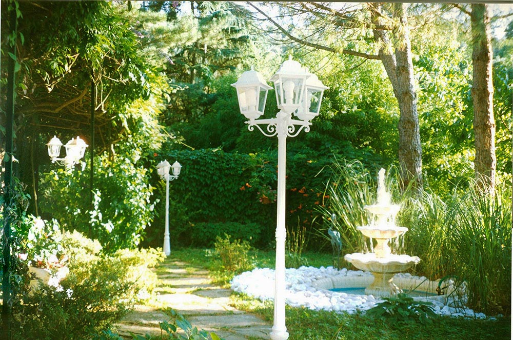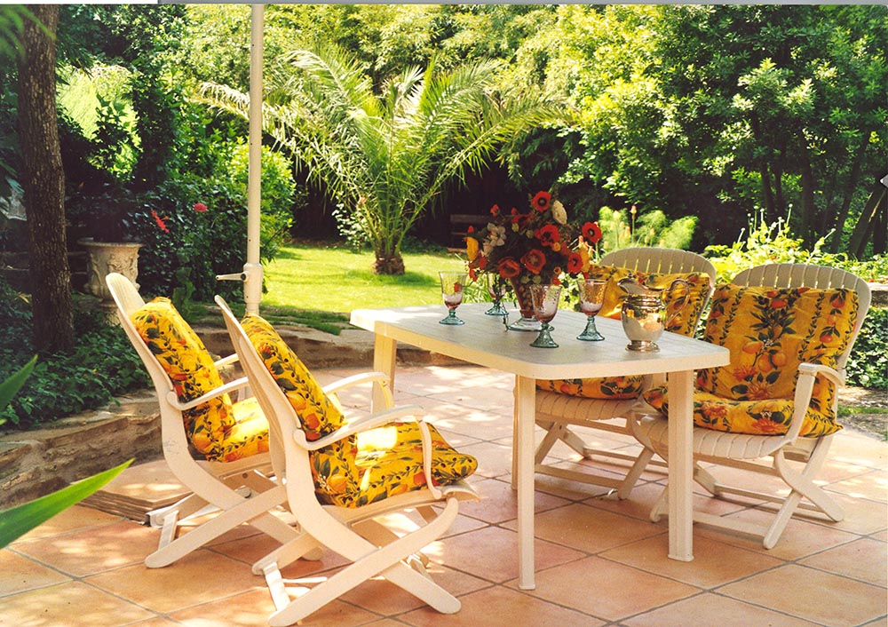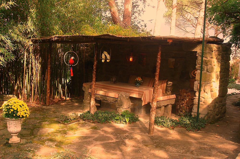 Past this “island” you enter the front yard of the residence in which hundreds of years old wisteria meander all over the front of the house and give it this fascinating romantic appeal. To your right among the flower beds is the 5 tier fountain that dominates the sound background of this “island”. The calming effect of the gently gurgling water and the songs of the birds is amazing. With the doors and windows open, this natural music can be heard in all front rooms of the house. Placed among the greenery are traditional lanterns which you would find in the medieval cities of Europe and add to the romantic flair of the residence. Past the front yard to your right you will see the ancient stone table and benches where the medieval inhabitants used to take their evening meals in the shadows of the shrubs. Today designer cushions ease the archaic stone benches and make it a pleasure to gather around the table. Next to the ancient refuge is a small pond and along the garden trail you see almost life sized bronze statues. To the left of the house is a tiled patio with a table and chairs and from here a small pathway leads over century old worn stone steps through a bamboo grove and you have the feeling you are entering another world. The grove opens up to one of the terraces in the garden with a gazebo and a large 2 person day bed. Here you can enjoy a relaxing afternoon for a siesta or just listen to the sounds of the birds and the breeze rustling in the trees. On the terrace behind you there are trellises of vines which grow so plentiful that you can have your own wine produced by one of the farmers in the surrounding area.