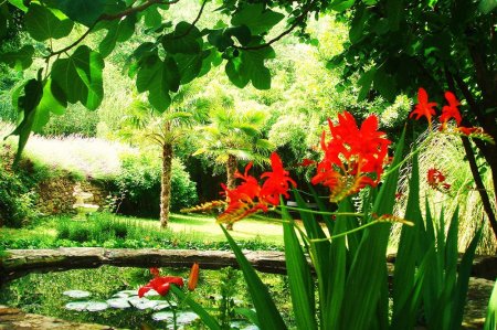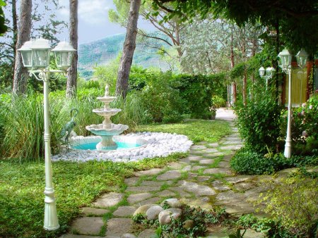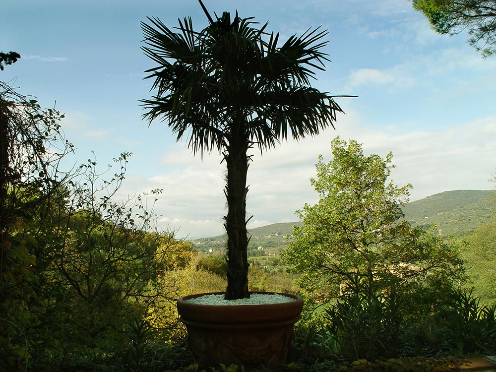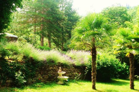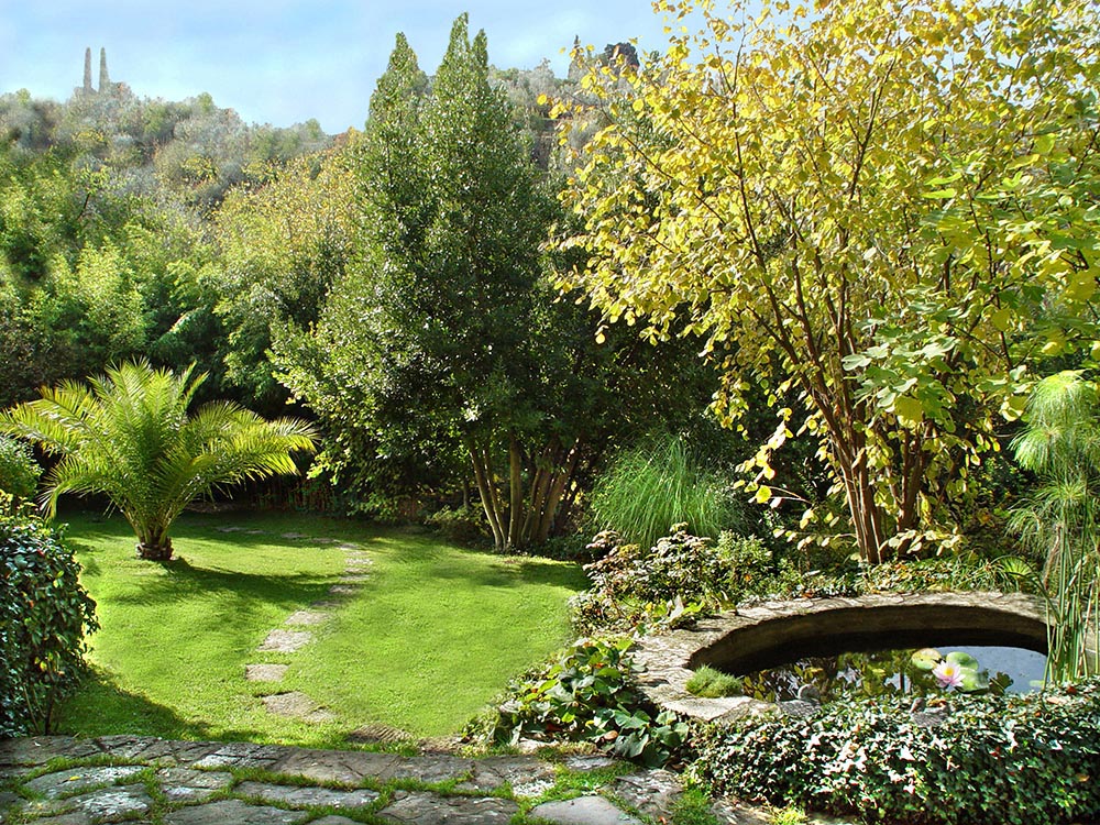 There are also many olive trees. These trees produce the most fantastic extra virgin olive oil, which a true connoisseur will appreciate. From the stone refuge another trail leads along an ancient obelisk which was once used as a sun dial, past a frog pond, teeming with life, into the depth of the grounds. At the end of a lawn there is a wrought iron bench under the bamboo trees. Sit down and let the eye rove over the grounds and the residence in the distance. Just another enchanting island in this green ocean.