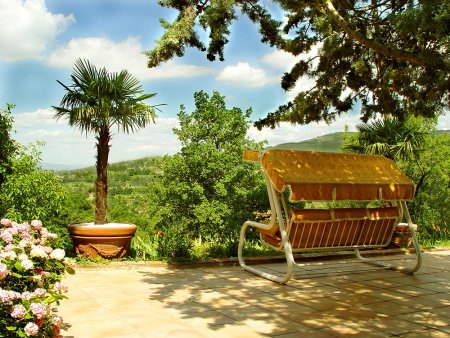 The grounds and garden of this medieval property are something to behold! The present owners turned their dreams into reality and created individual environmental islands in an ocean of green. When you enter the property through the impressive wrought iron gate, you enter a little yard, with turpentine trees, oleander beds, interlocking stone work, an enormous day pot with a fantastic azalea, bordered by an ancient stone wall. A comfortable garden swing invites you for a rest and to enjoy a sweeping view across the valley with its vineyards and olive groves.