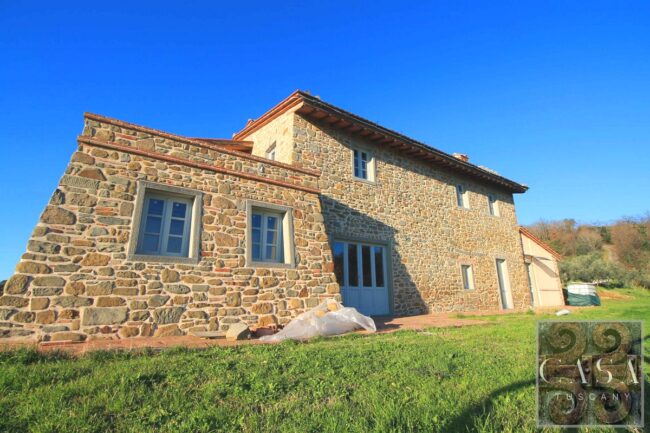 In the famous Chianti area of the Tuscan countryside on a hillside in a panoramic position, tall trees surround this former farmhouse. The property enjoys a large outdoor area of about 5,000 square metres, fully fenced, and 3 hectares of further land which consists of woods, a small vineyard, and an olive grove with over 200 trees.