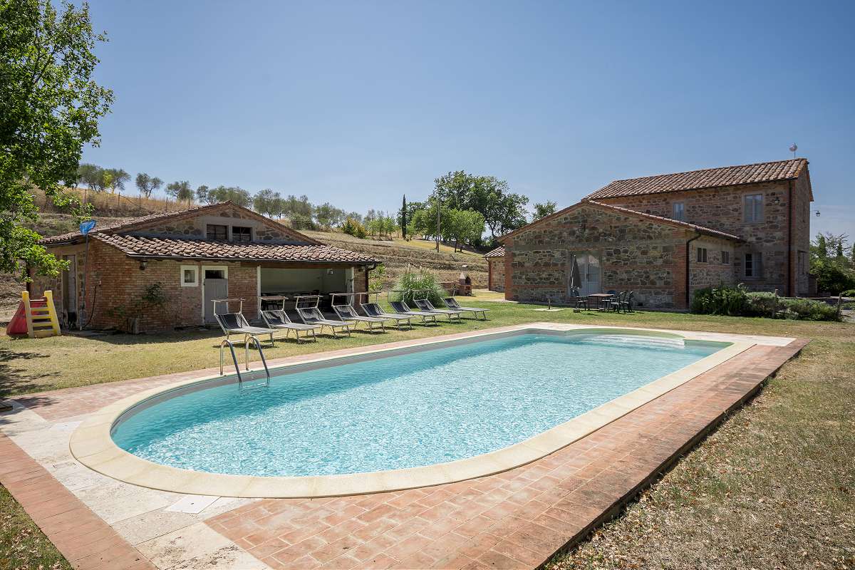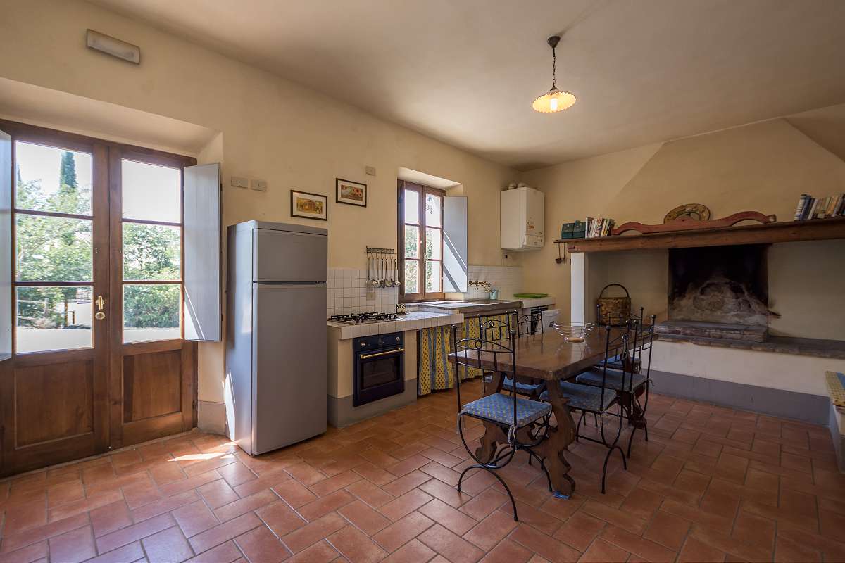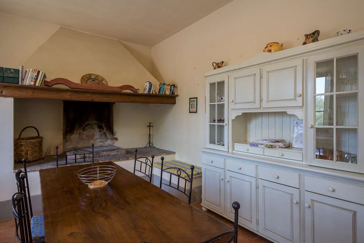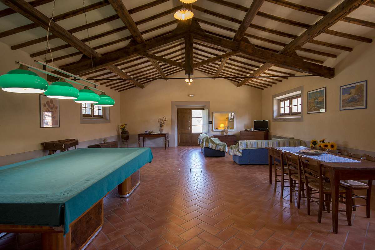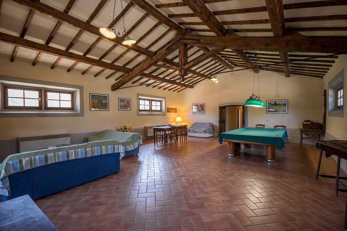Externally, the house features traditional stone facades. Internally, it boasts Tuscan terracotta floors, a living-room with central visible A-frame wooden beam ceiling, a pool-table and direct access to the garden, 3 double bed rooms, 2 bathrooms and a kitchen with a fireplace. The first floor is in an unrefined state and in need of renovation. It is composed of 4 rooms and 2 more bathrooms with set-ups for installation of fixtures. To complete the estate there is a garden of 3500 sqm, a pool with roman stairs that blends in perfectly with the surroundings and 2 annexes of approx 120 sqm each, now used as boiler/storage/tool shed.