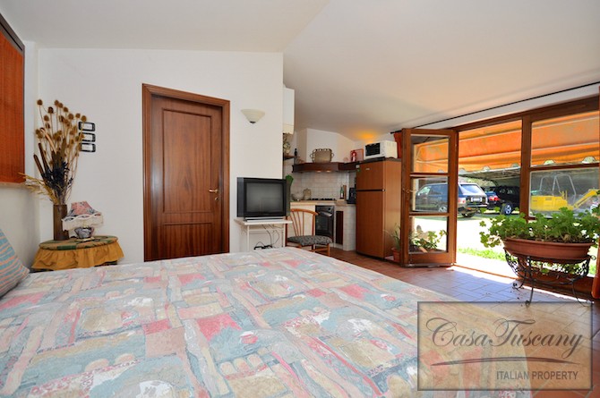 Apartment 2: Studio with bed and kitchen, bathroom.