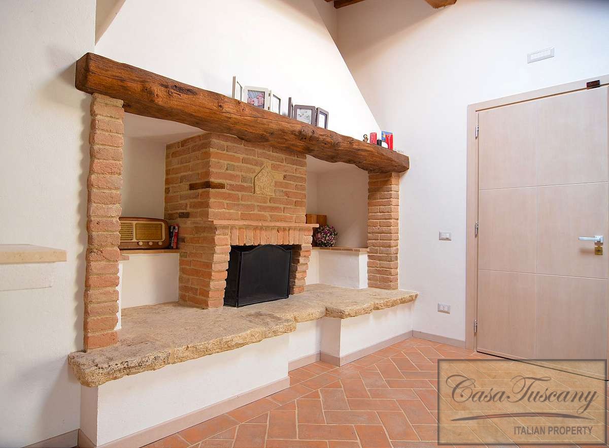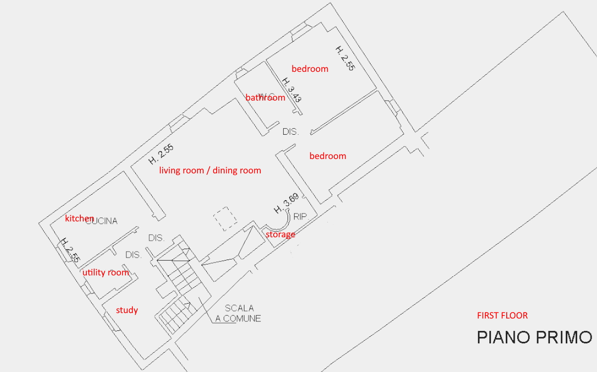 First floor: Large living / dining room with typical Tuscan fireplace, 2 bedrooms, a study (or small single bedroom), a bathroom/laundry room, a storage room, a kitchen and 2 hallways. No private garden.
