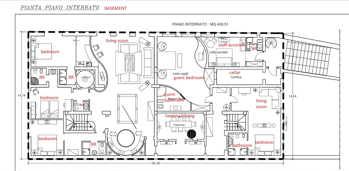 Basement of approx. 400 sqm: Living room, tavern, 6 bedrooms, billiard room, 6 bathrooms, cellar.