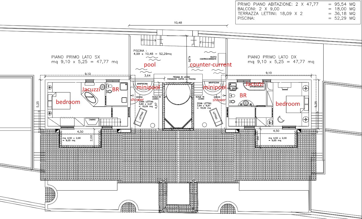 First Floor of approx. 95 sqm with balconies of approx. 18 sqm + terrace with beds of approx. 36 sqm: 2 bedrooms with fireplaces and access to the balconies, 2 bathrooms, one with a whirlpool.