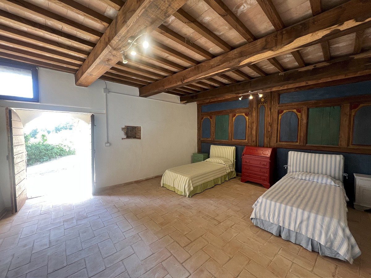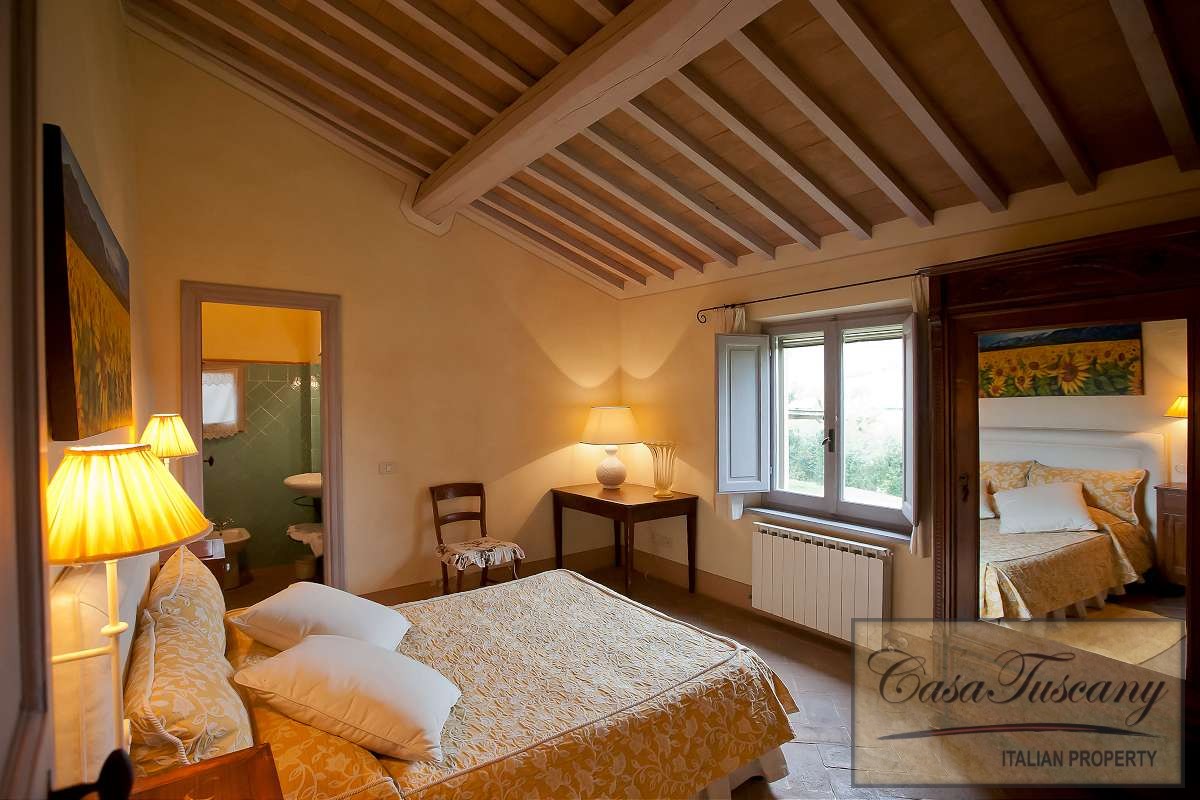 The property features all the characteristics of Tuscan style, such as exposed wooden beams, terracotta floors and a stone and brick exterior.