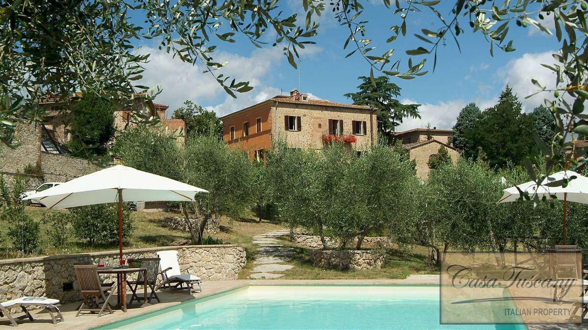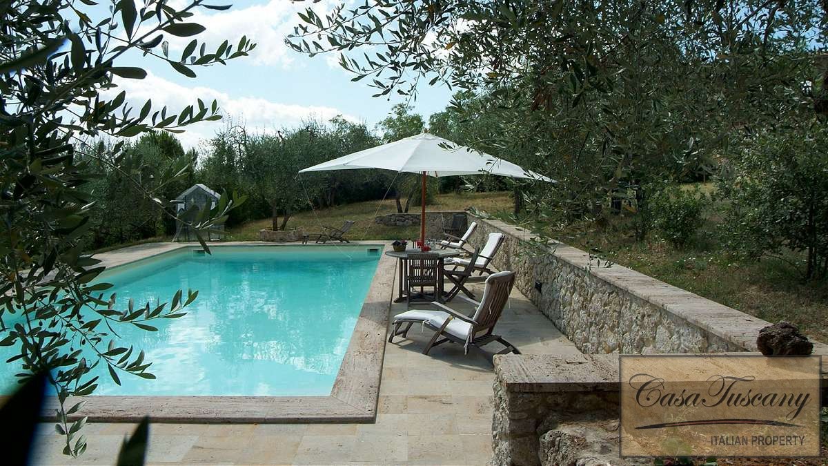 Inside the garden, there is also a fenced swimming pool surrounded by Tuscan travertine paving and olive trees, with an outdoor shower.