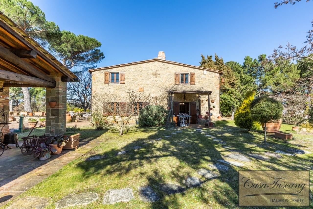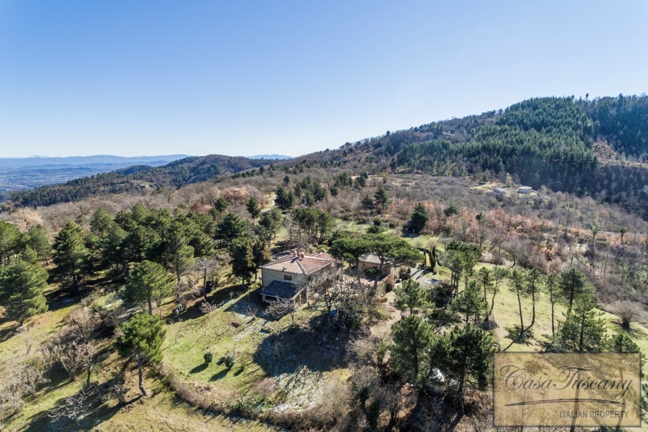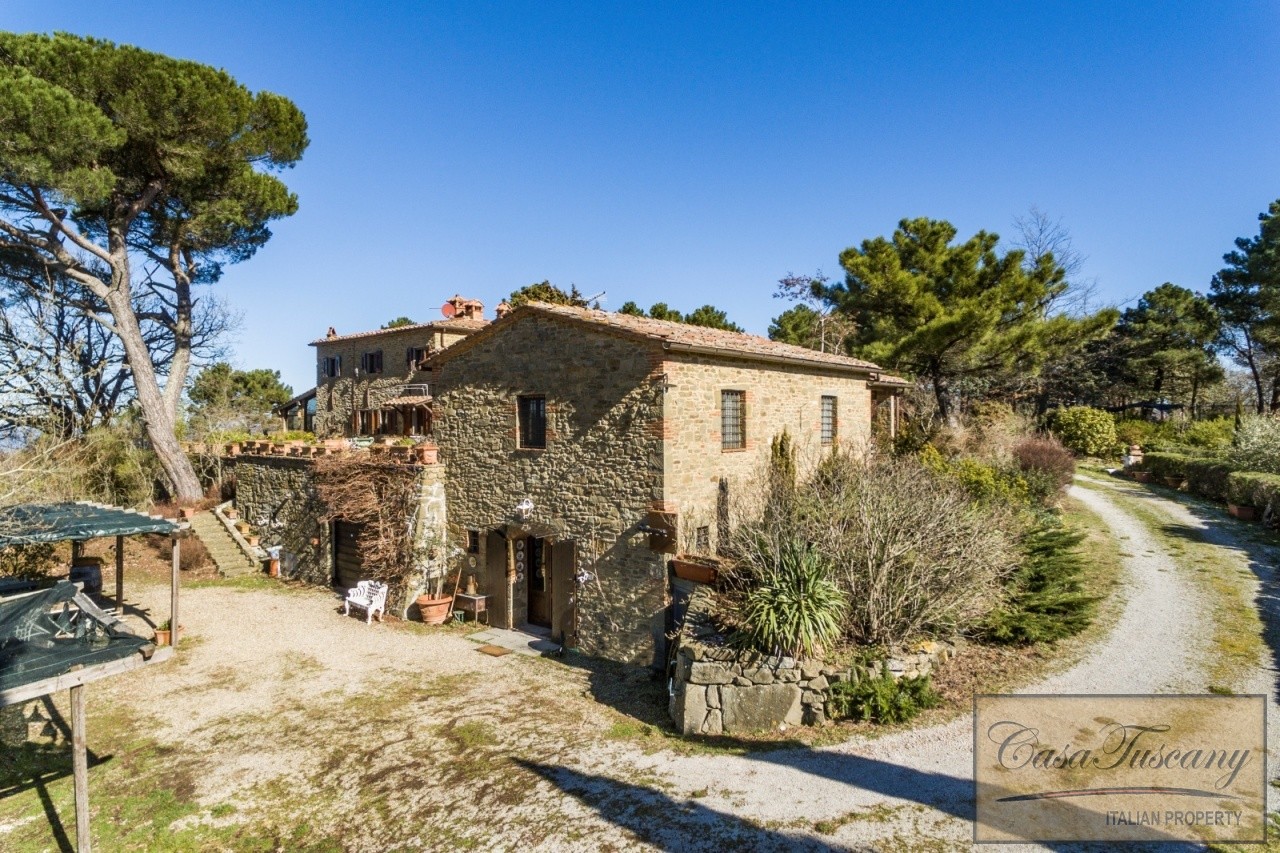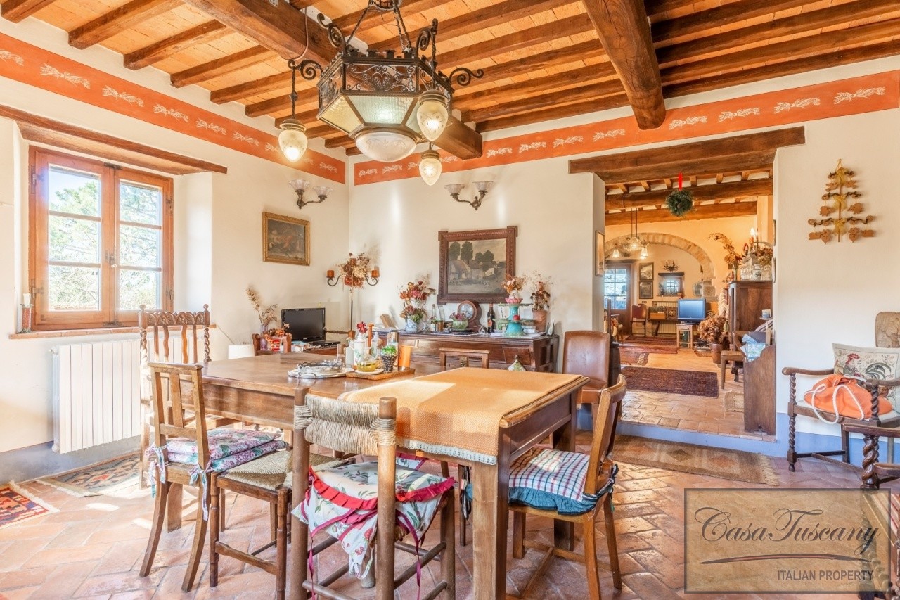 Hilltop farmhouse with an annex and 8 hectares of land, swimming pool, olive grove, woods and magnificent views of the Berardenga area.