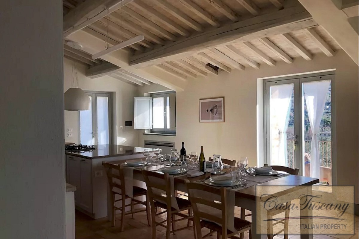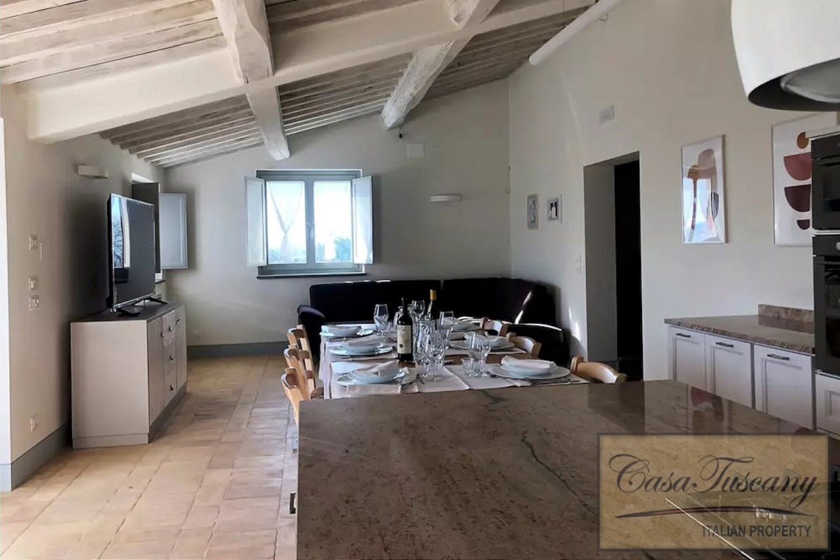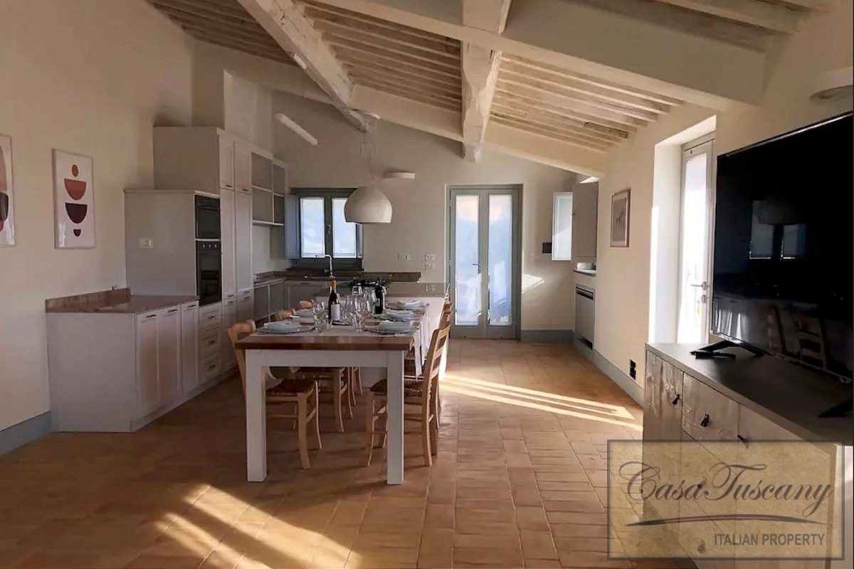 The light gray of all windows and internal doors, the natural colours used on the walls and the beamed ceilings together with the handmade terracotta floors create an elegant and refined atmosphere in harmony with the rural and natural context of this precious corner of Tuscany.