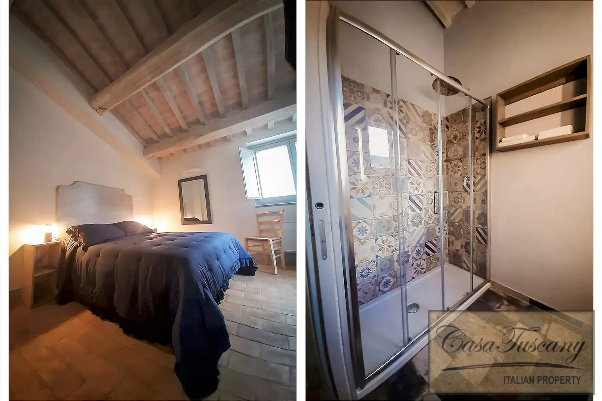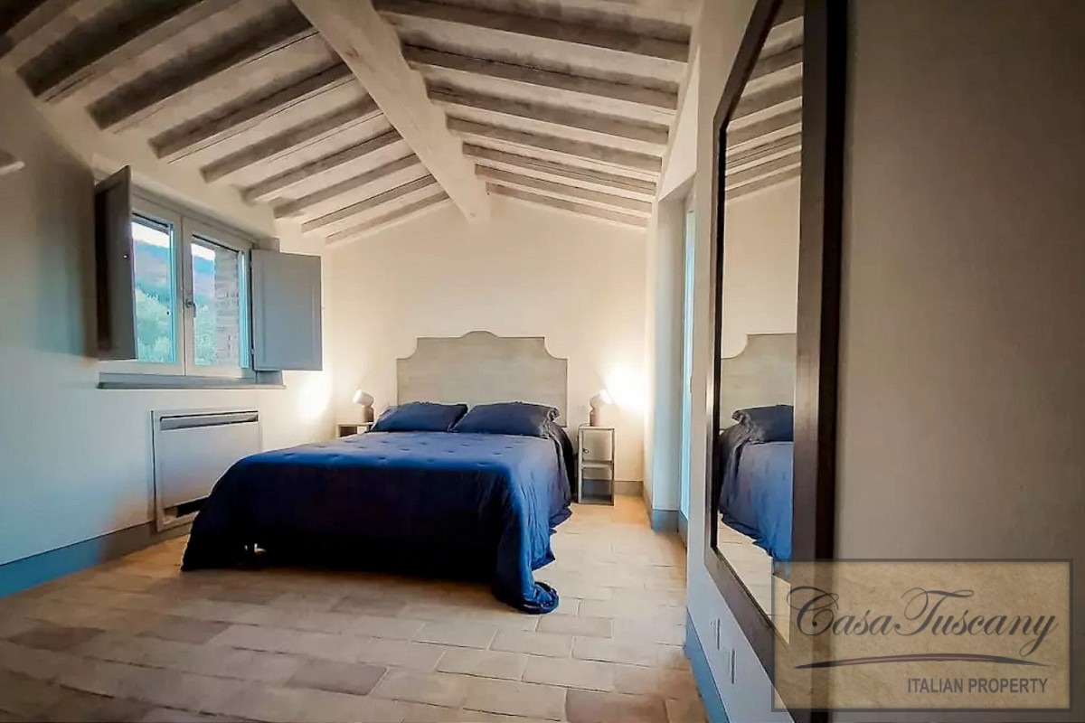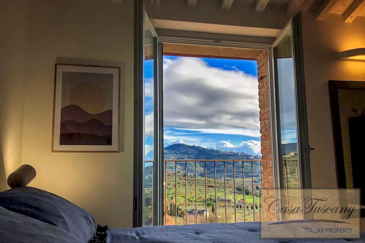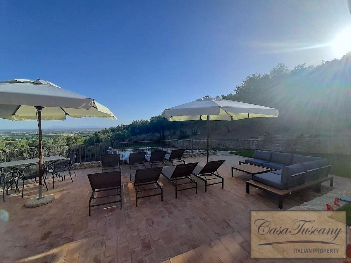 Great attention has been dedicated to the surrounding garden creating a magnificent outdoor living area built on various levels with high-quality features and overlooking the splendid Cortona landscape: hand-made terracotta paved sun terrace with a dining area, sunbathing area and barbecue area and a stone staircase leading to a travertine swimming pool with a stone cascade.