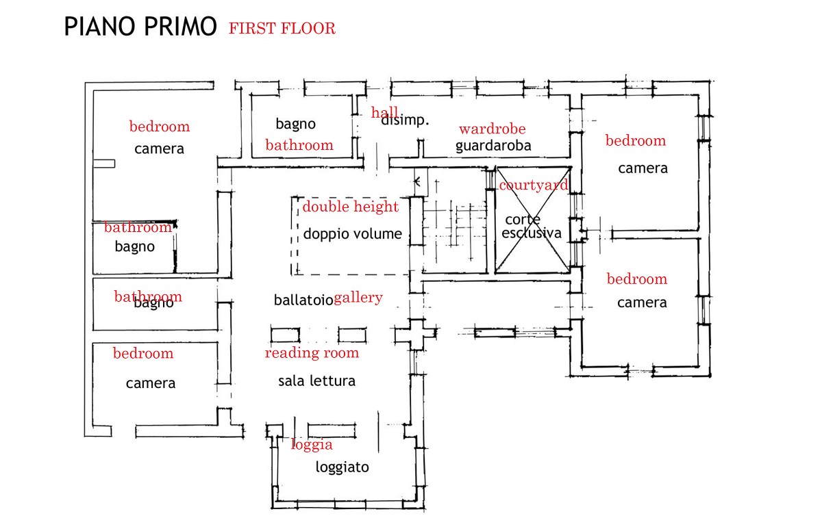 The ancient loggias on both the first and ground floors are designed as study spaces, reading room, library and creativity rooms. Large arched windows and plenty of light are protagonists in every room, offering wonderful glimpses of the garden and panorama.