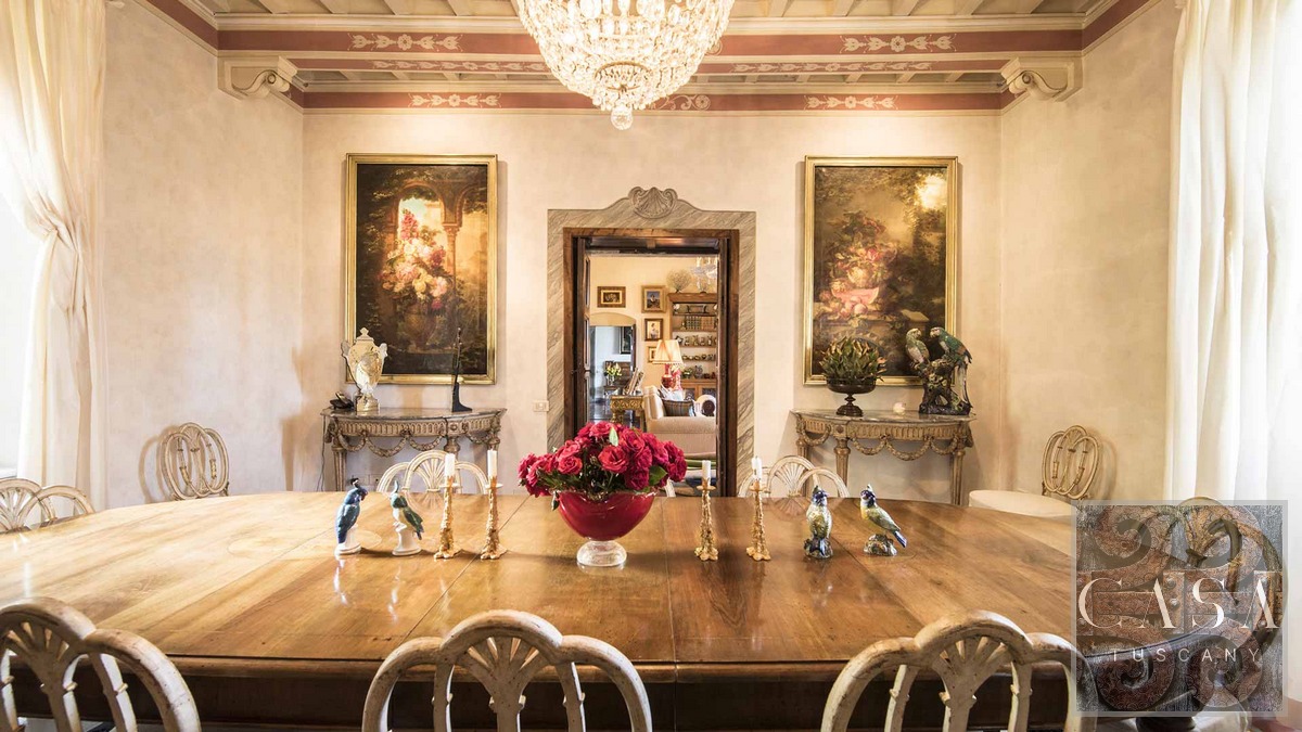 The main villa, measuring just under 1,100 square metres, has numerous large living, dining and reception rooms and contains many original architectural features.