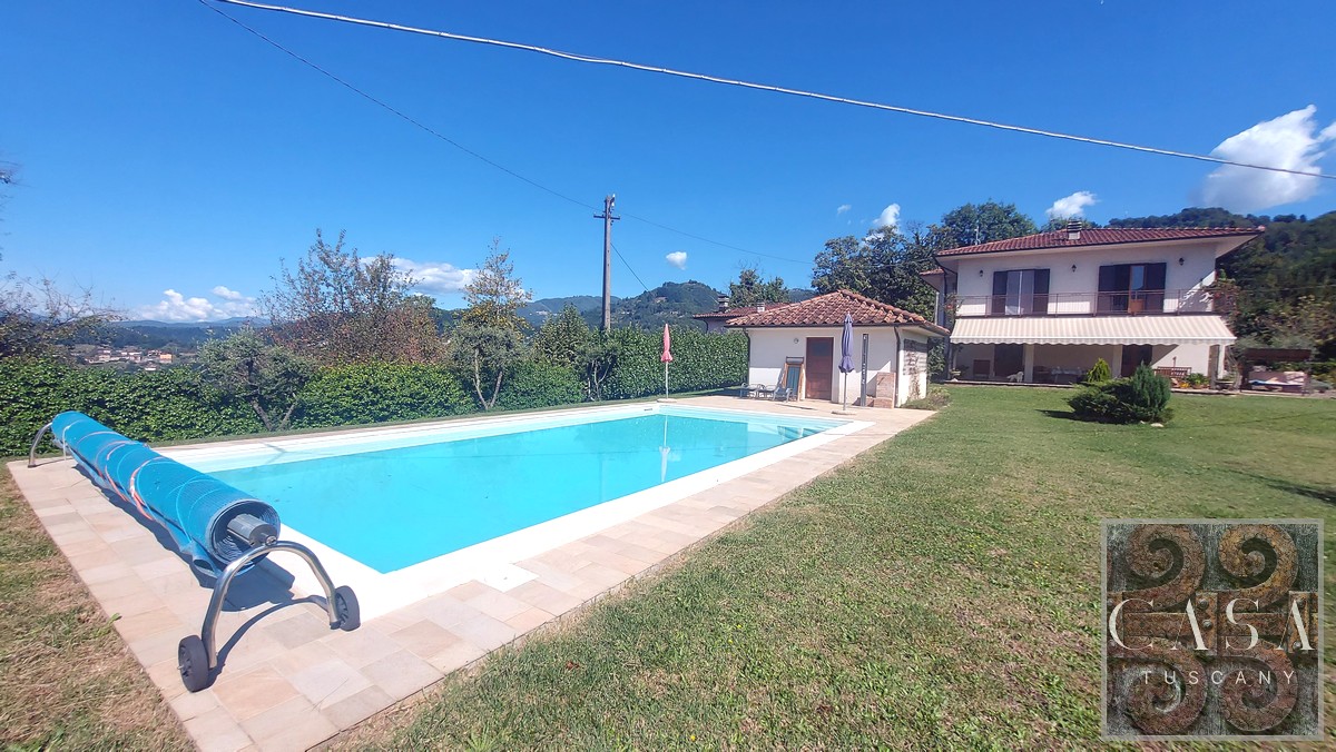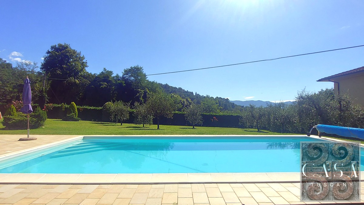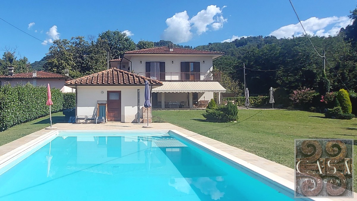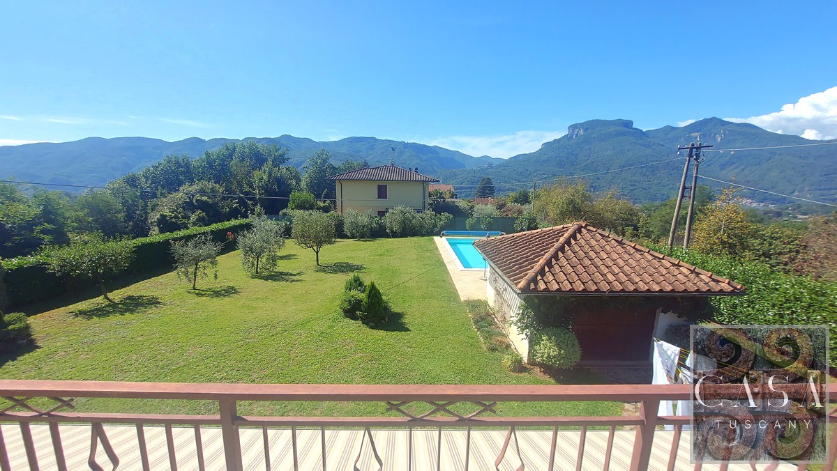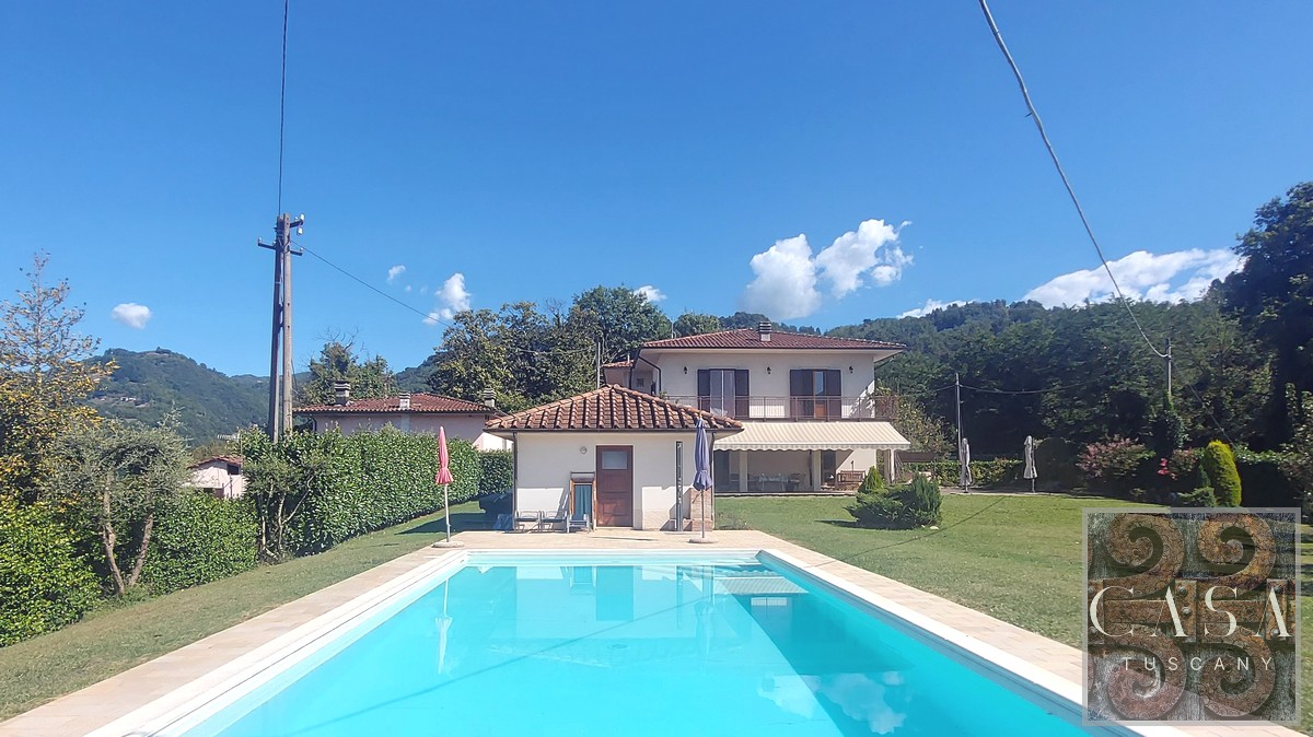 Villa for sale with pool and large garden, located near Piano di Coreglia in the Lucca province of Tuscany, in a beautiful position with views and close to all essential services.