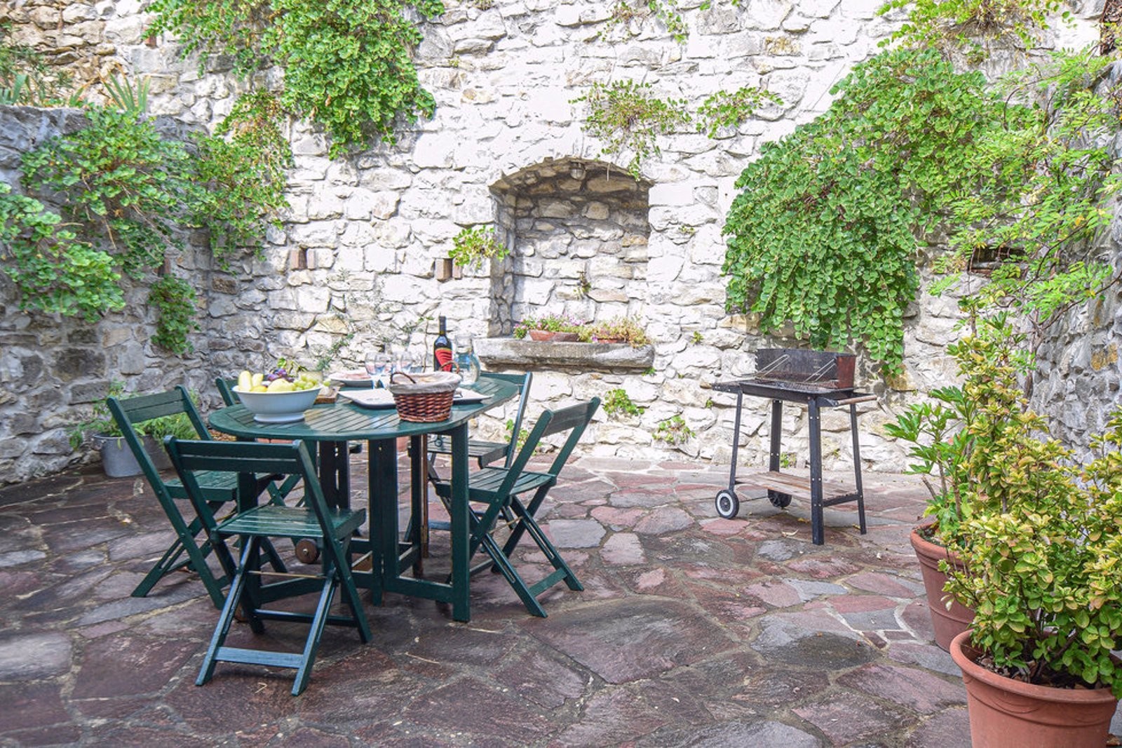 From the large garden there is access to the remaining land which consists of terraces with olive and fruit trees.